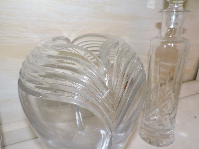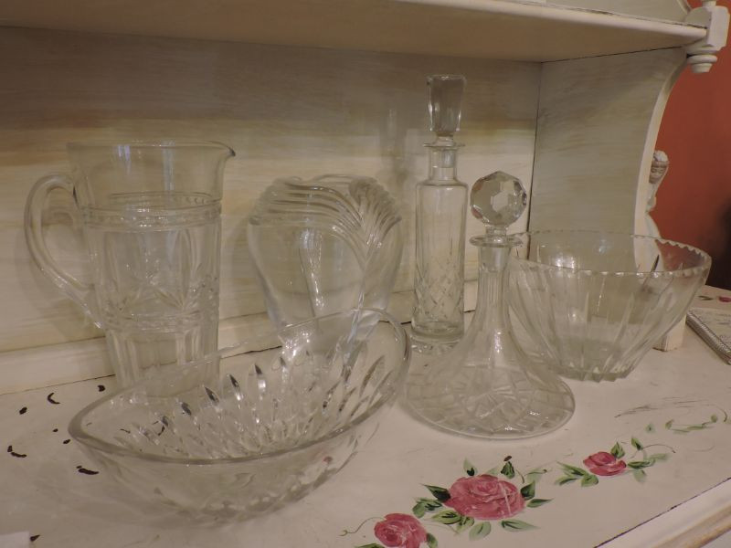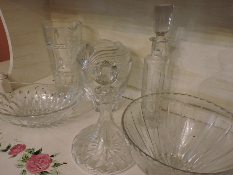 Collection of six cut-glass bowls, decanters, and vases. One decanter has a slight chip on the rim.