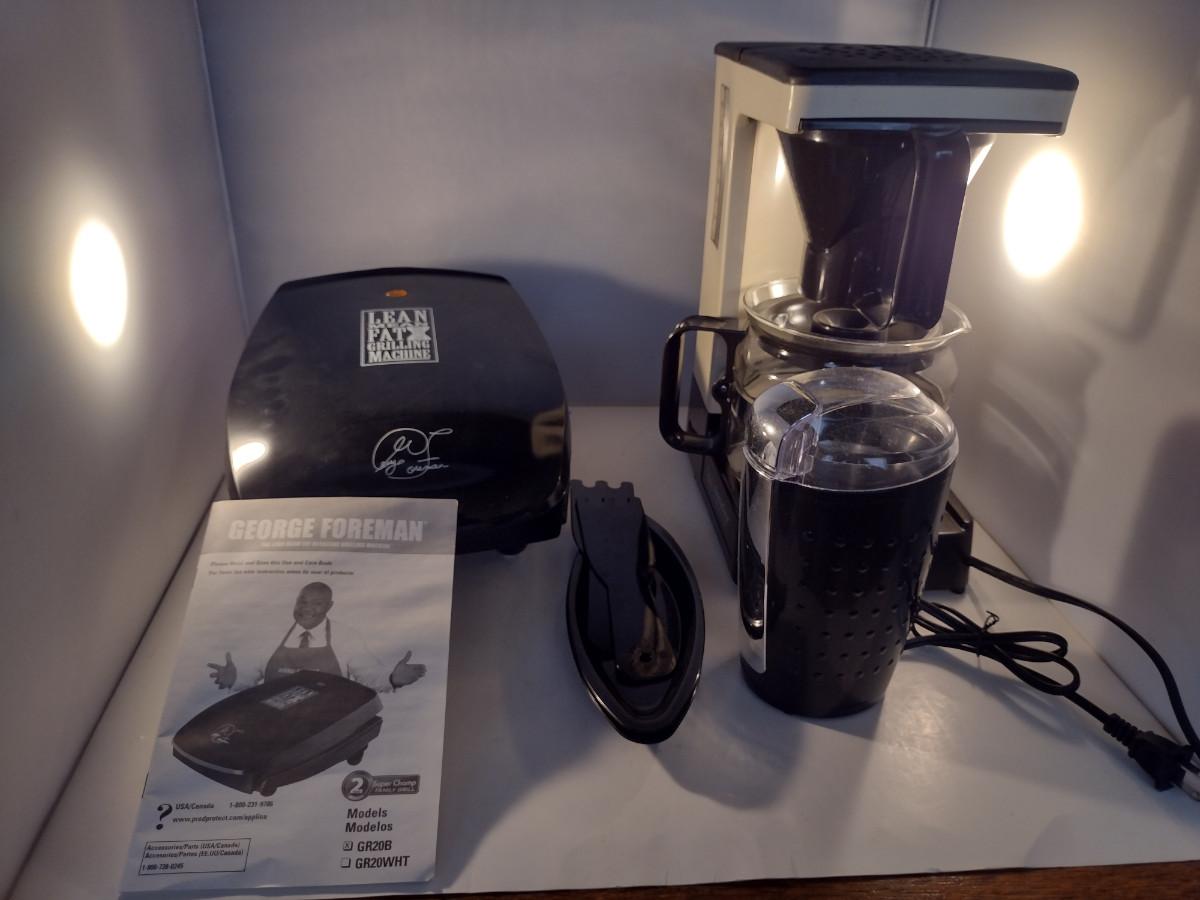 Collection of Small Appliances. George Foreman grill, coffee grinder, Melitta coffee maker.