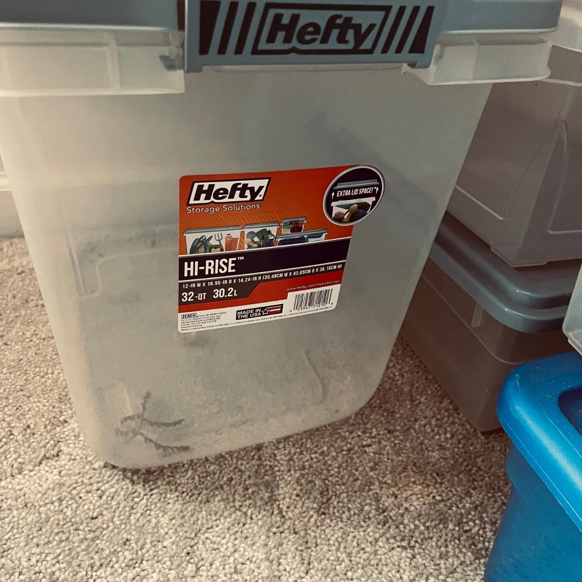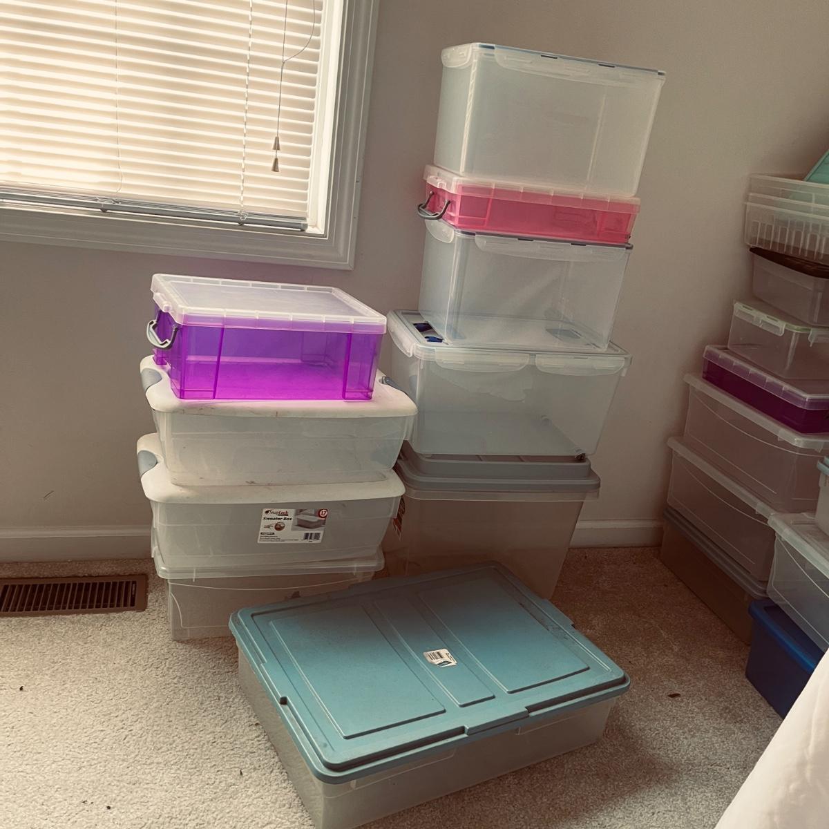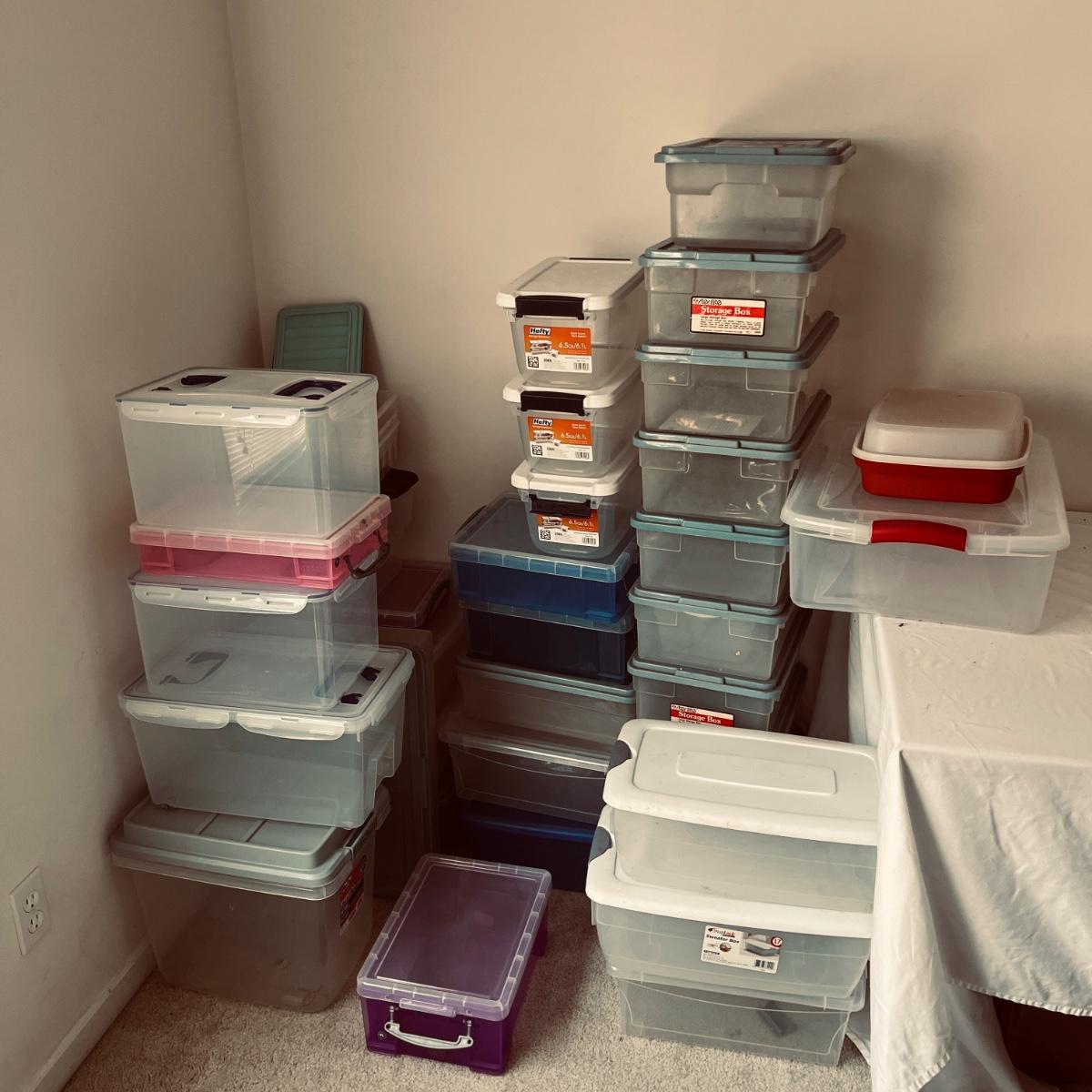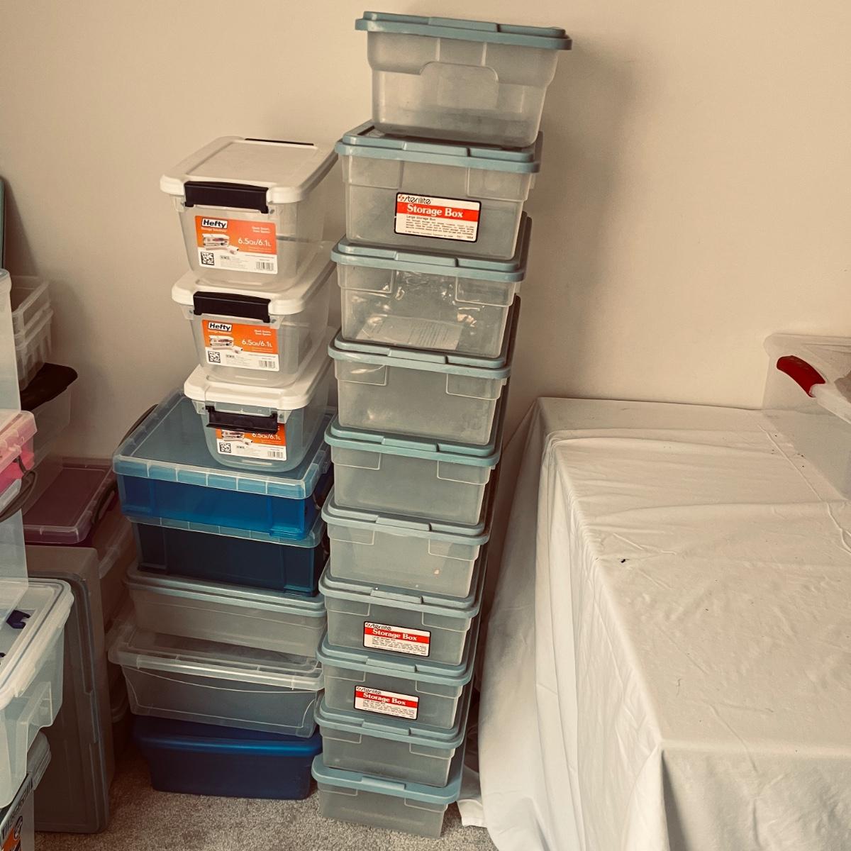 Lot contains over 35 bins in a variety of sizes and shapes including brands Sterilite, Hefty, Snap Lock and more. Please see photos for inventory.