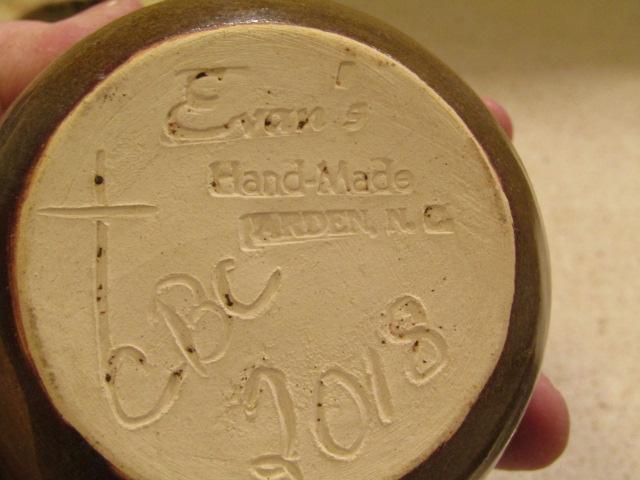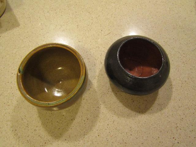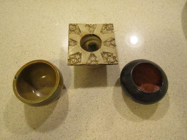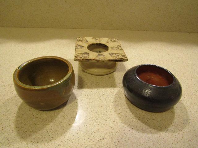 Collection of Small Pottery. Flower frog and two small bowls. Evans Pottery - Arden, NC. and Wardell Pottery NY. One is unmarked.