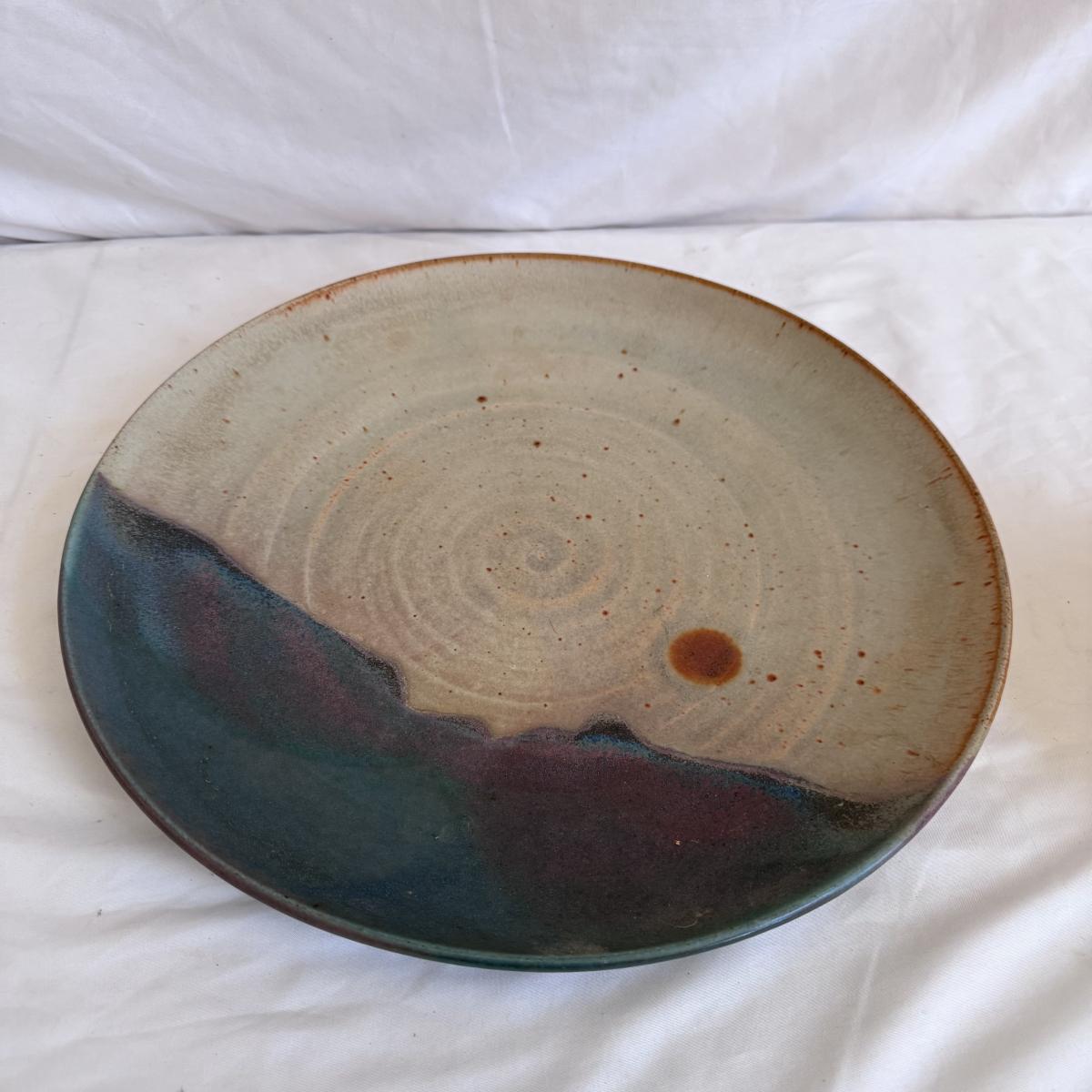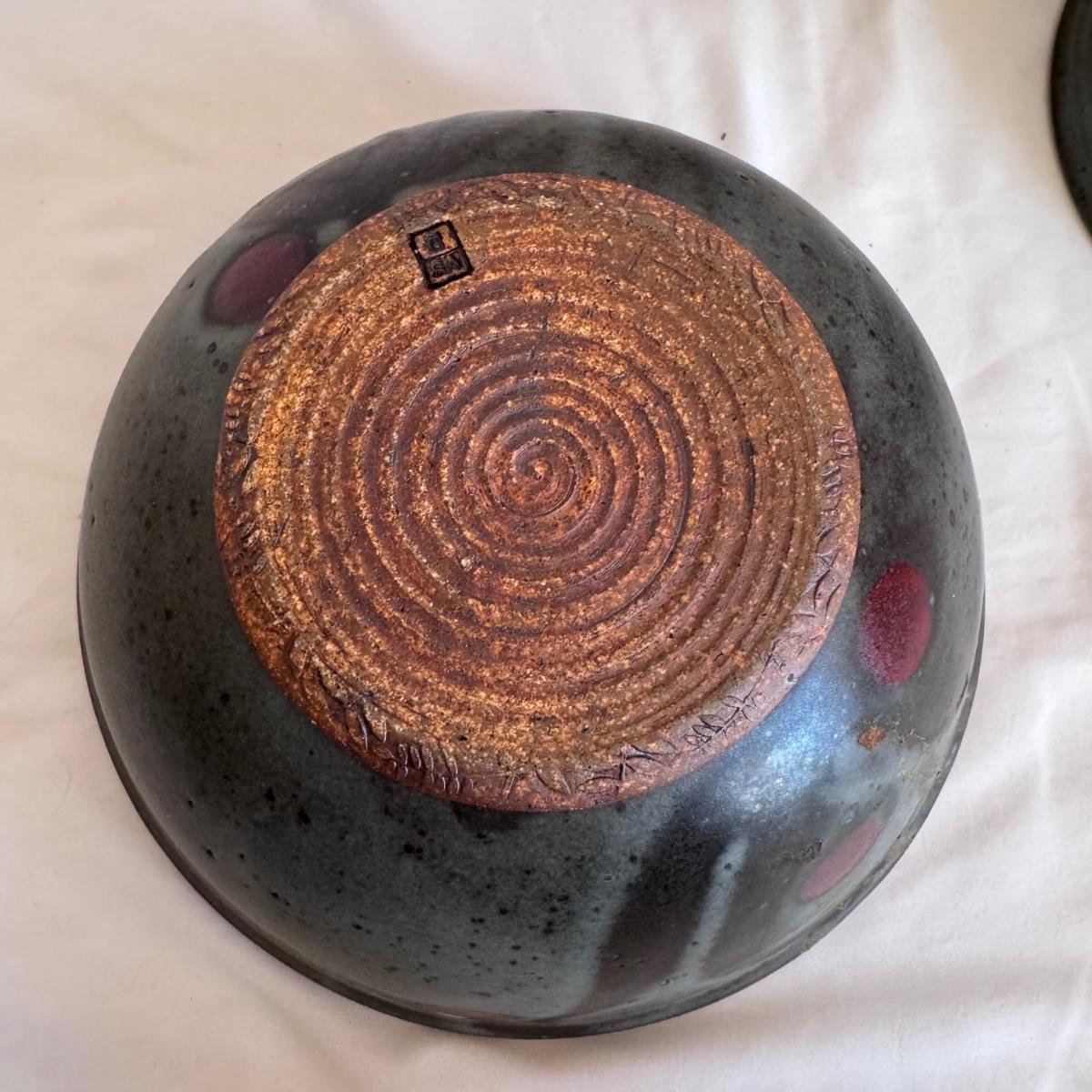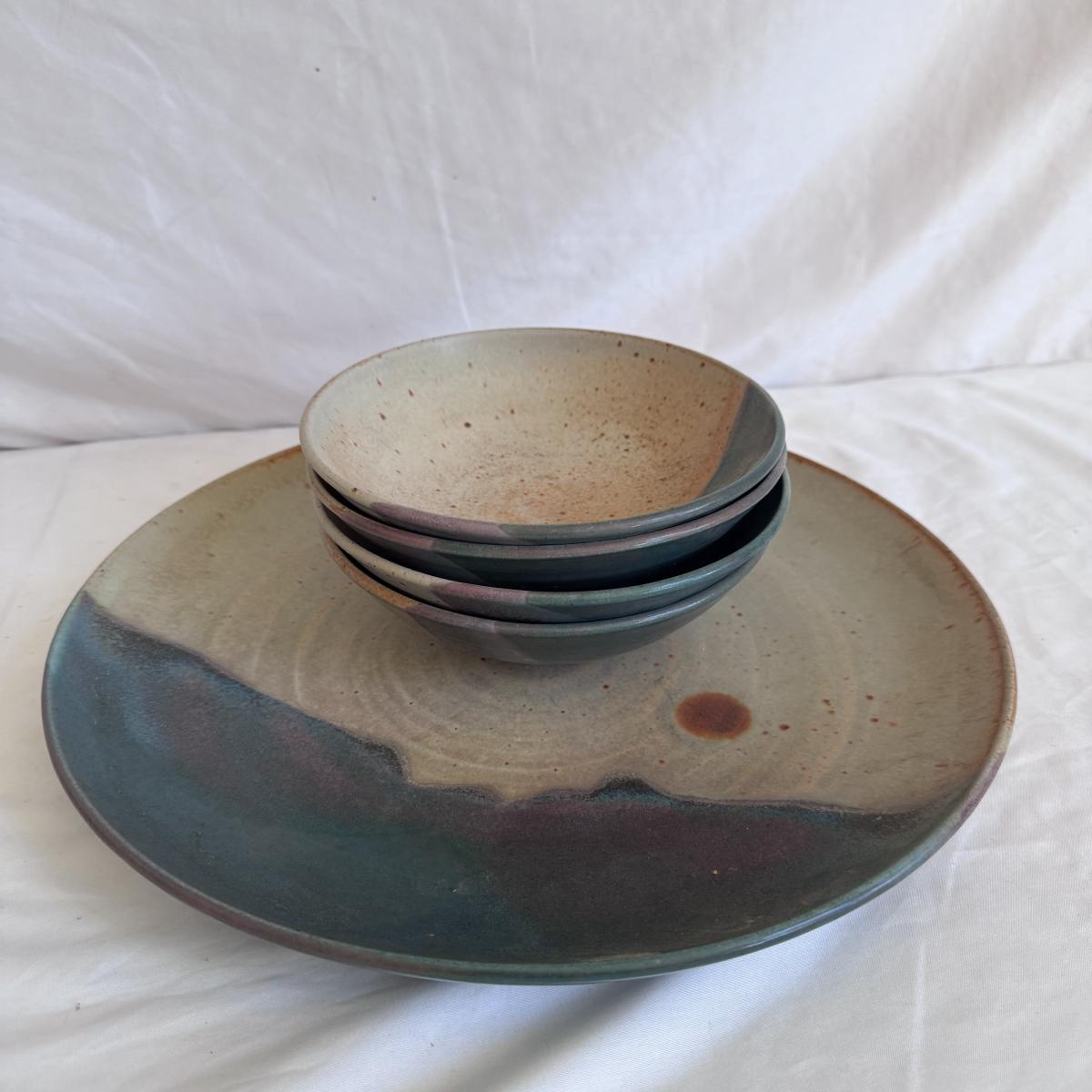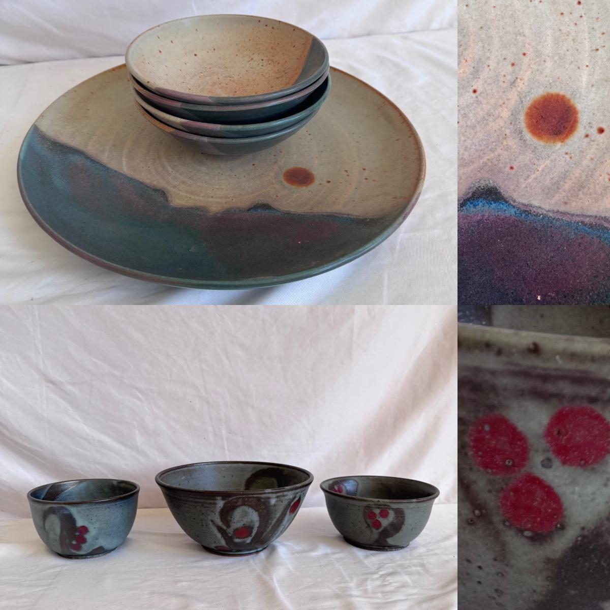 This lot includes a large serving dish with a mountain landscape, along with four bowls to match. It also includes three bowls of various sizes with an abstract landscape glaze. All pieces are made with speckled clay and have a matte finish. The largest item is the serving dish with the mountain scene that measures 13.95”D x 1.5”H. All items appear to be stamped on the bottom. Shipping available.
