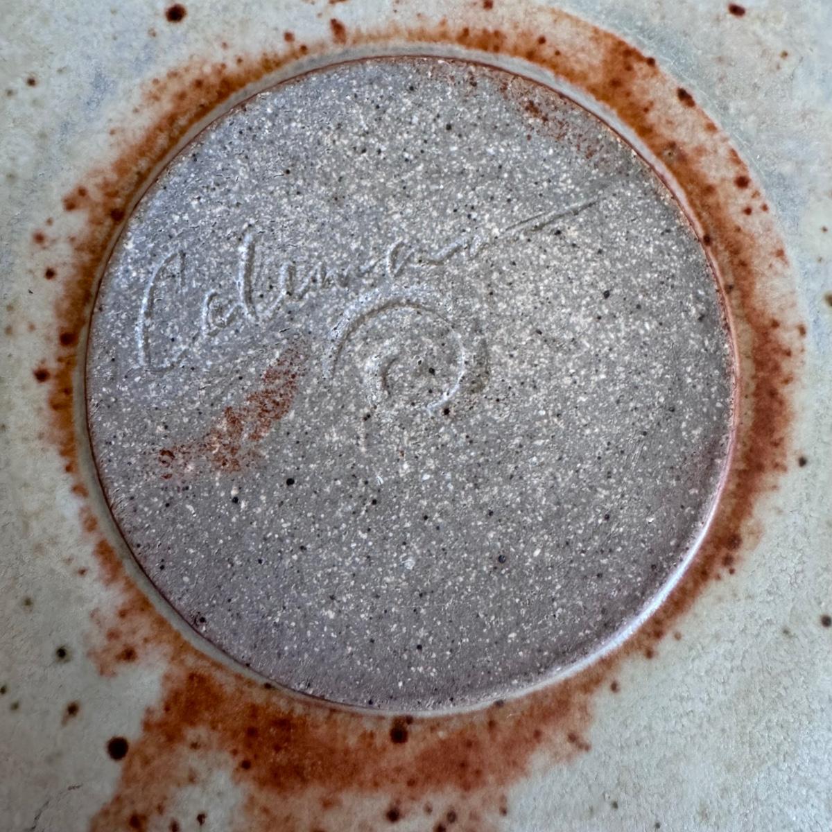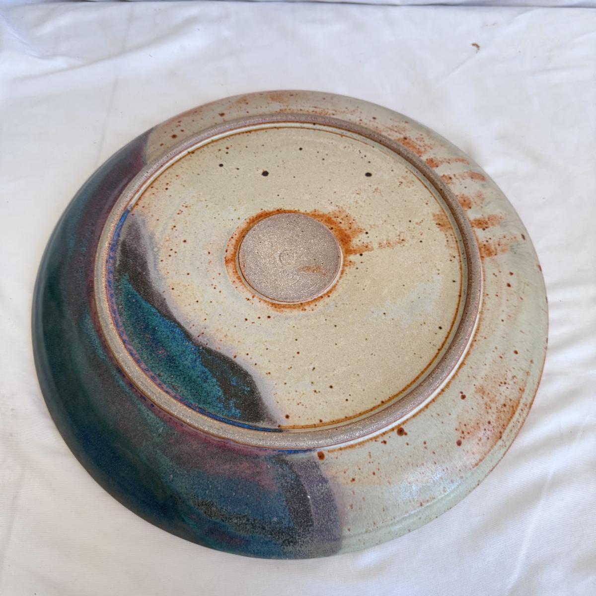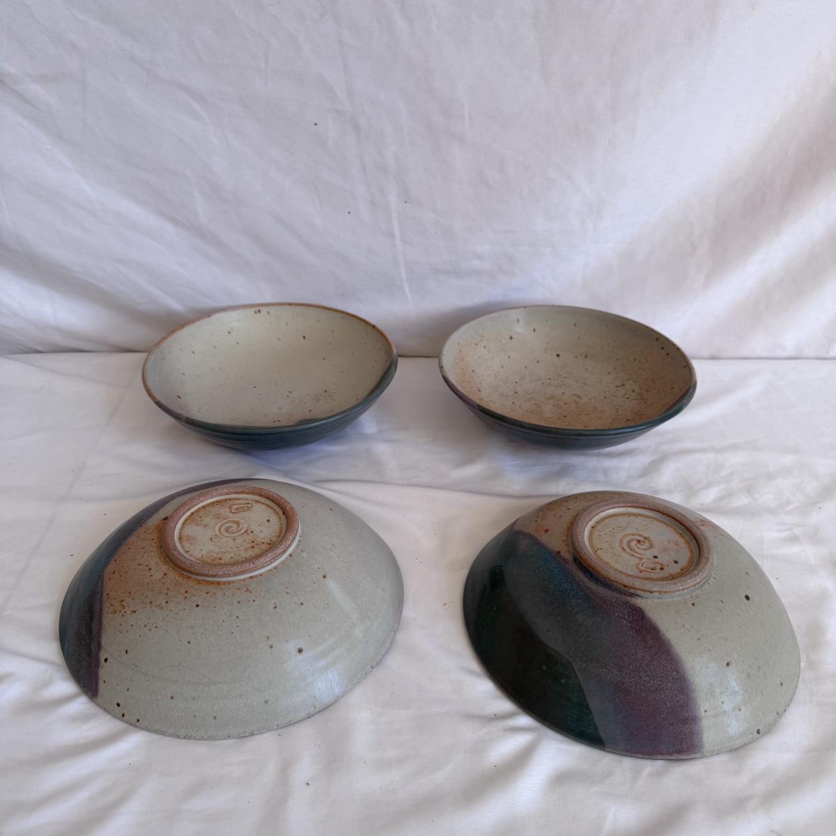 This lot includes a large serving dish with a mountain landscape, along with four bowls to match. It also includes three bowls of various sizes with an abstract landscape glaze. All pieces are made with speckled clay and have a matte finish. The largest item is the serving dish with the mountain scene that measures 13.95”D x 1.5”H. All items appear to be stamped on the bottom. Shipping available.