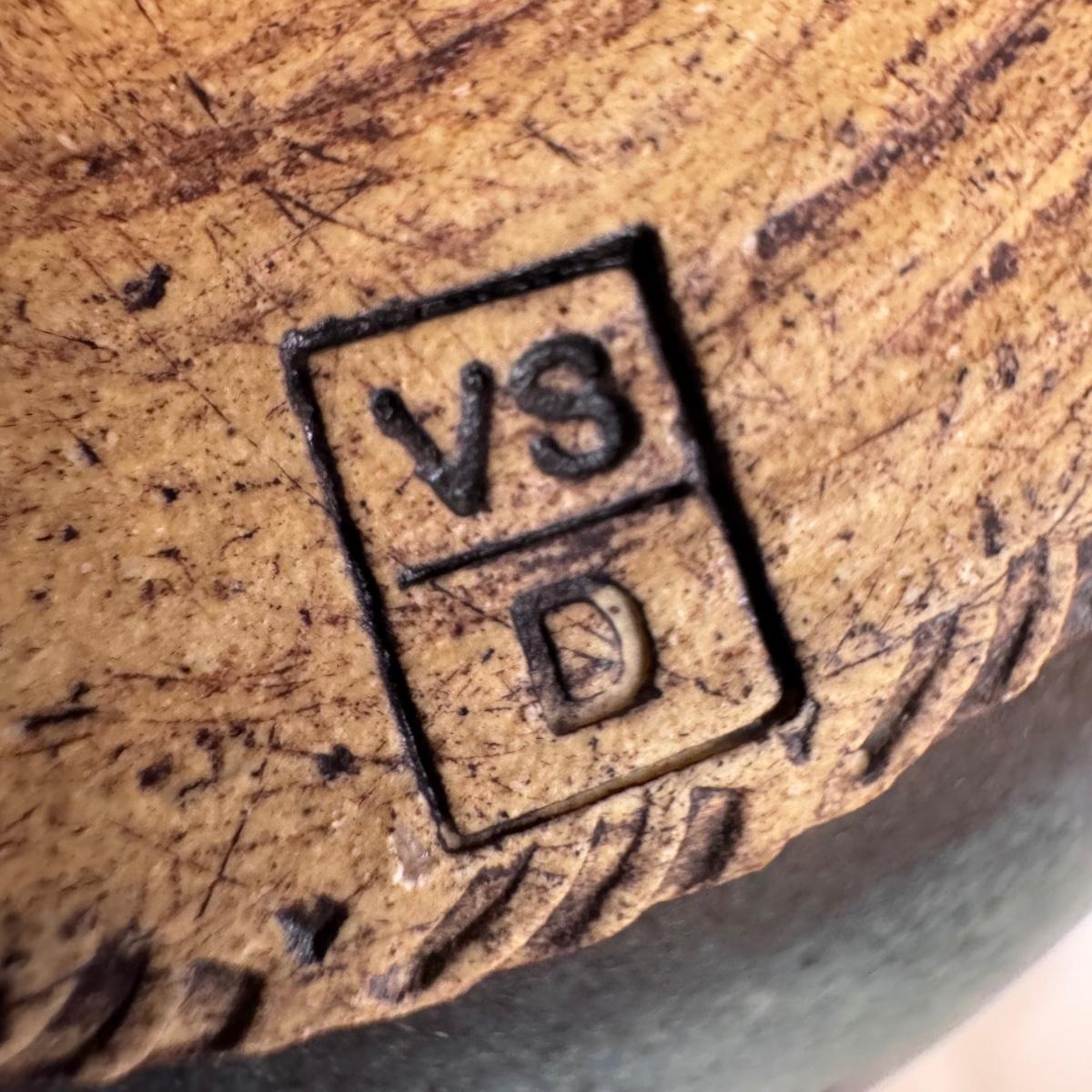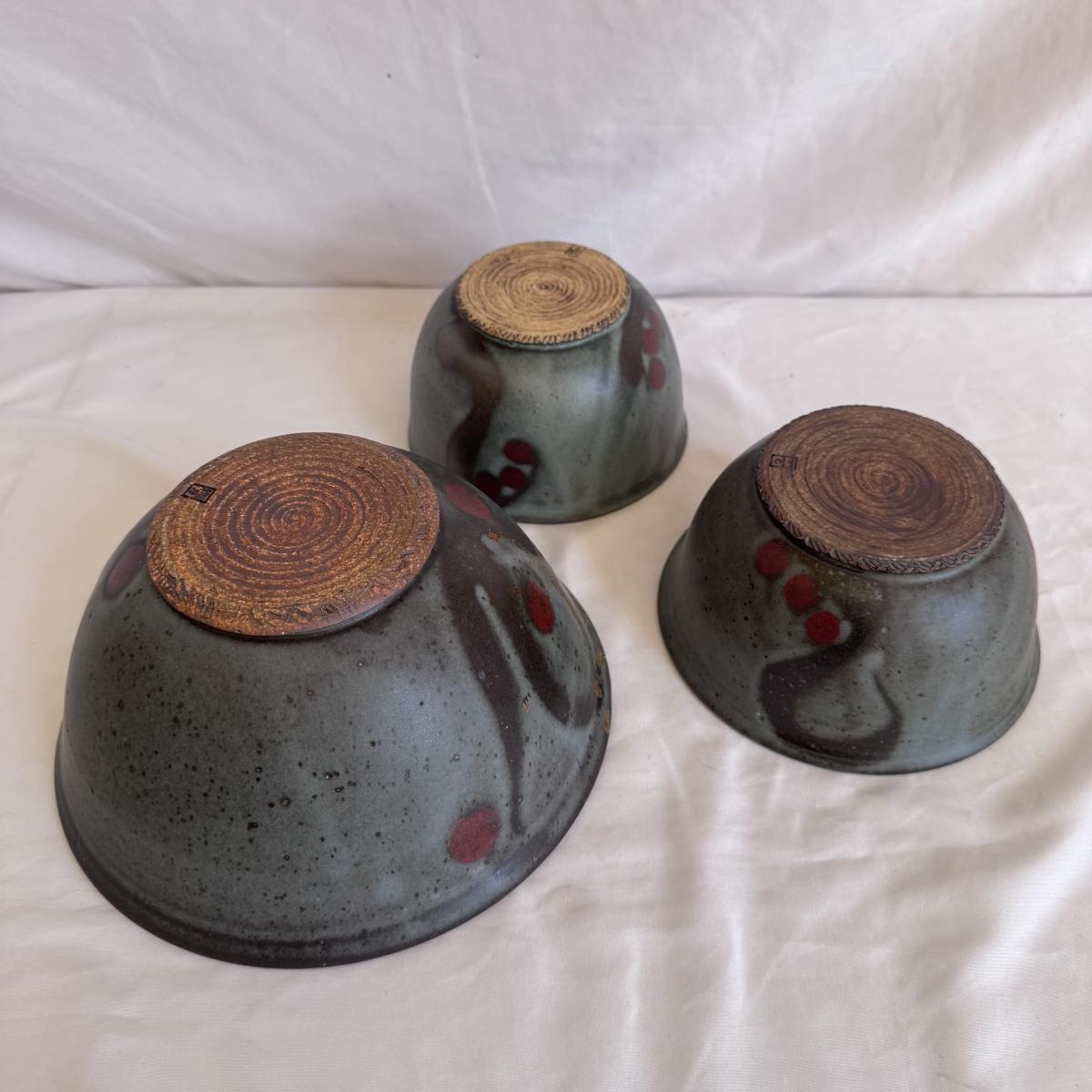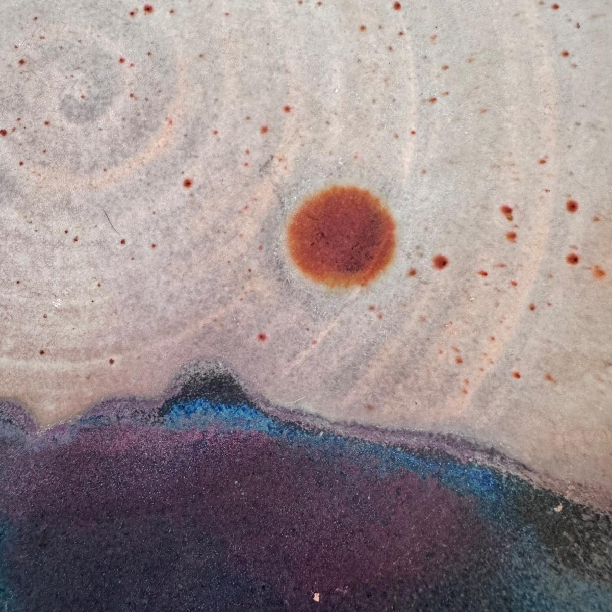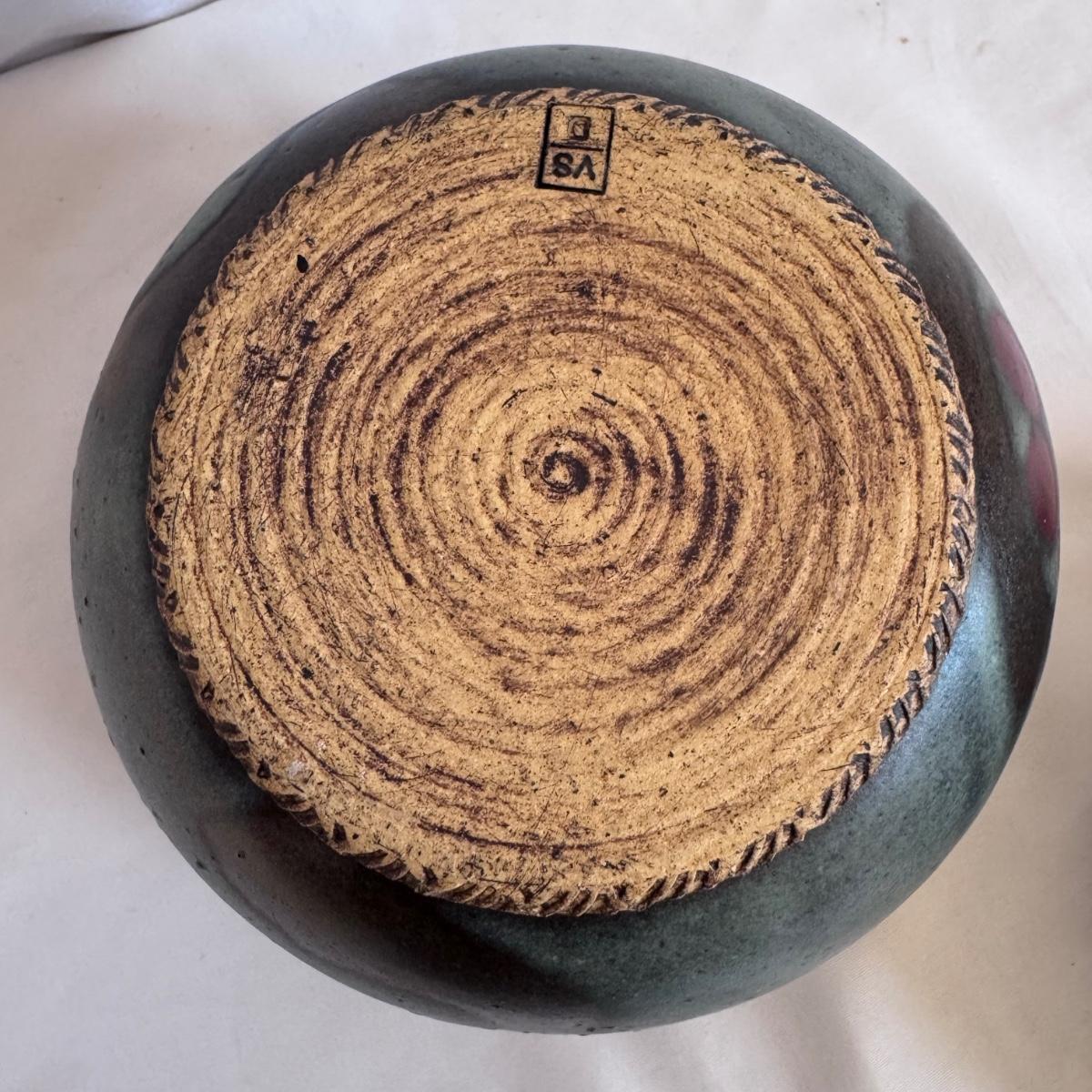 This lot includes a large serving dish with a mountain landscape, along with four bowls to match. It also includes three bowls of various sizes with an abstract landscape glaze. All pieces are made with speckled clay and have a matte finish. The largest item is the serving dish with the mountain scene that measures 13.95”D x 1.5”H. All items appear to be stamped on the bottom. Shipping available.