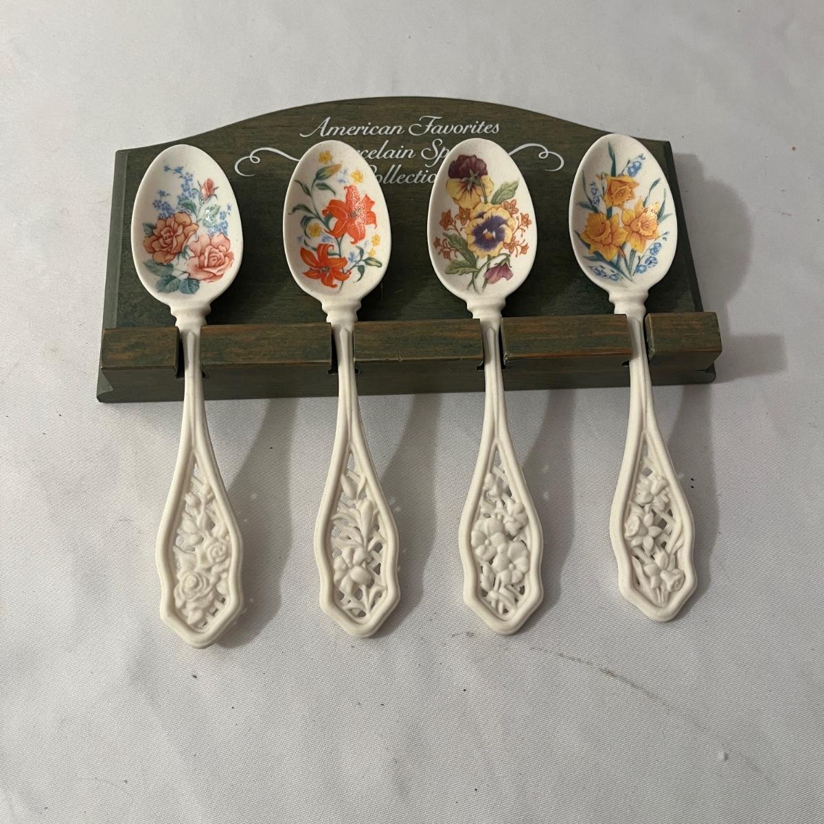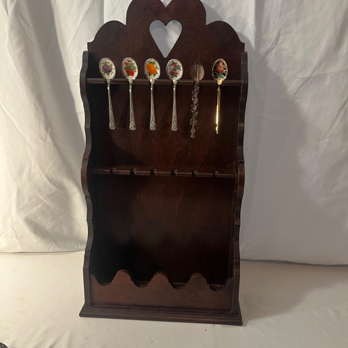 Lot includes a wooden spoon display rack, four porcelain spoons and over fifteen spoons of different styles and materials. Display Rack measures 4” x 12” x 23”H.