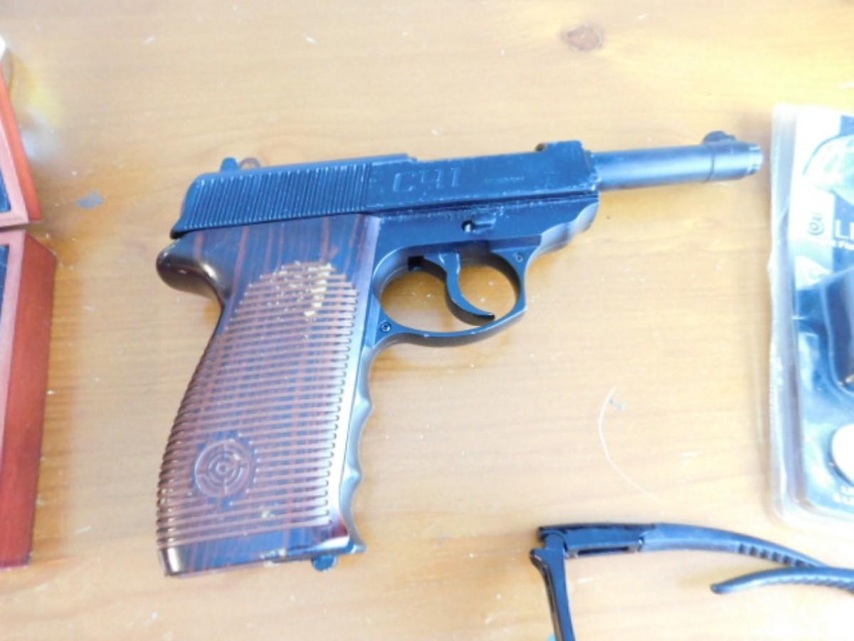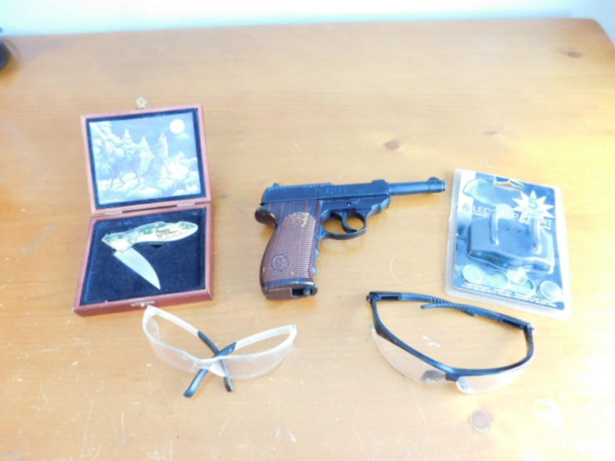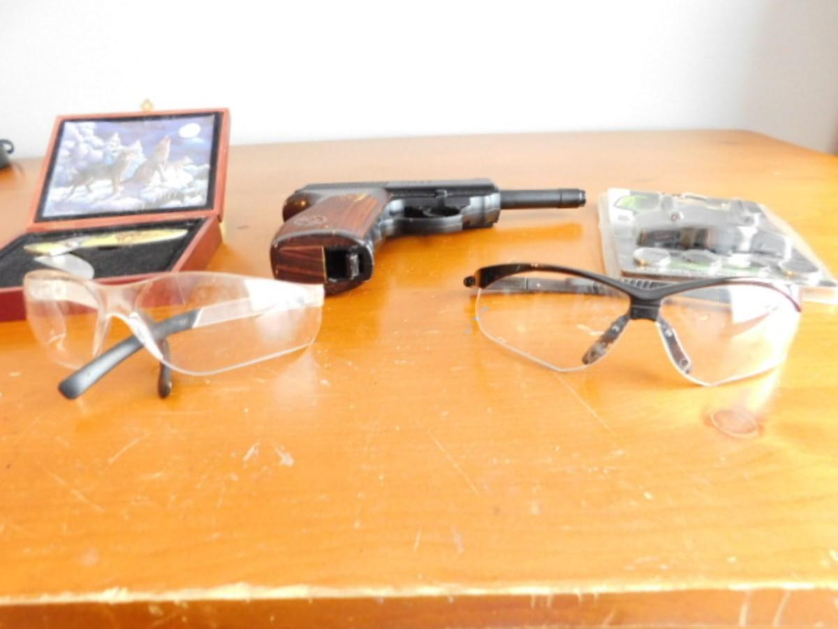 Collection of Sporting Goods includes Crossman Pellet Gun, Safety Glass, and Novelty Knife