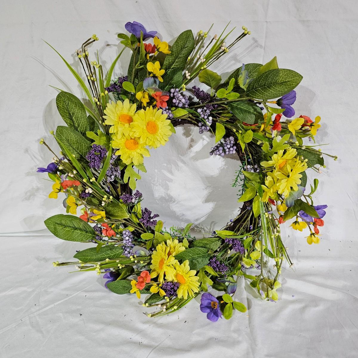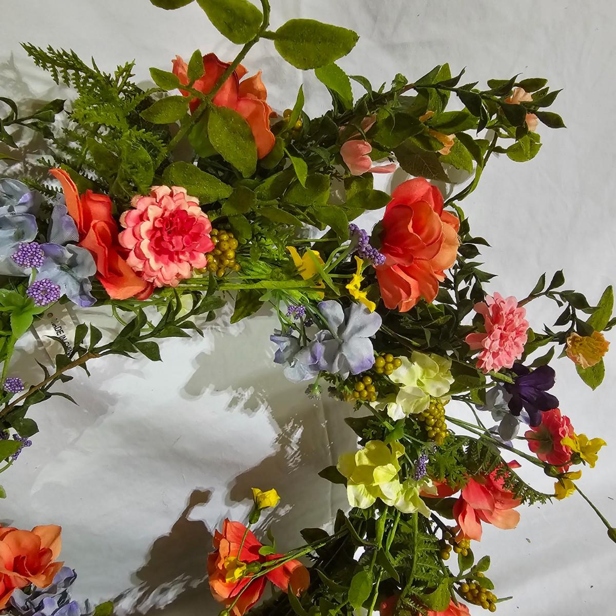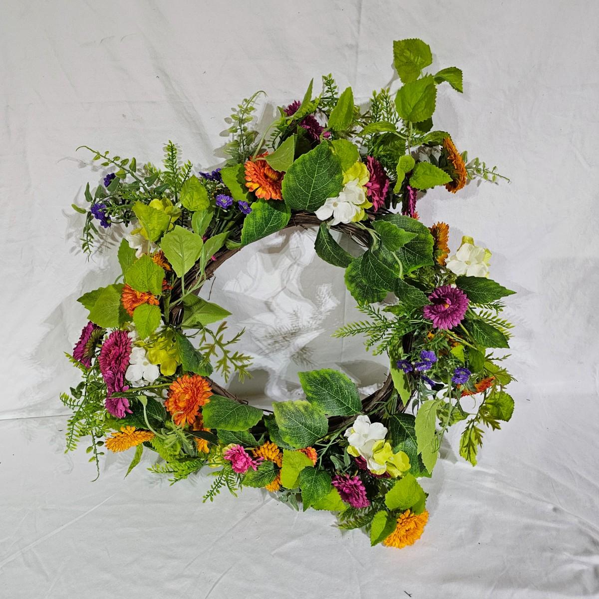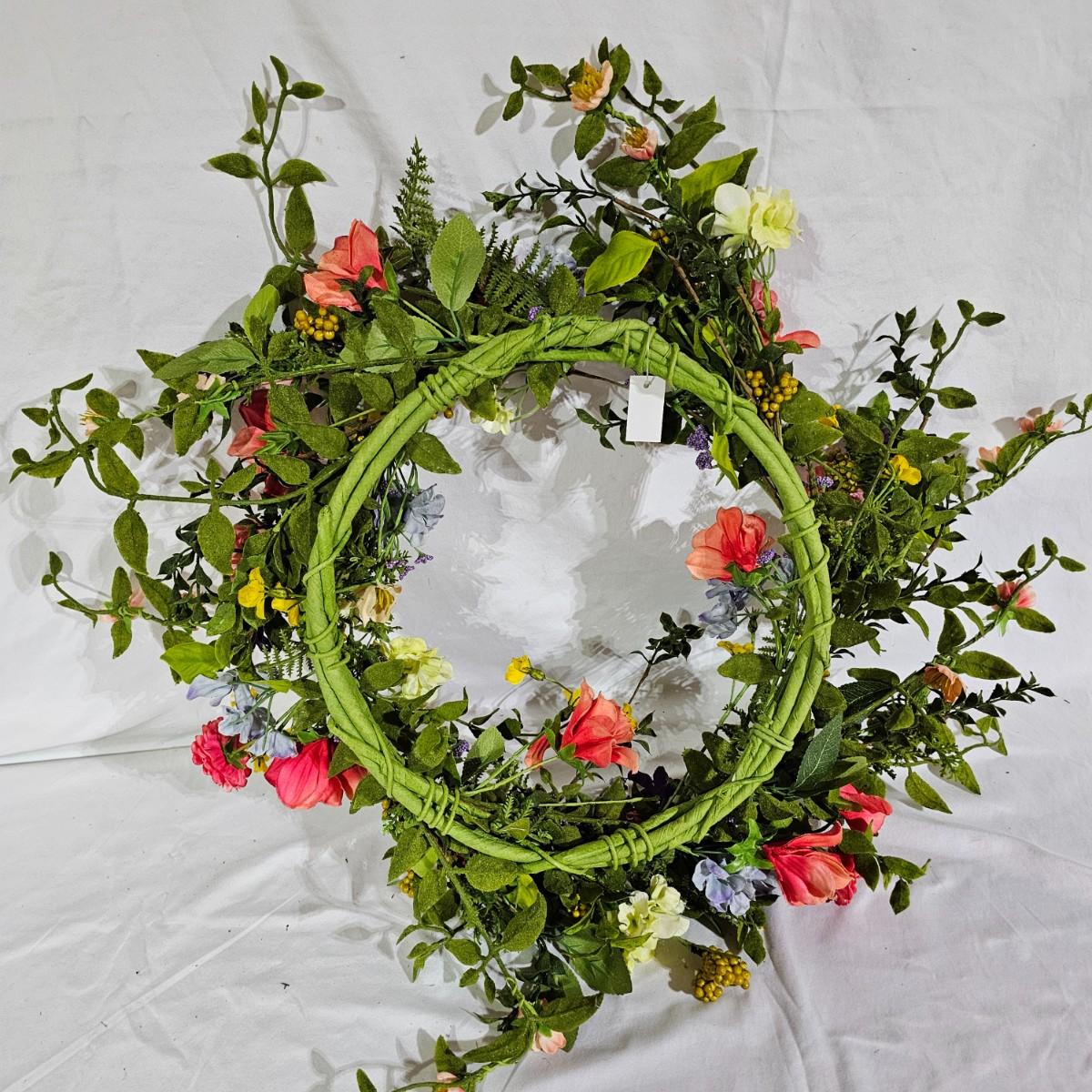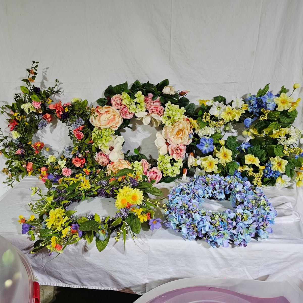 Fourteen artificial floral wreaths in a wide variety of colors and combinations. Daisies, peonies, roses, chrysanthemum and more. Wreaths range in size from 16"D to about 30"D. Nine storage boxes are included. See photos for details. Local pickup only.