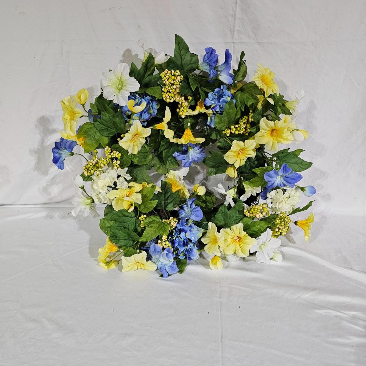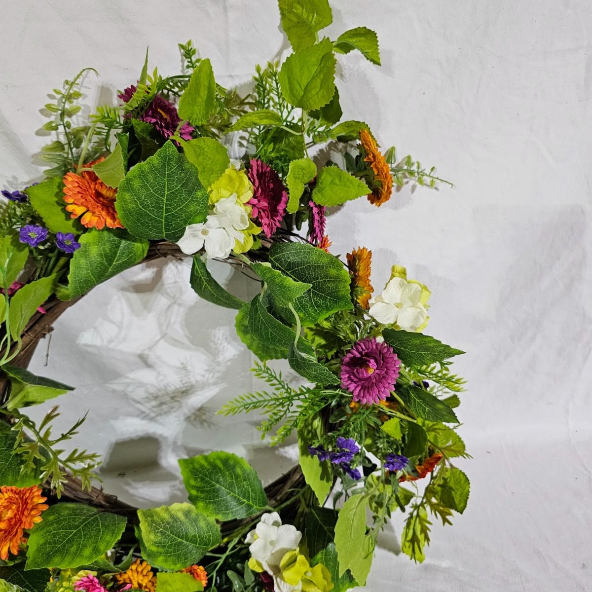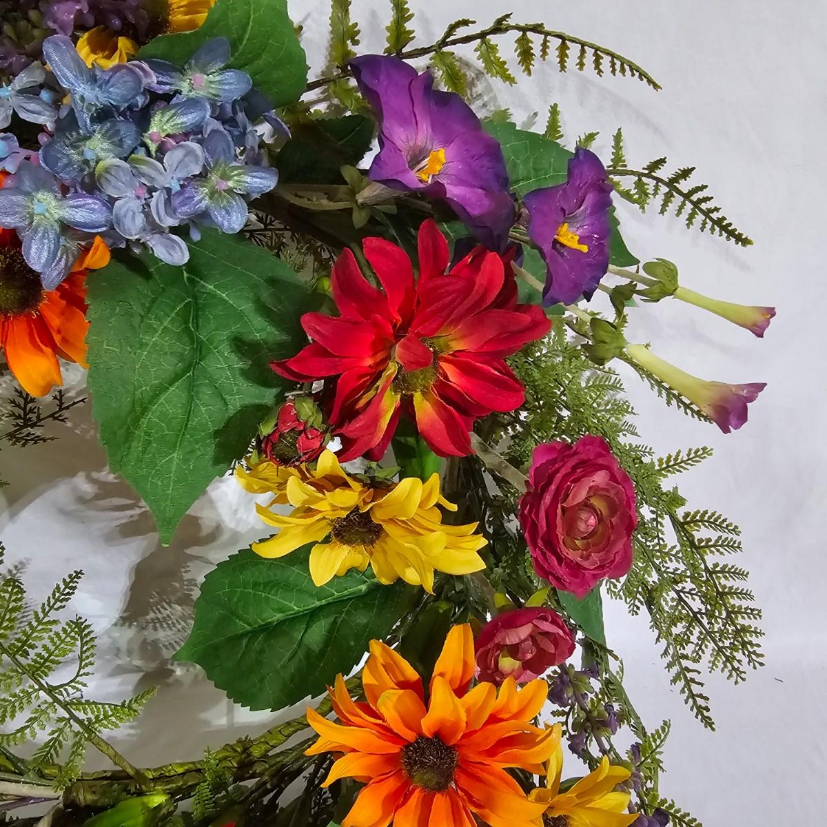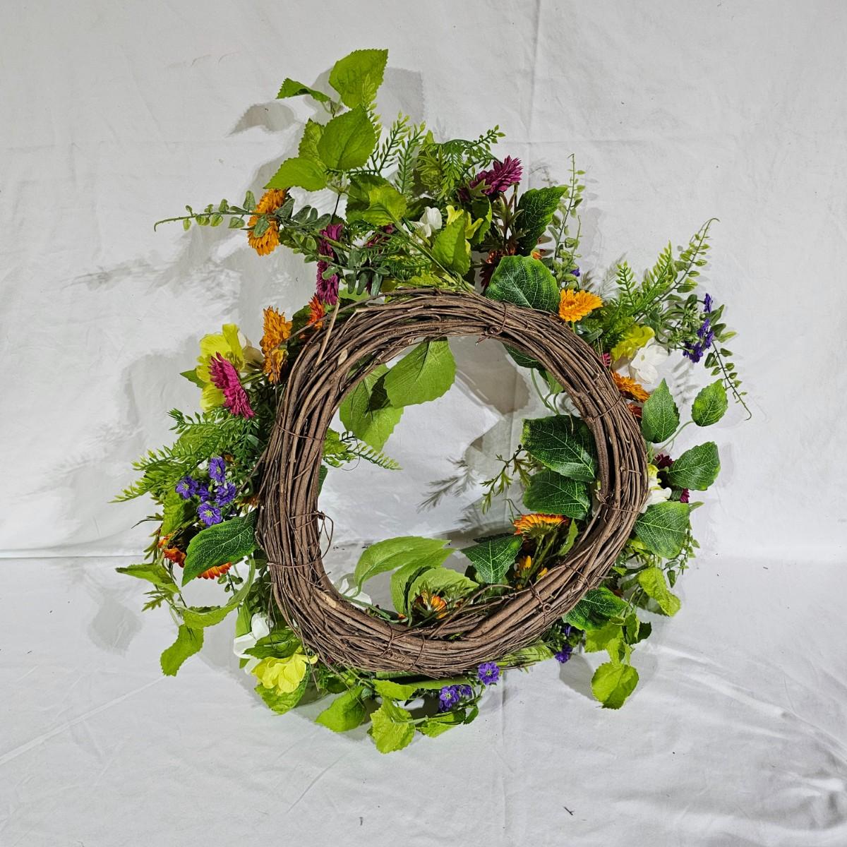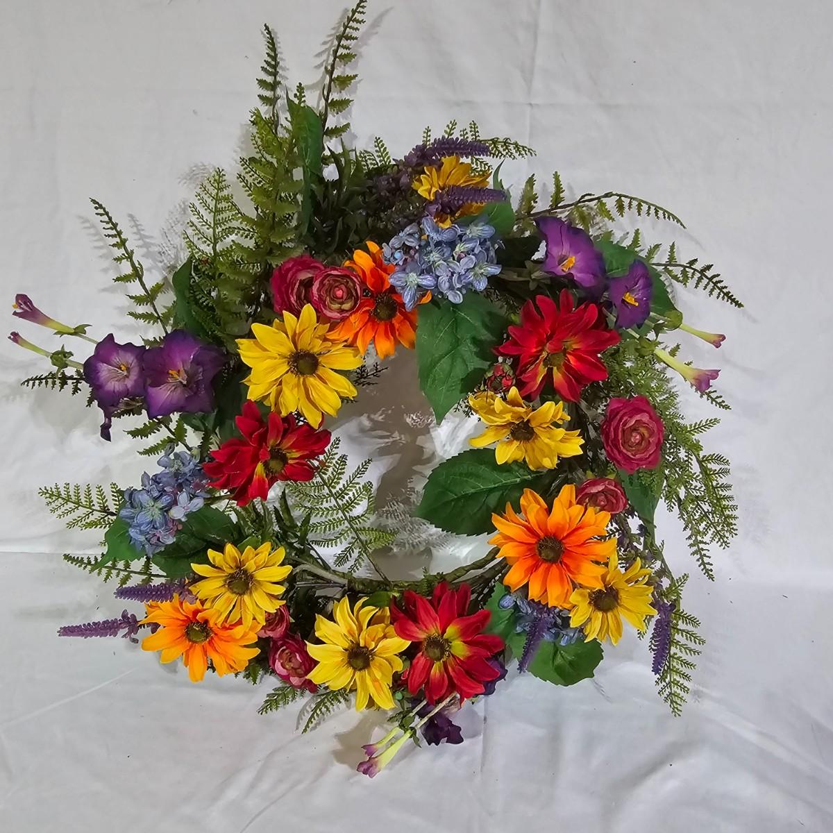 Fourteen artificial floral wreaths in a wide variety of colors and combinations. Daisies, peonies, roses, chrysanthemum and more. Wreaths range in size from 16"D to about 30"D. Nine storage boxes are included. See photos for details. Local pickup only.