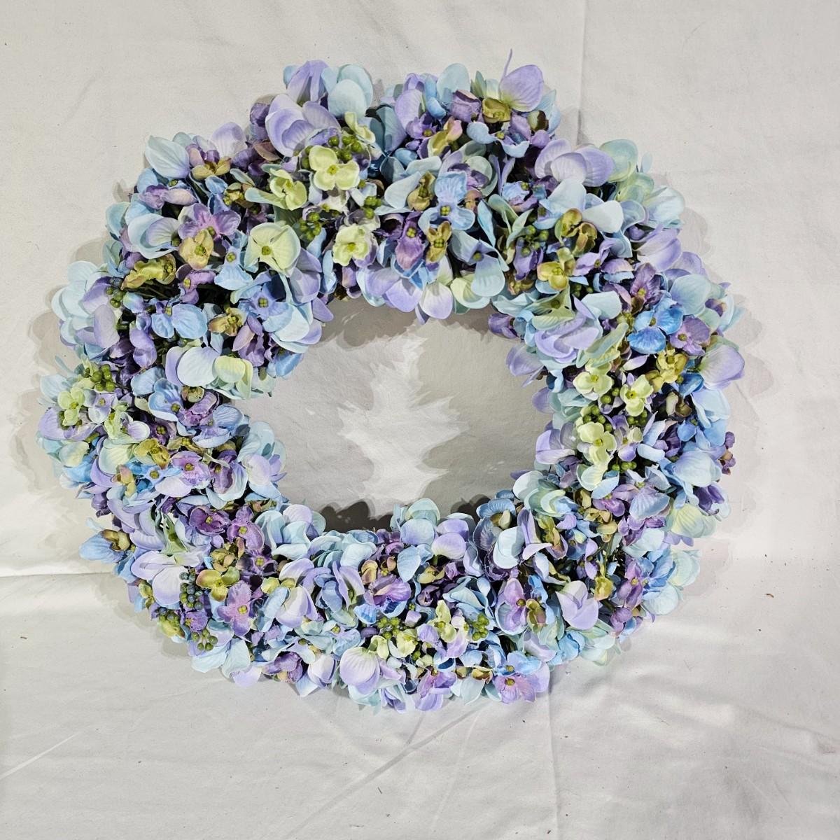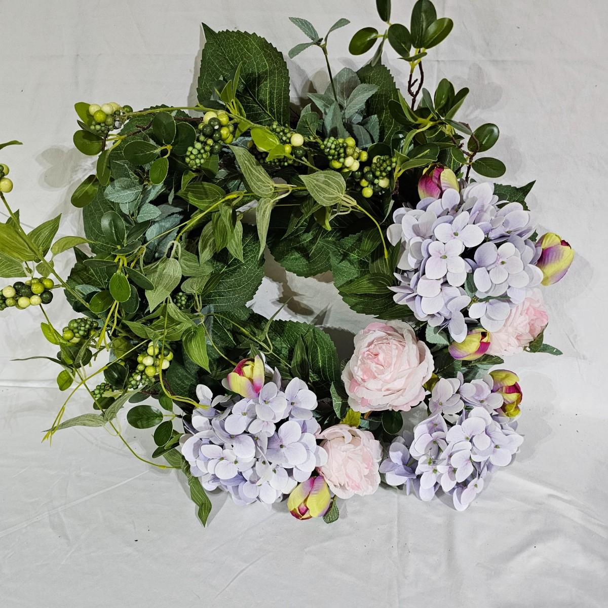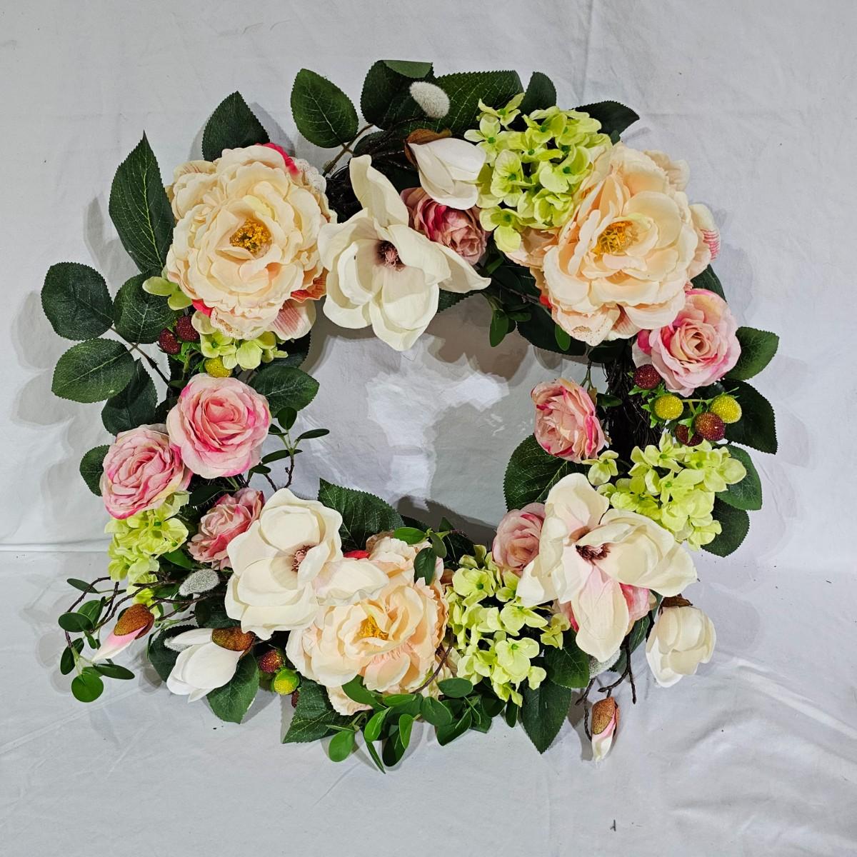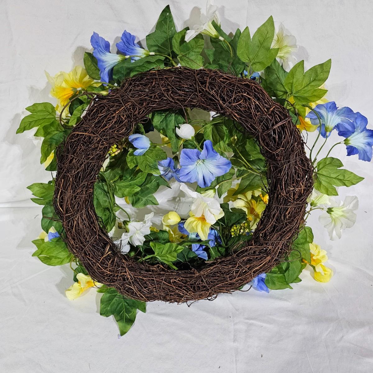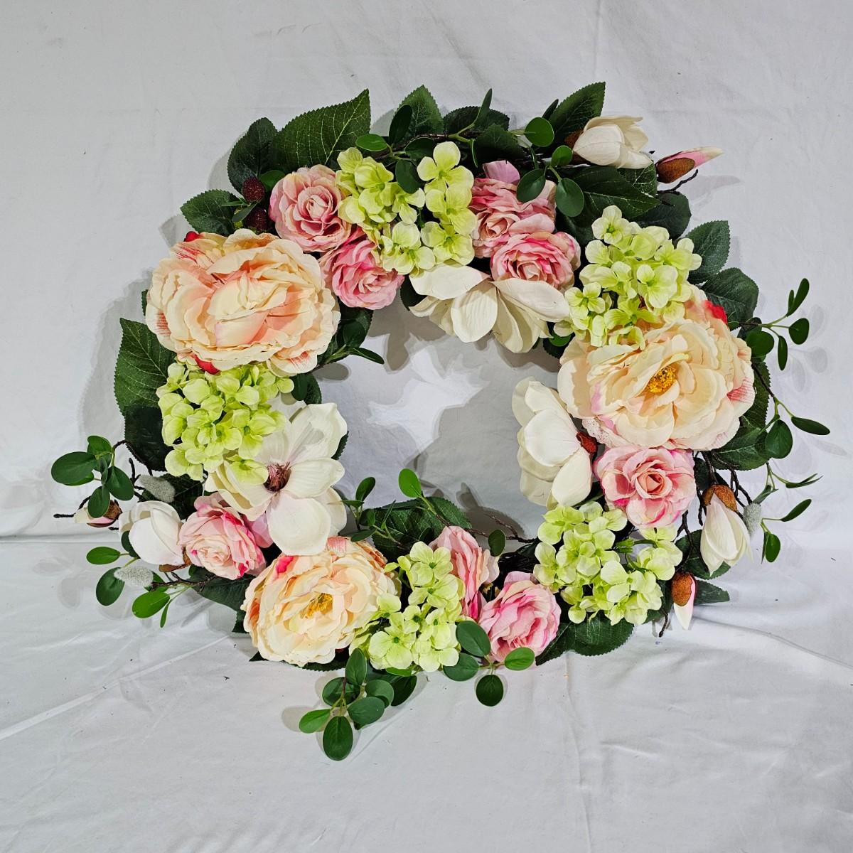 Fourteen artificial floral wreaths in a wide variety of colors and combinations. Daisies, peonies, roses, chrysanthemum and more. Wreaths range in size from 16"D to about 30"D. Nine storage boxes are included. See photos for details. Local pickup only.