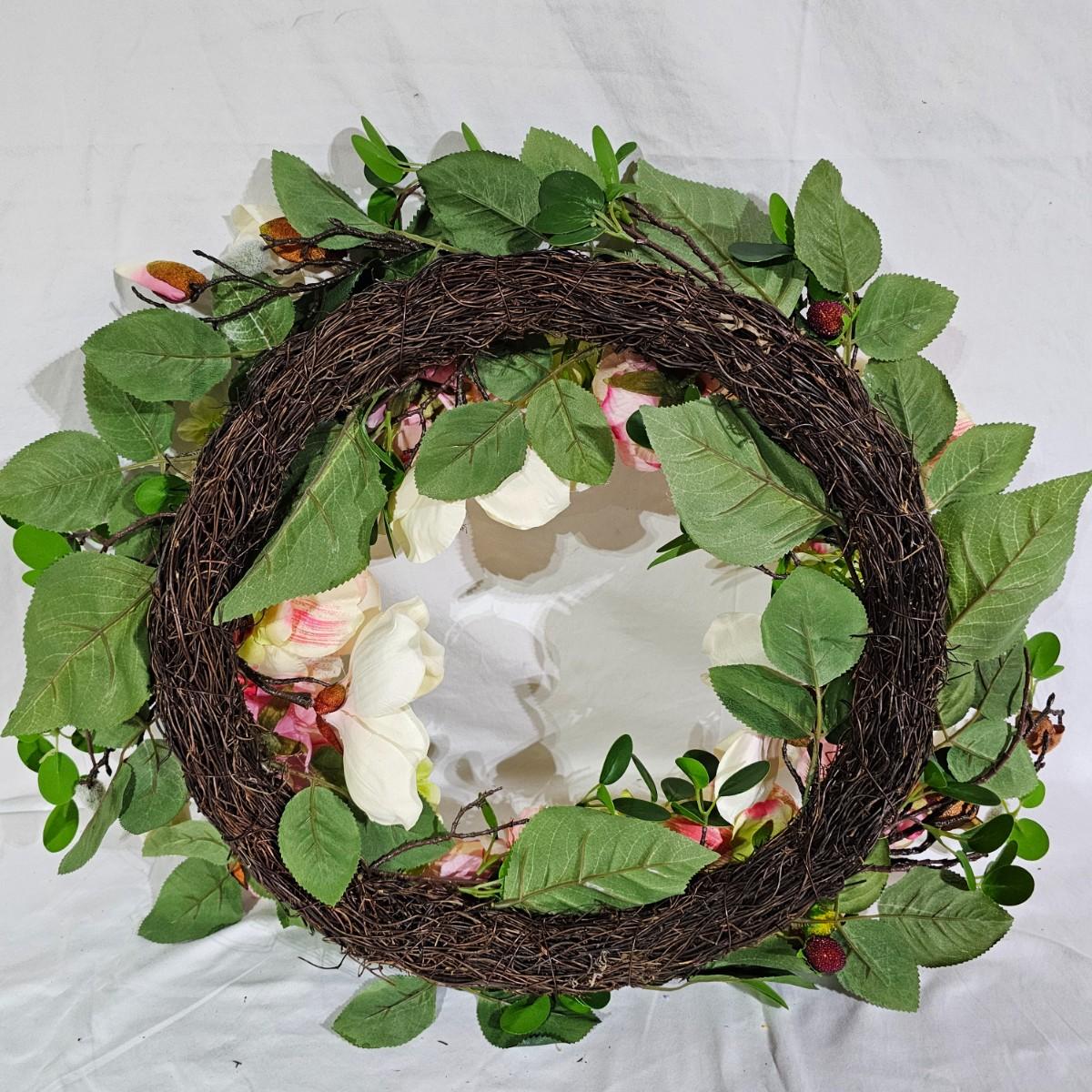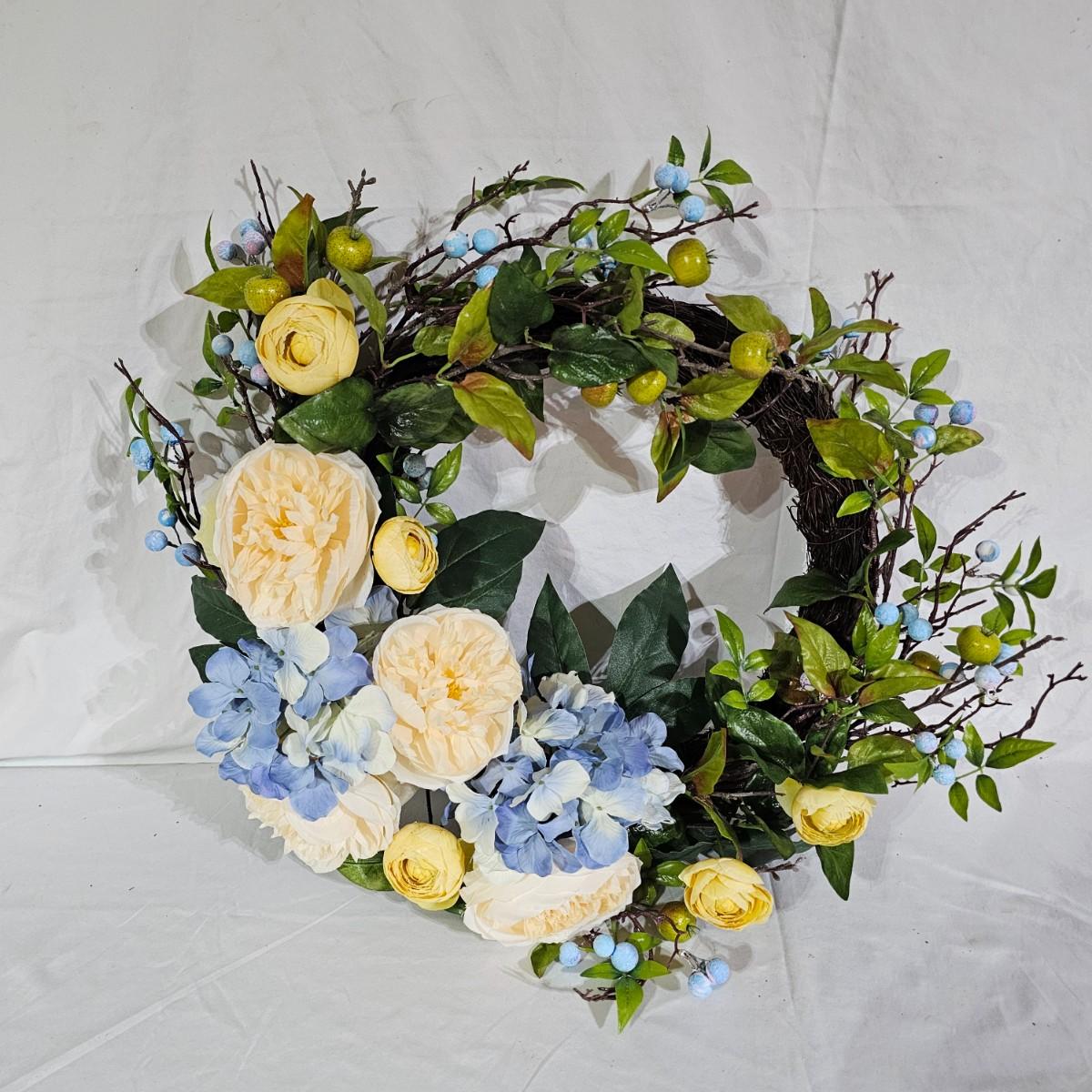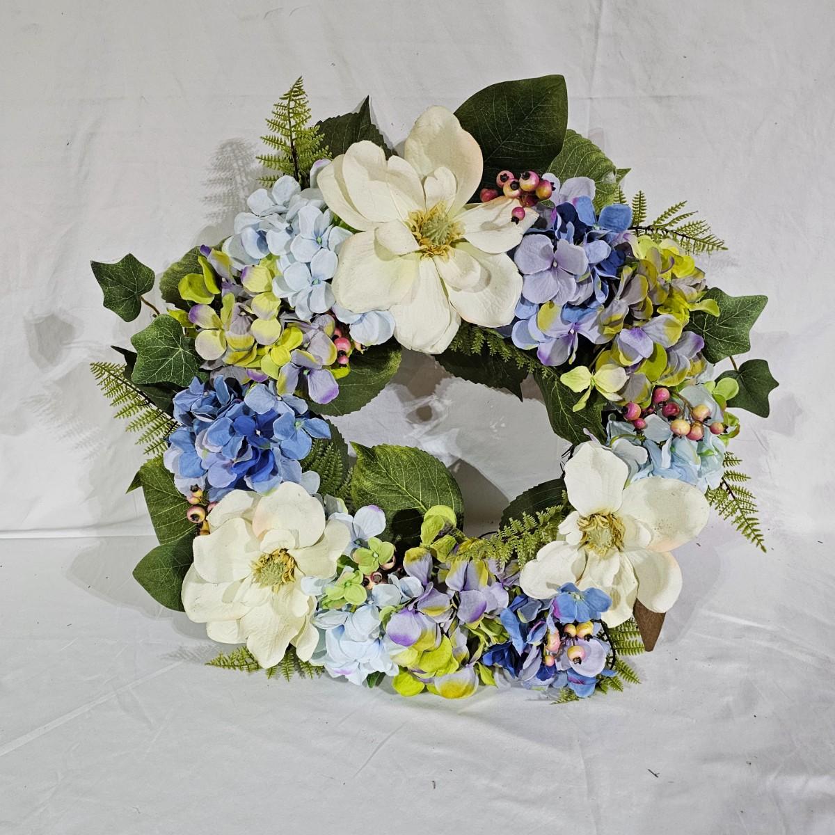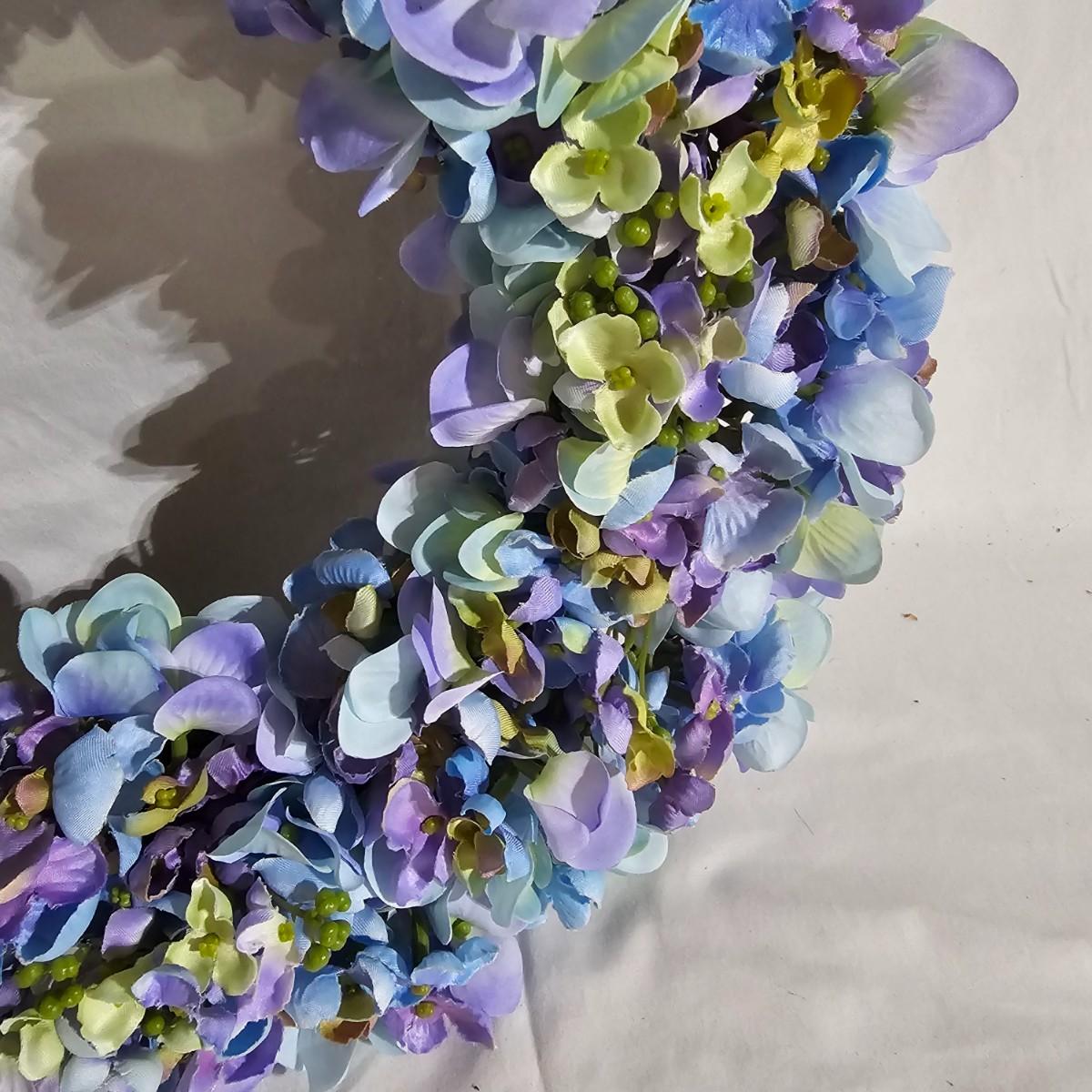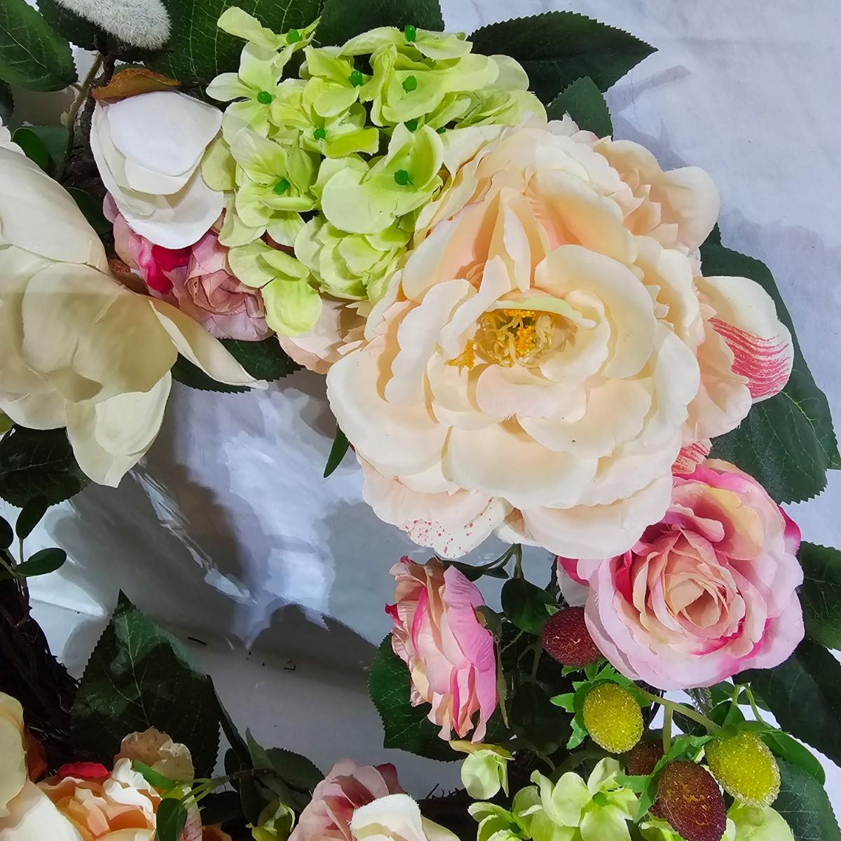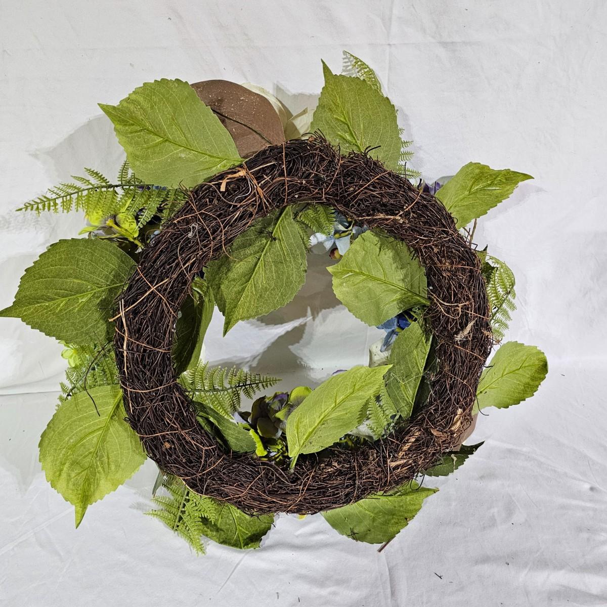 Fourteen artificial floral wreaths in a wide variety of colors and combinations. Daisies, peonies, roses, chrysanthemum and more. Wreaths range in size from 16"D to about 30"D. Nine storage boxes are included. See photos for details. Local pickup only.