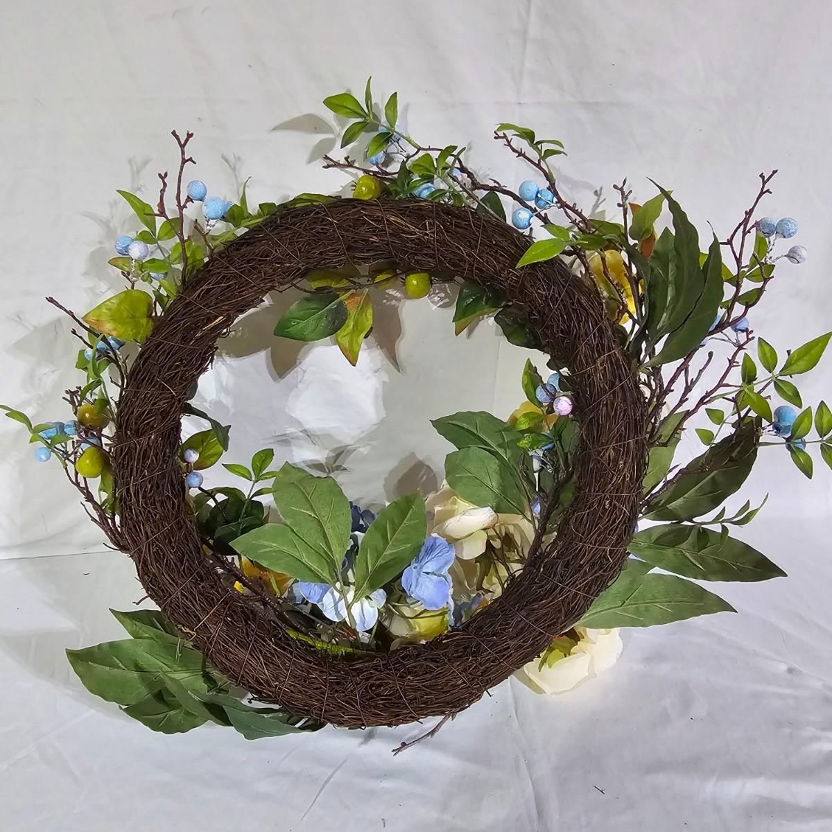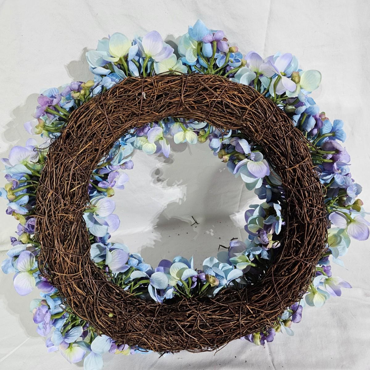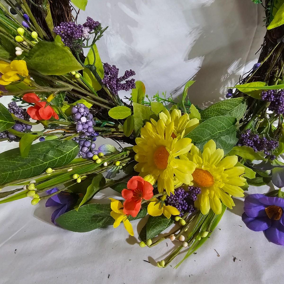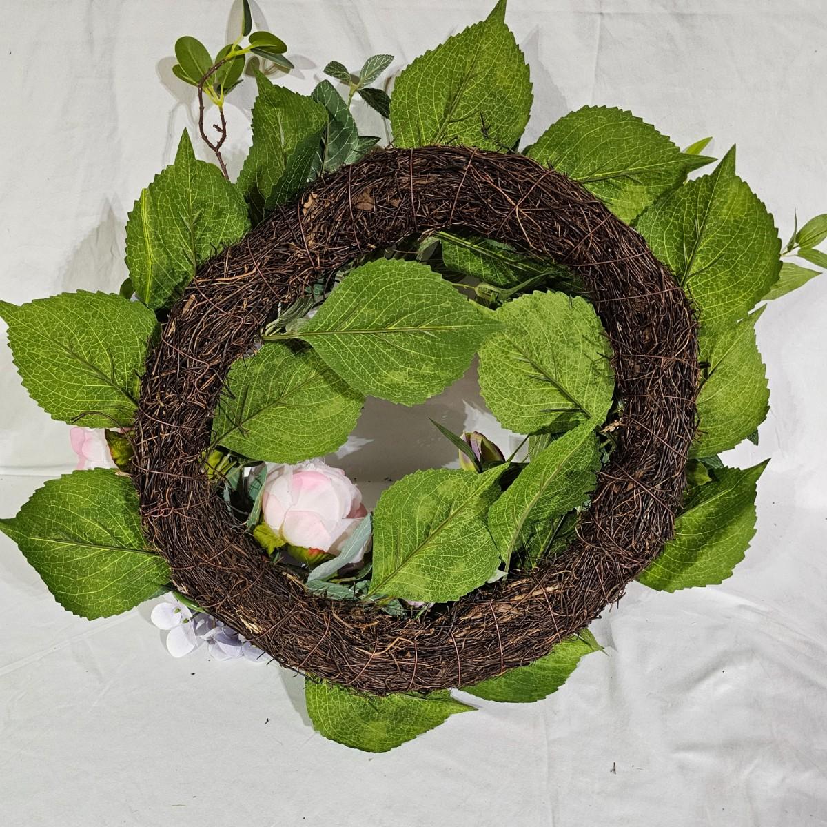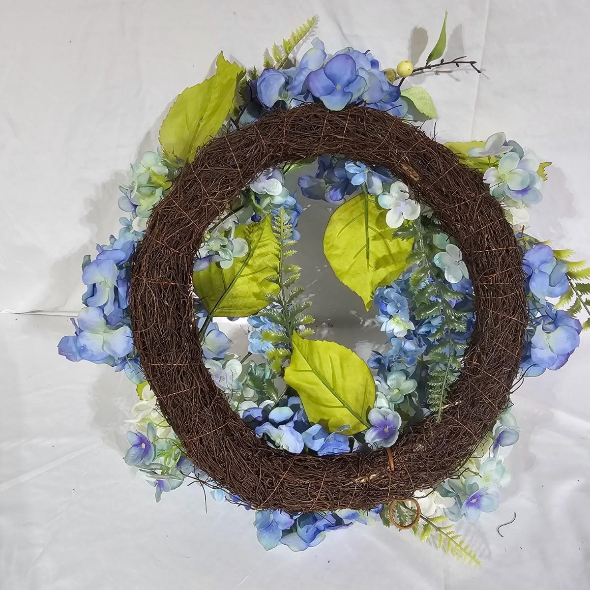 Fourteen artificial floral wreaths in a wide variety of colors and combinations. Daisies, peonies, roses, chrysanthemum and more. Wreaths range in size from 16"D to about 30"D. Nine storage boxes are included. See photos for details. Local pickup only.