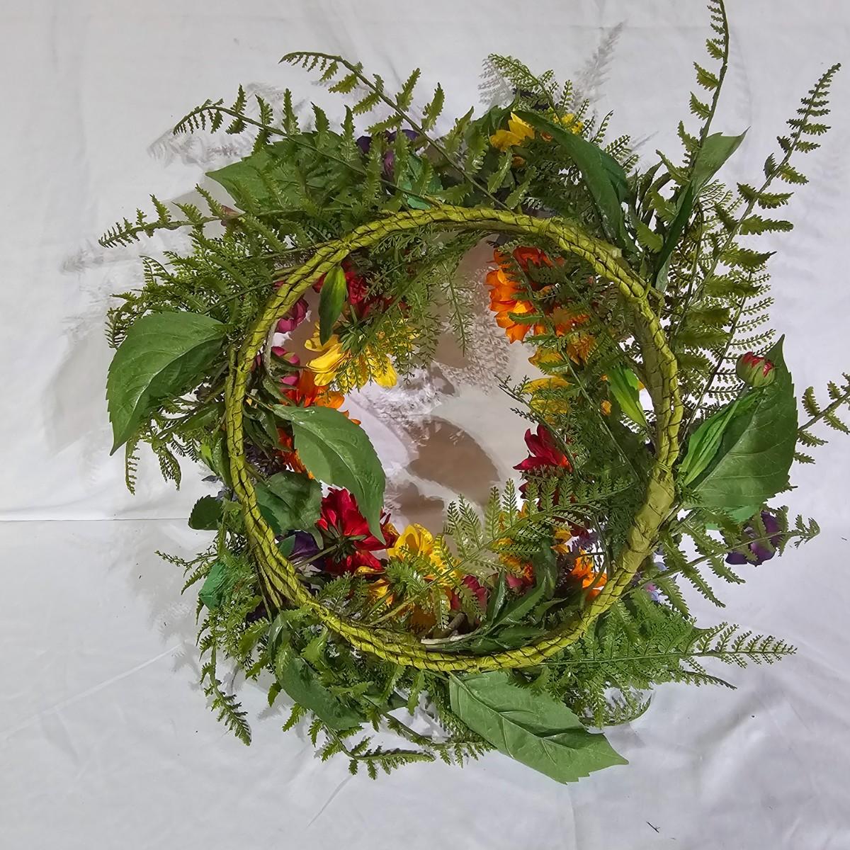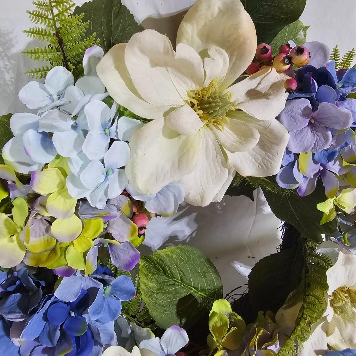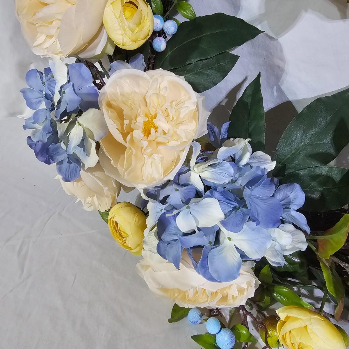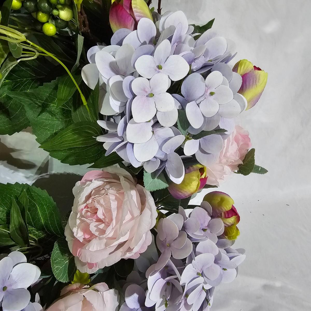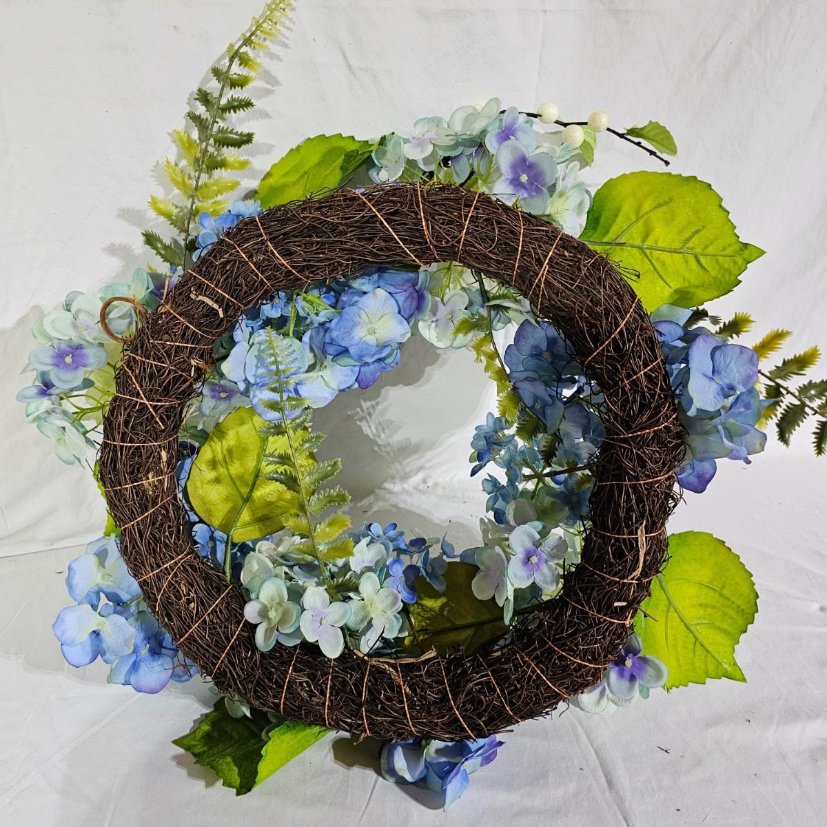 Fourteen artificial floral wreaths in a wide variety of colors and combinations. Daisies, peonies, roses, chrysanthemum and more. Wreaths range in size from 16"D to about 30"D. Nine storage boxes are included. See photos for details. Local pickup only.