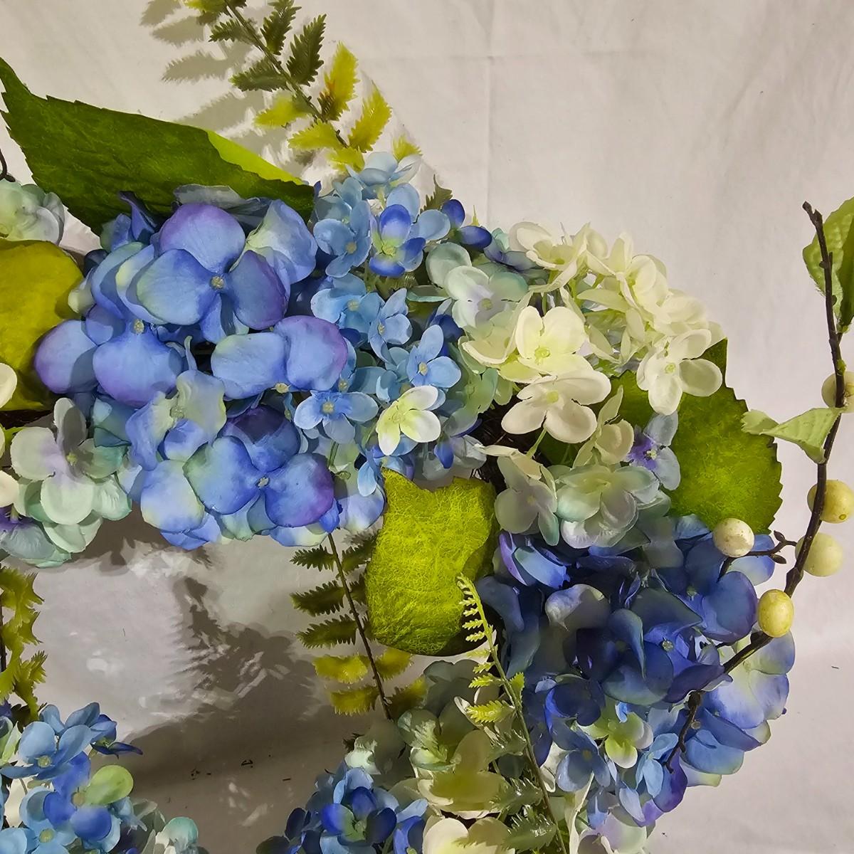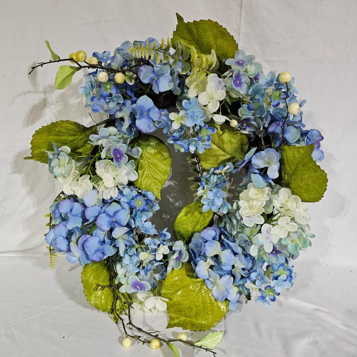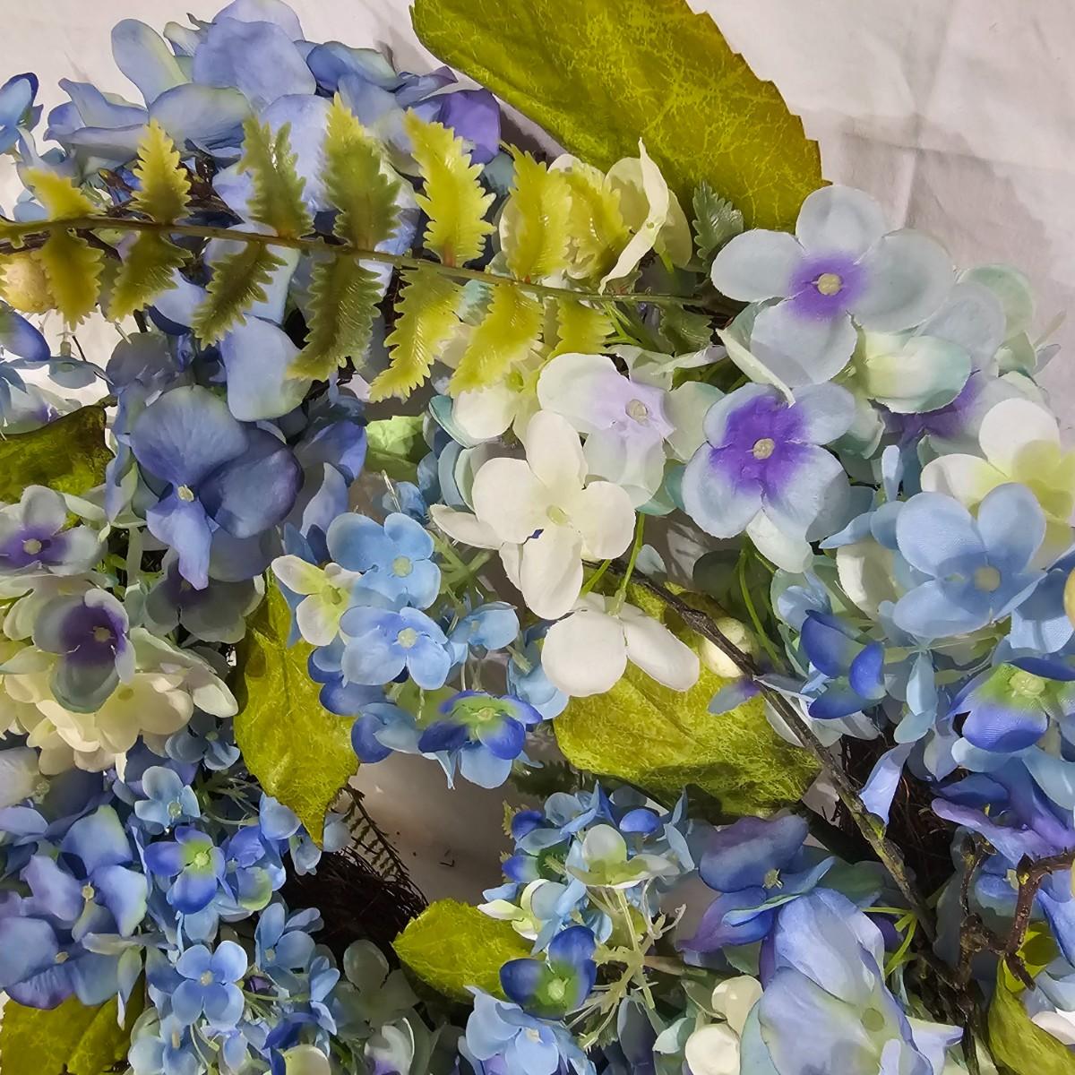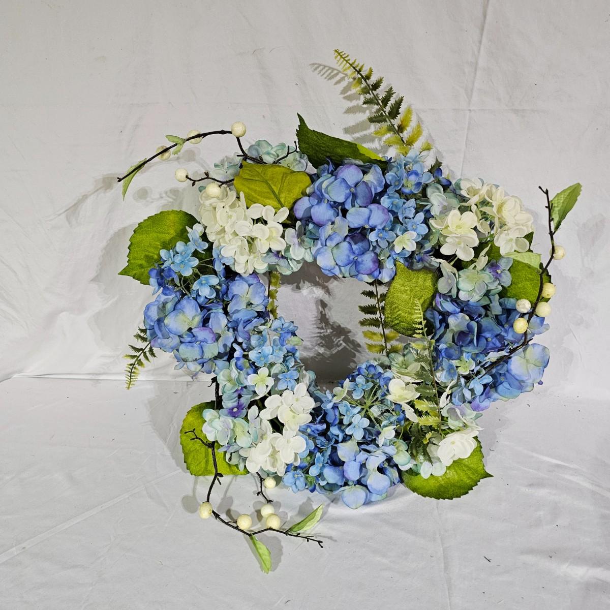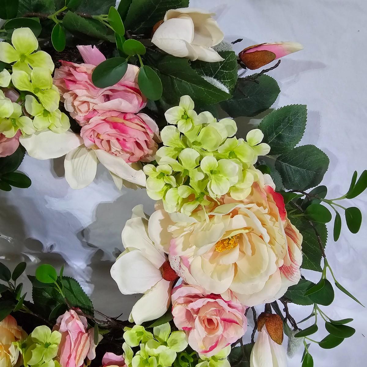 Fourteen artificial floral wreaths in a wide variety of colors and combinations. Daisies, peonies, roses, chrysanthemum and more. Wreaths range in size from 16"D to about 30"D. Nine storage boxes are included. See photos for details. Local pickup only.