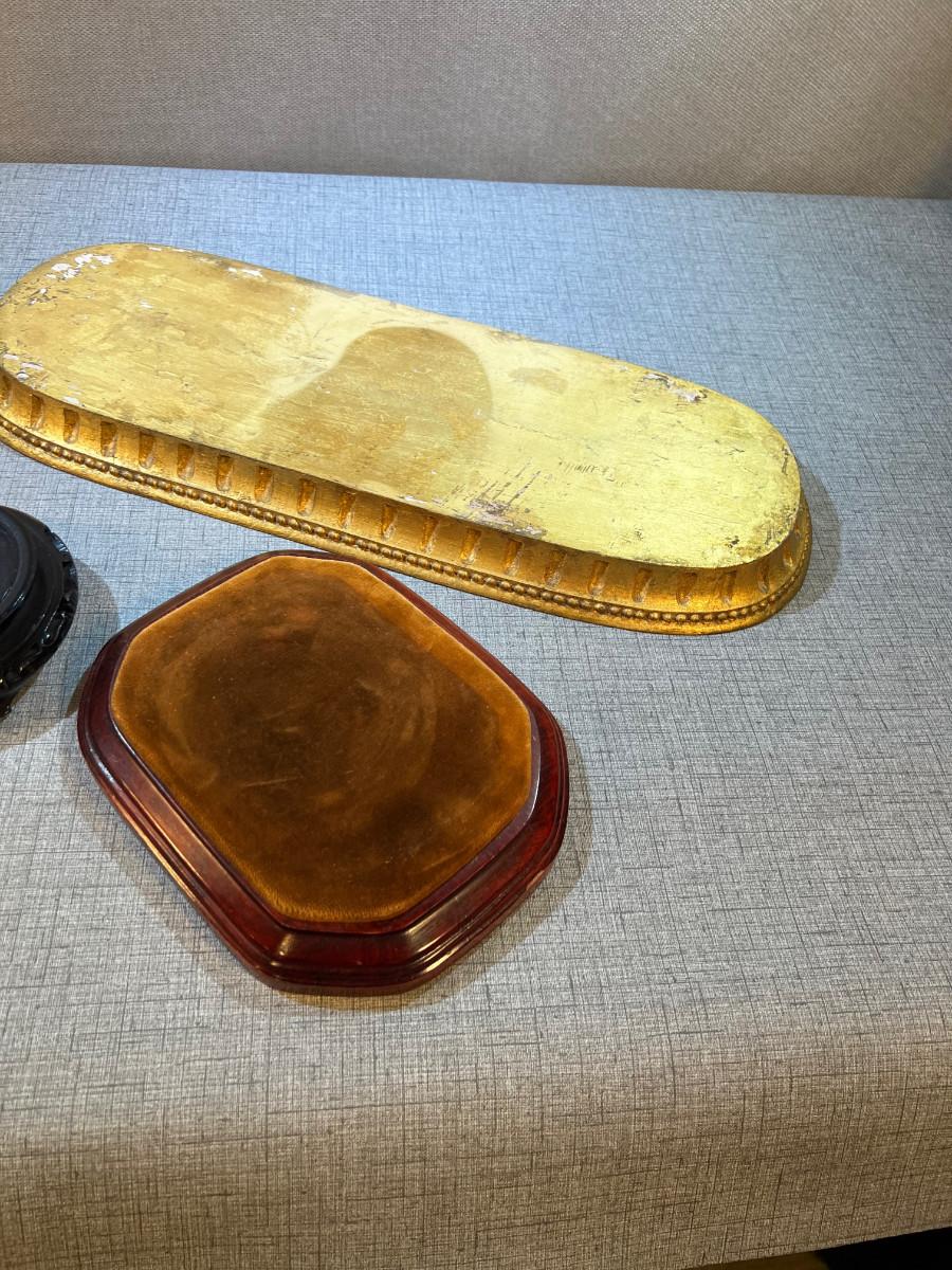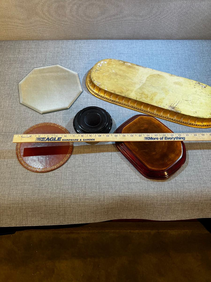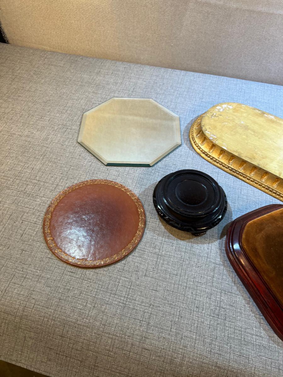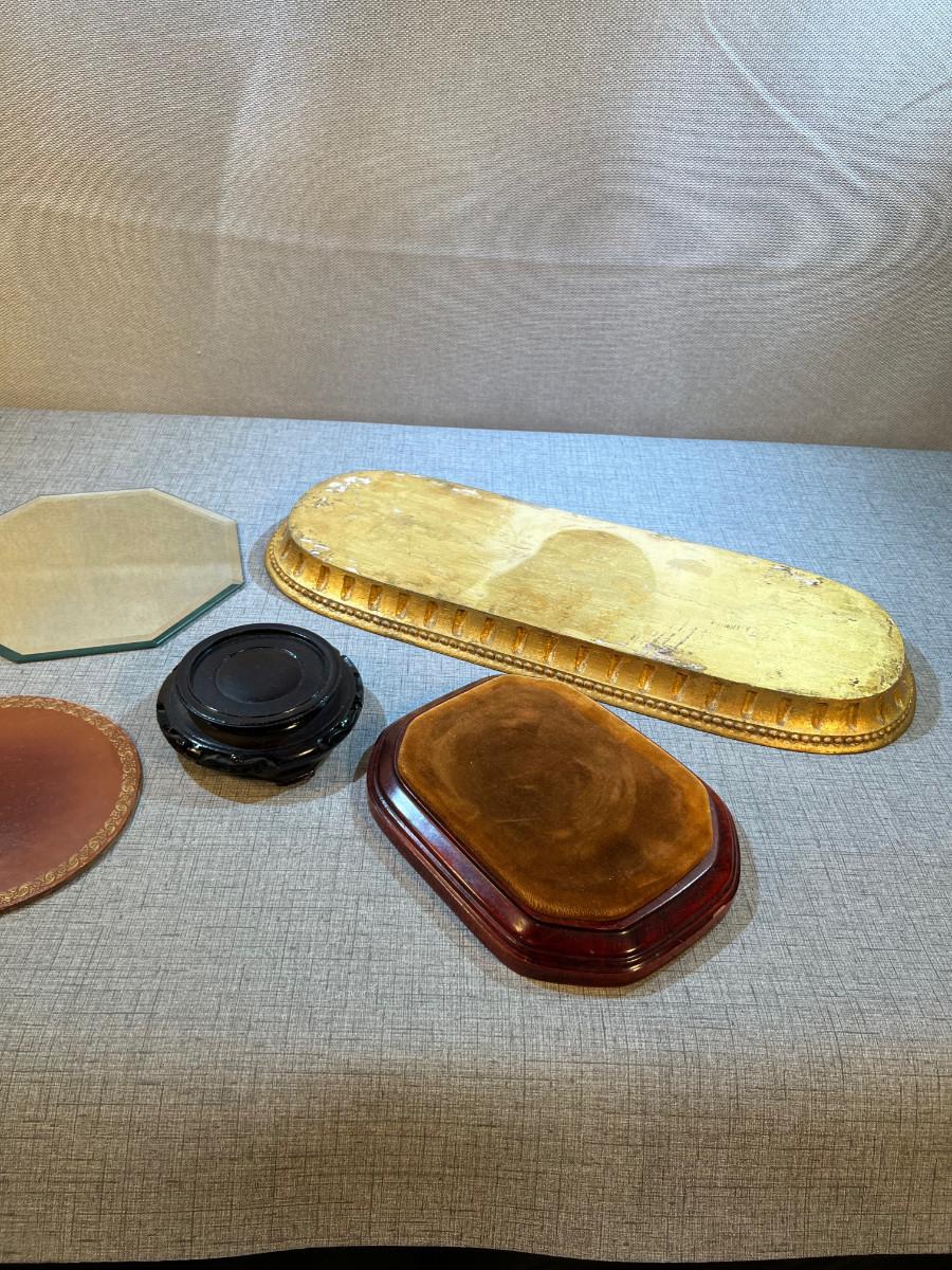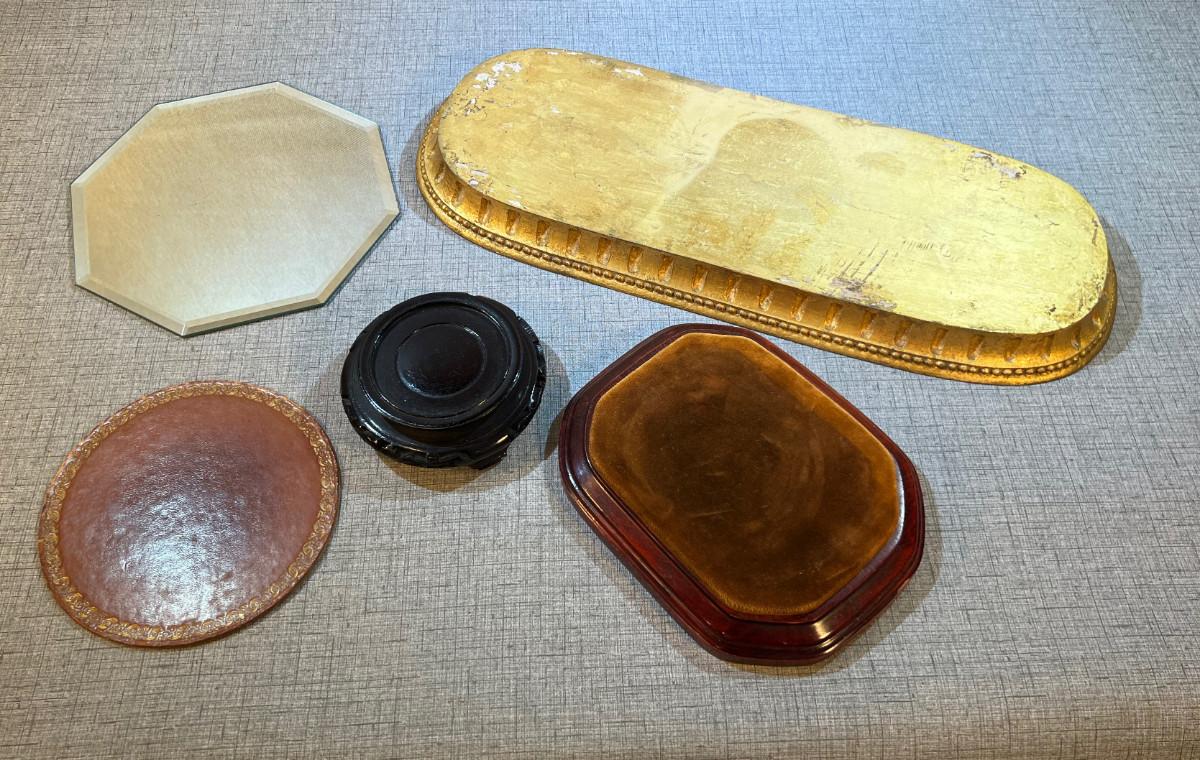 Collection of Stands for Vases (5); Gold, Wood, Mirrored, Leather Etc.