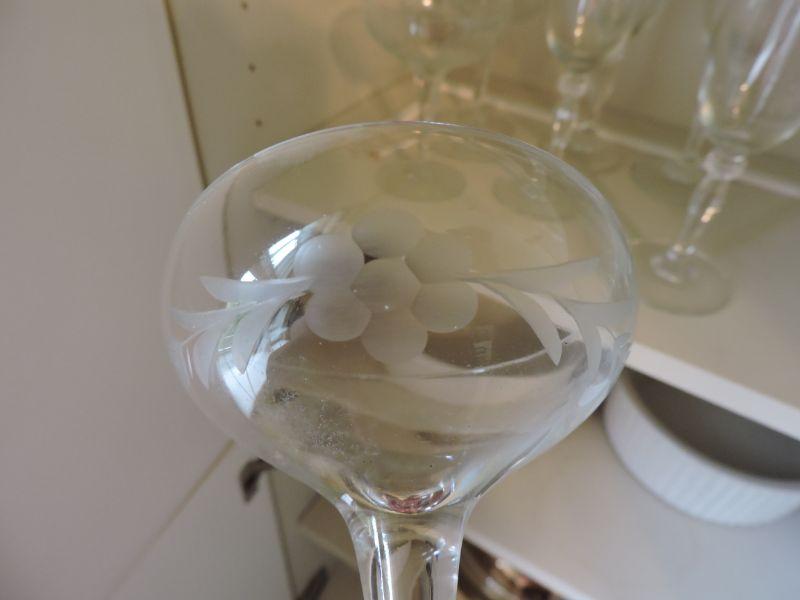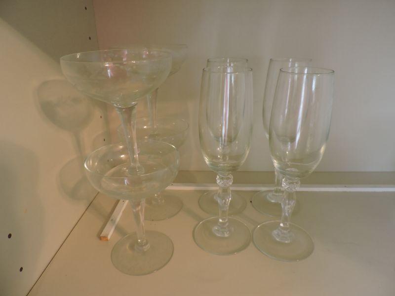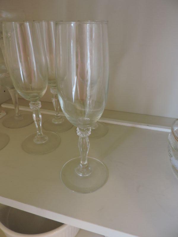 Etched glasses and champagne flutes. **Please read Terms and Conditions before placing a bid. Pick up is Saturday, November 30 from 9am to 3pm in Bridgeton, NJ. All sales are final. All sales are as is, where is. Please review all photos. Any props included in photos are not included in listing. All measurements are approximate.
