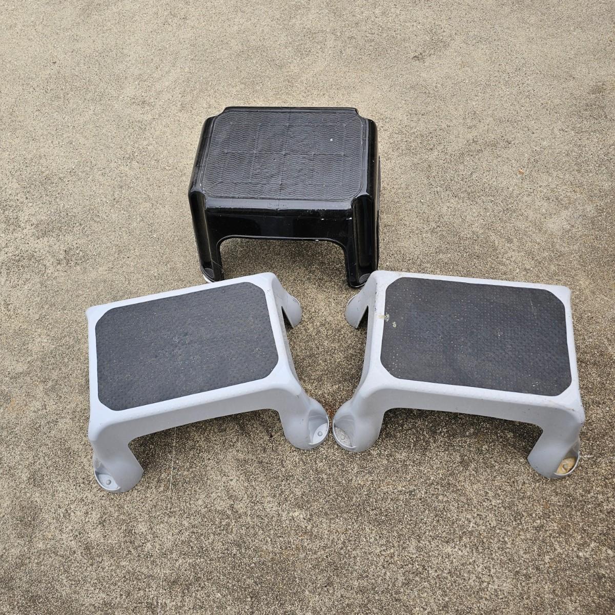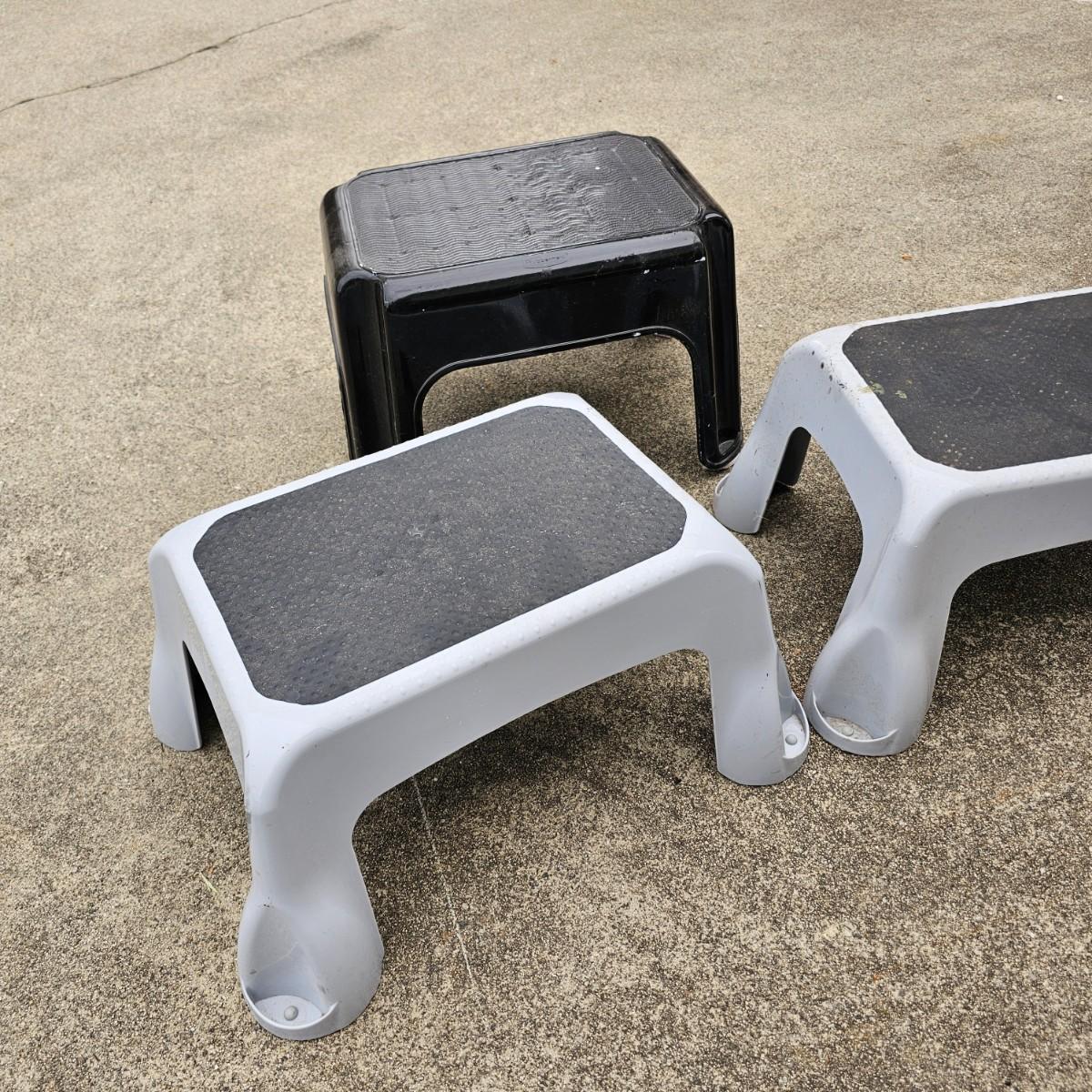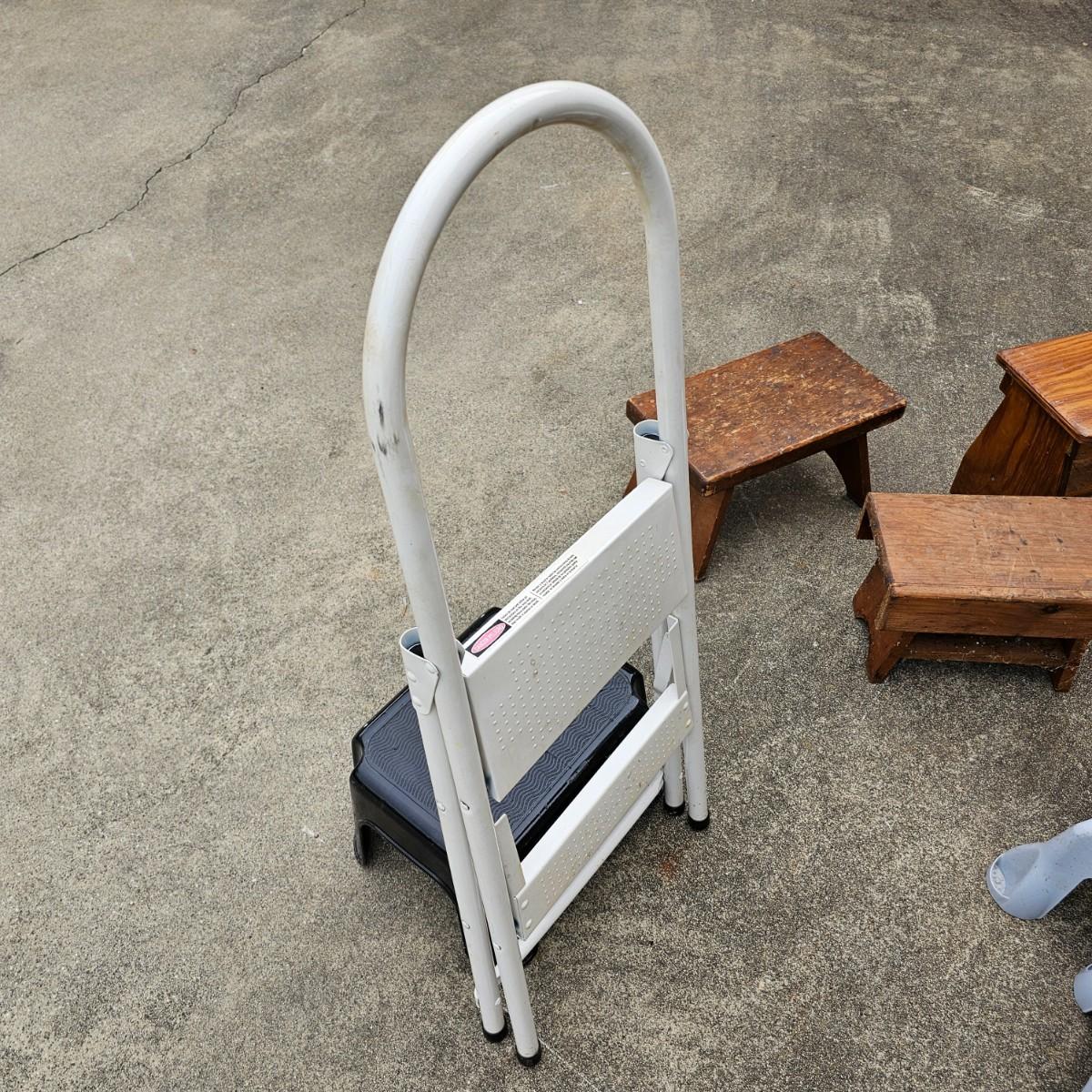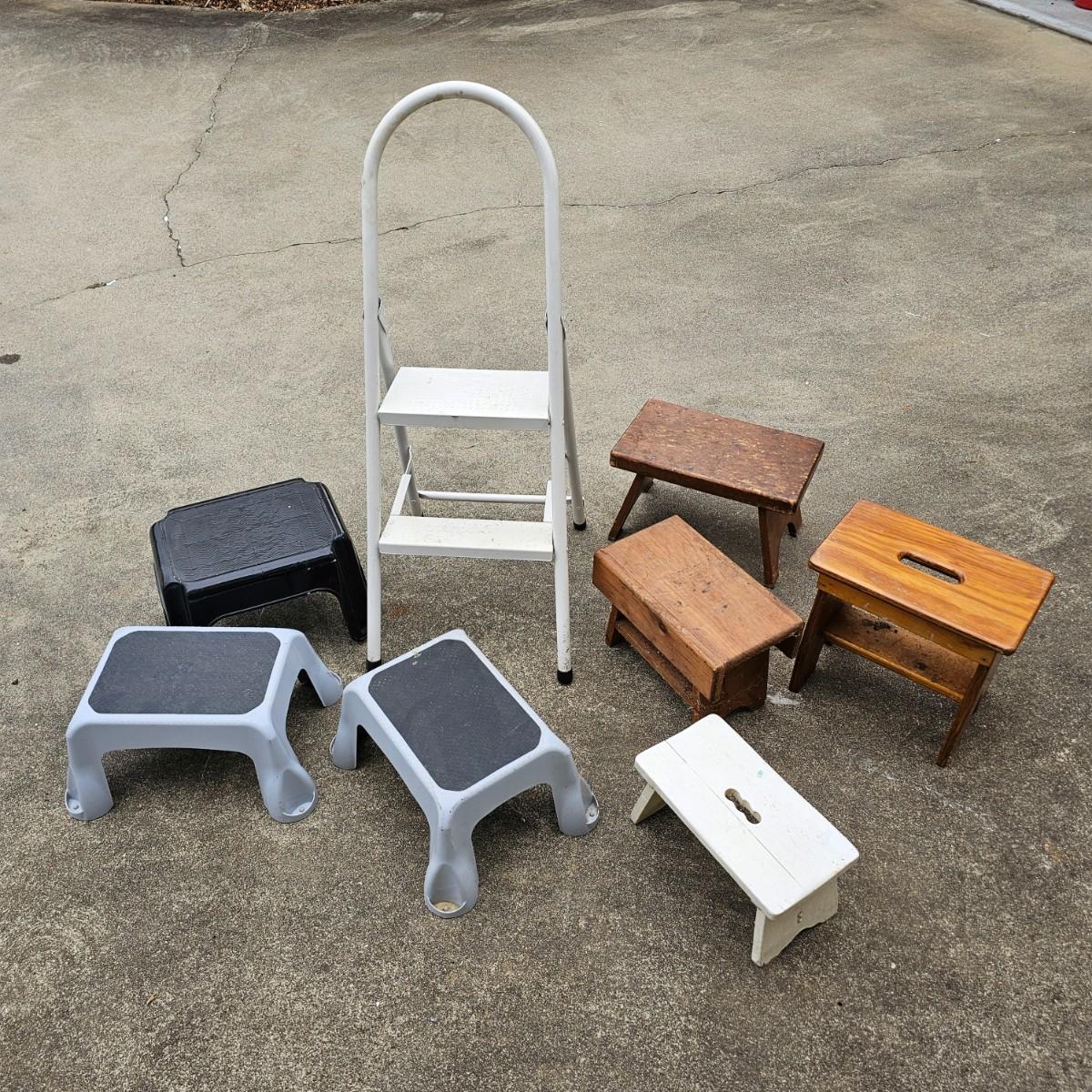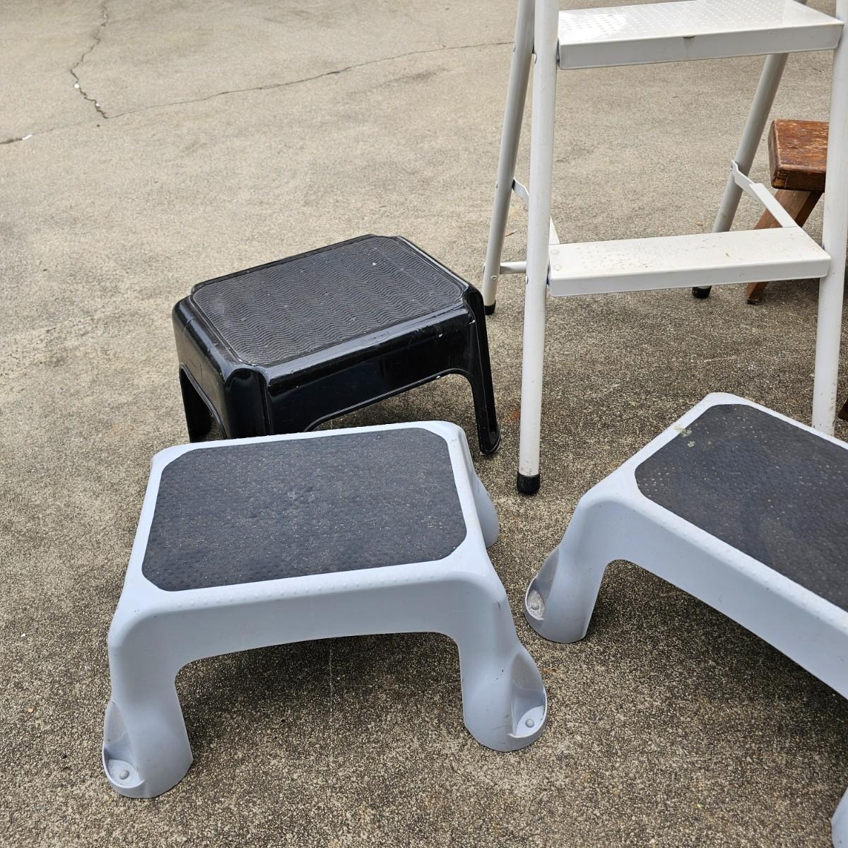 Eight handy stepstools for indoor or outdoor use. One metal, three plastic and four wooden items. Folding metal stepstool measures 14" x 19" x 39"H. Gray plastic items are 13" x 17" x 8"H. Small white wooden stool is 7" x 13" x 7"H. Wooden stools appear to be handmade. See photos for details. Local pickup only.