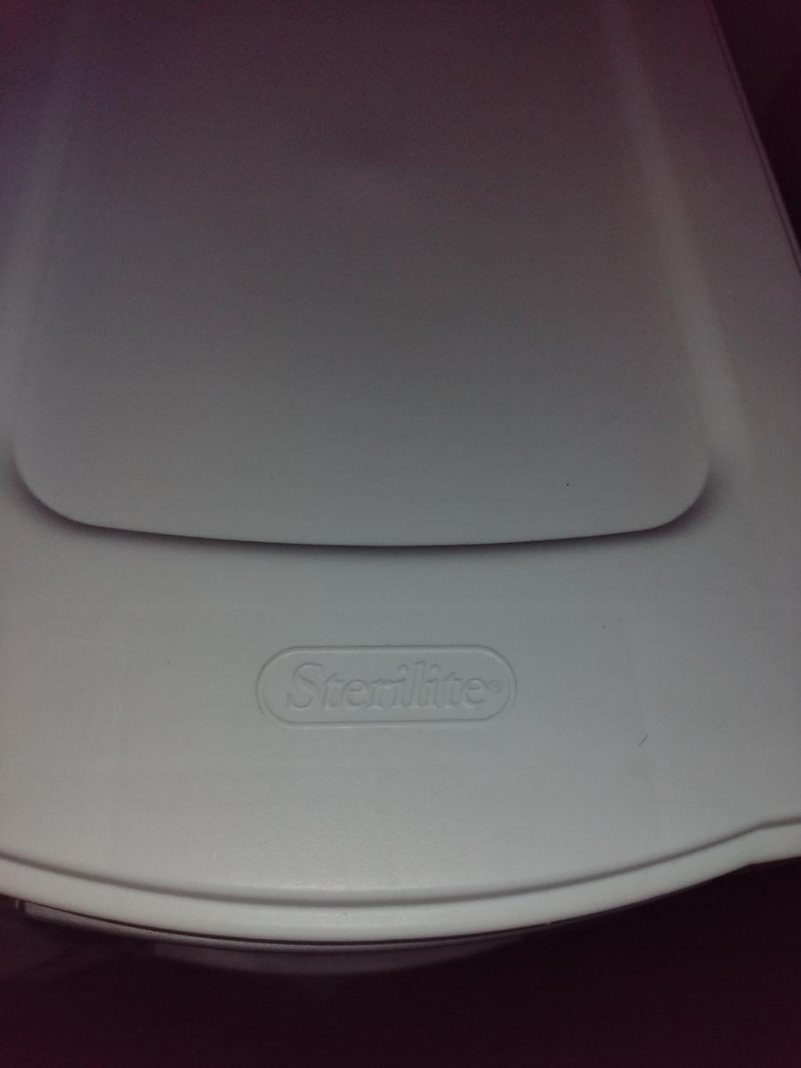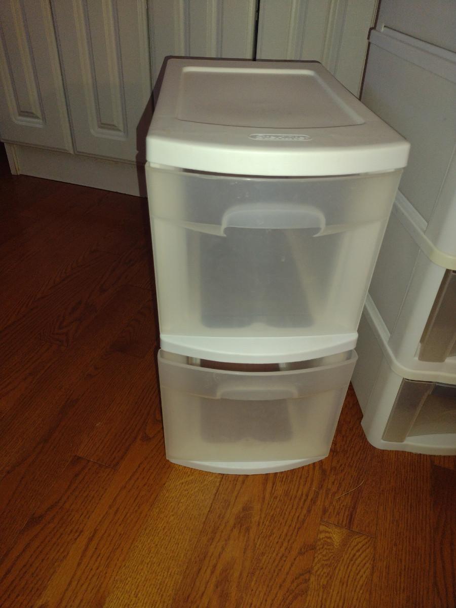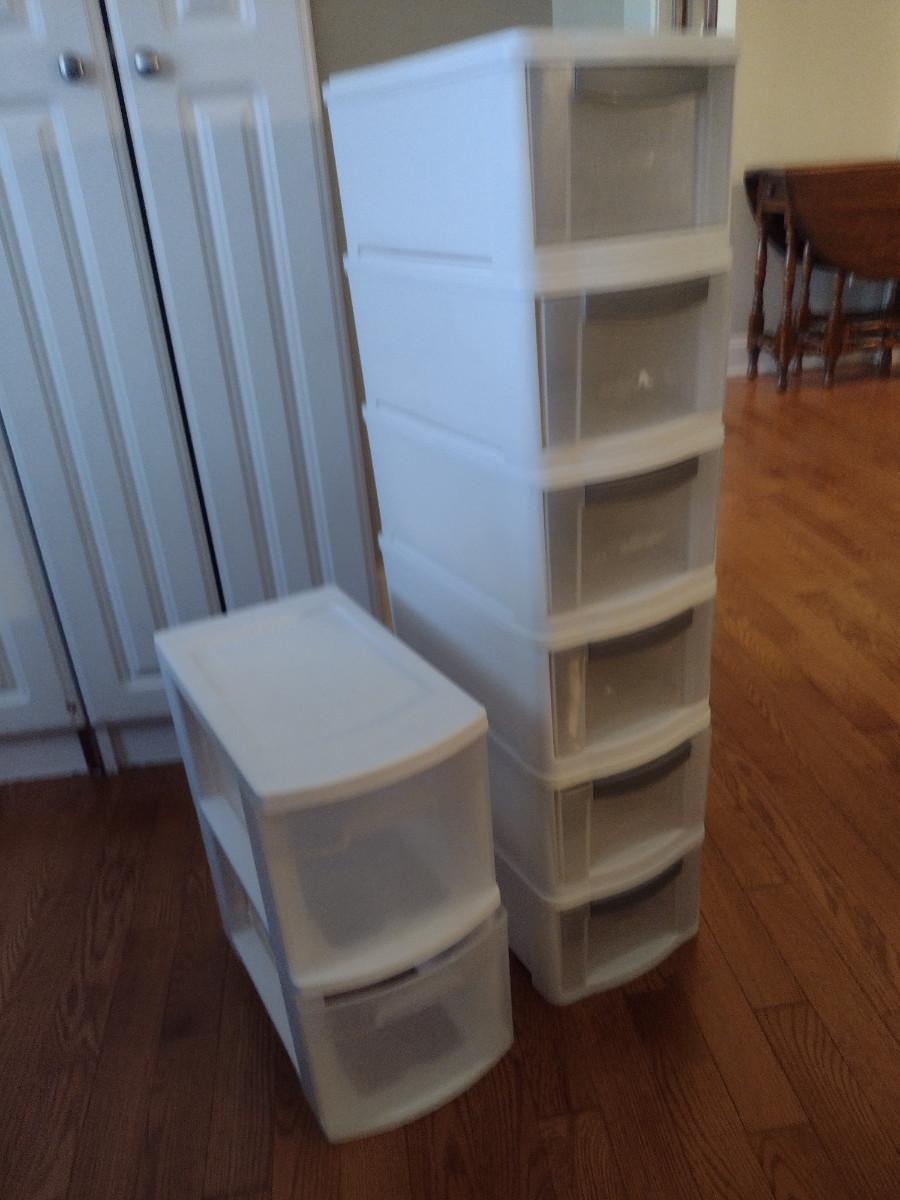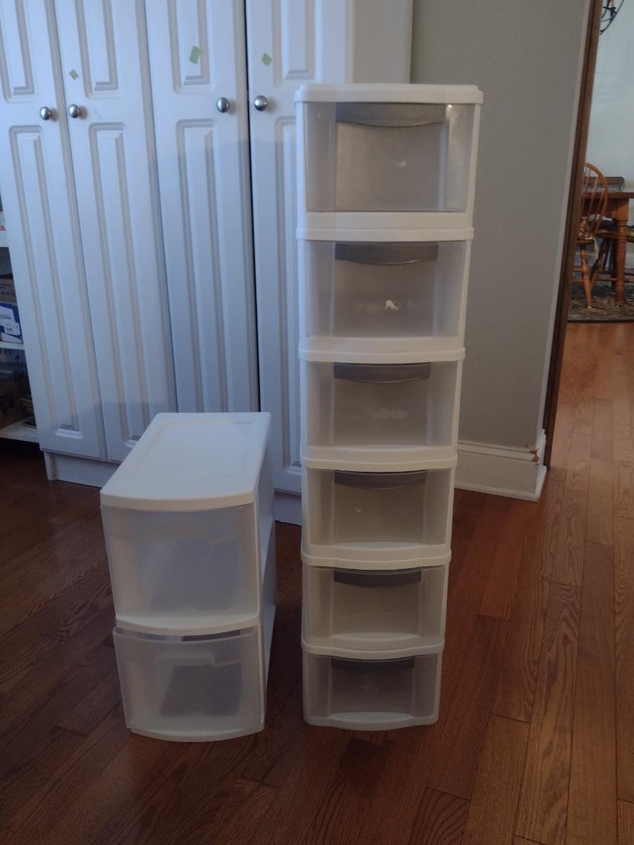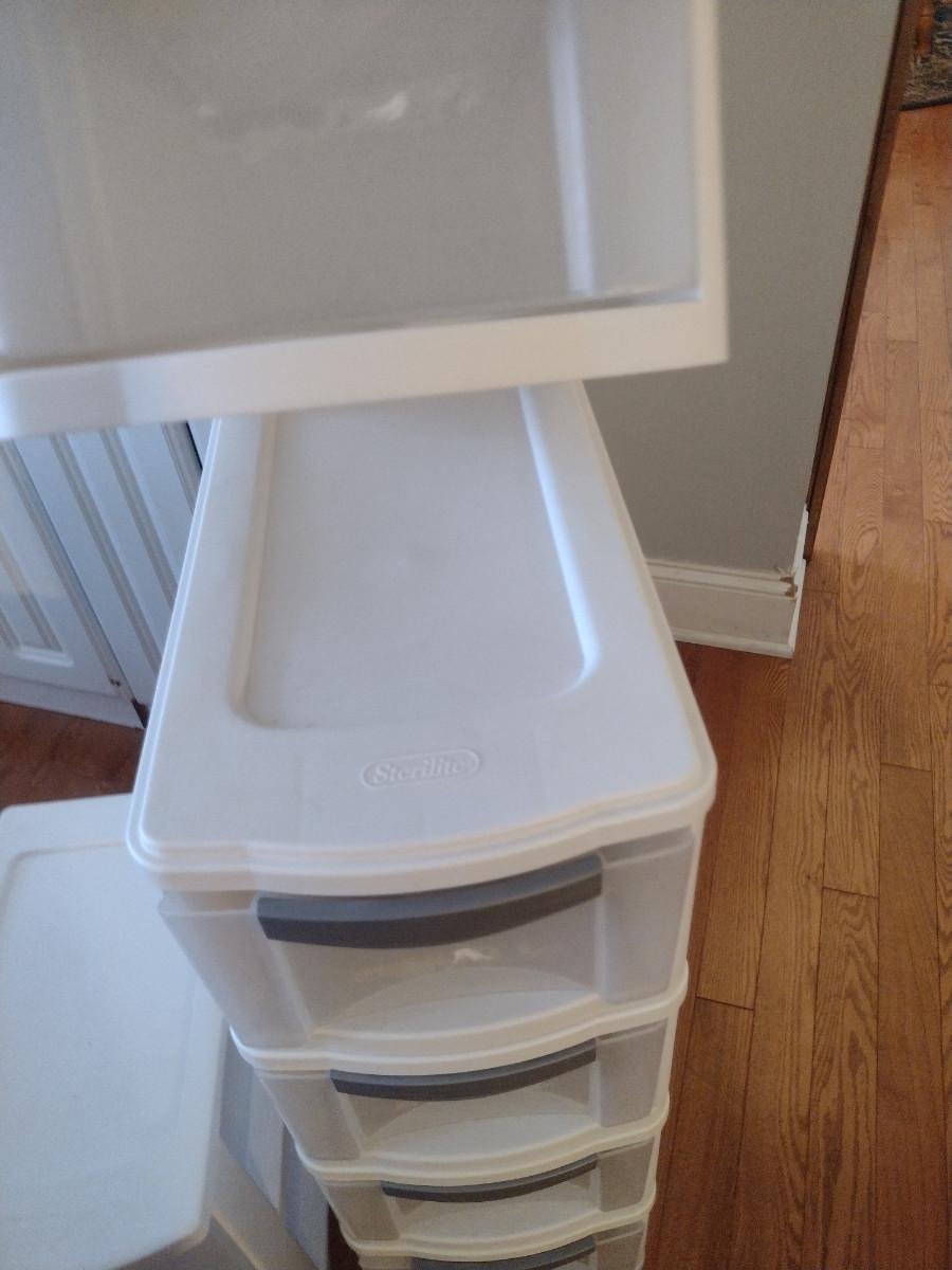 Collection of Sterilite Plastic Storage Containers. Stack of six shown on right hand side of picture are individual containers.
