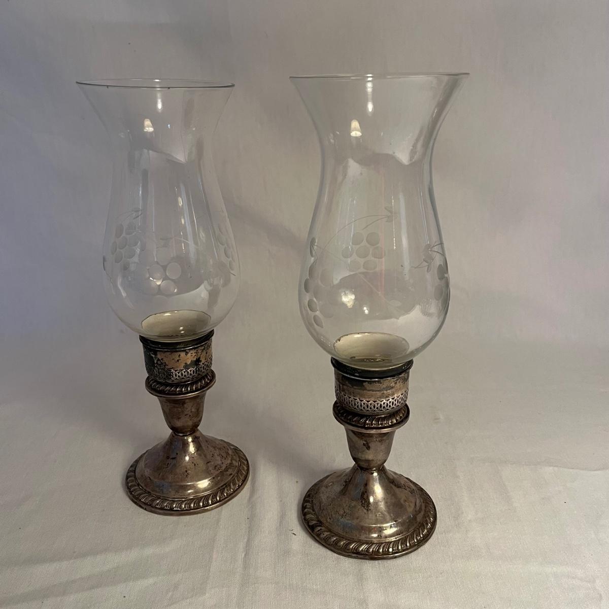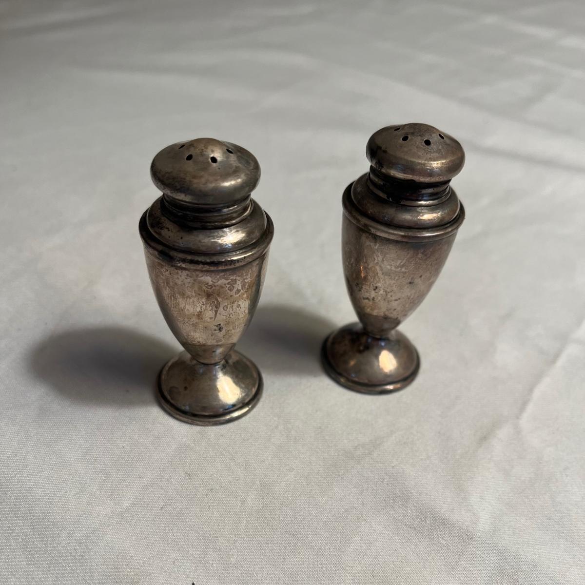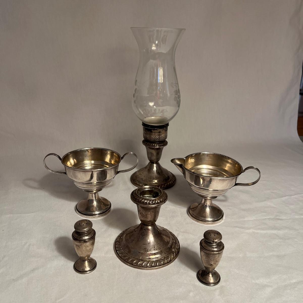 This lot has sterling candlesticks, salt and pepper shakers, a sugar and creamer set and a footed bowl. The tallest being the candlesticks at 3.5”D x 10.25H. All items show signs of wear.