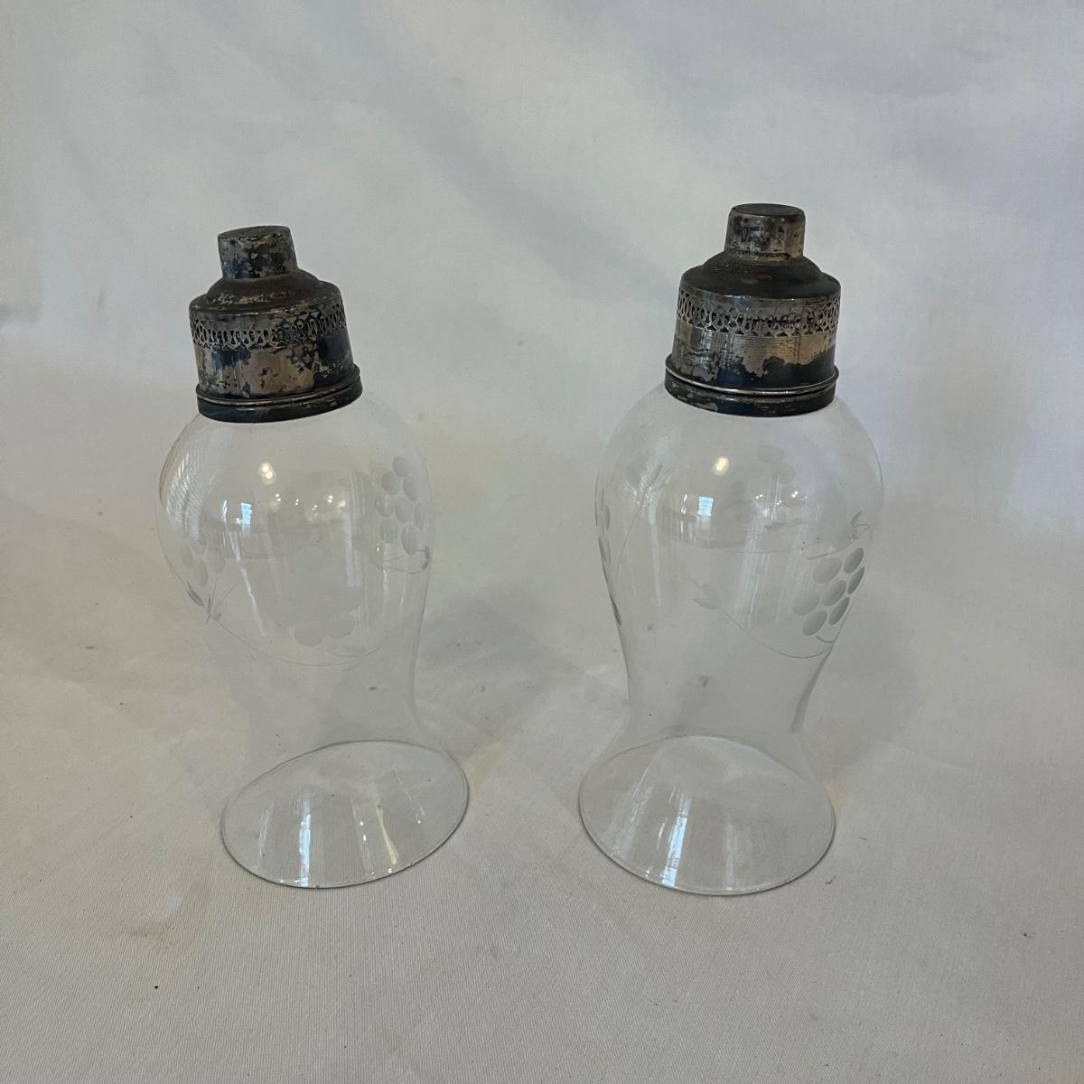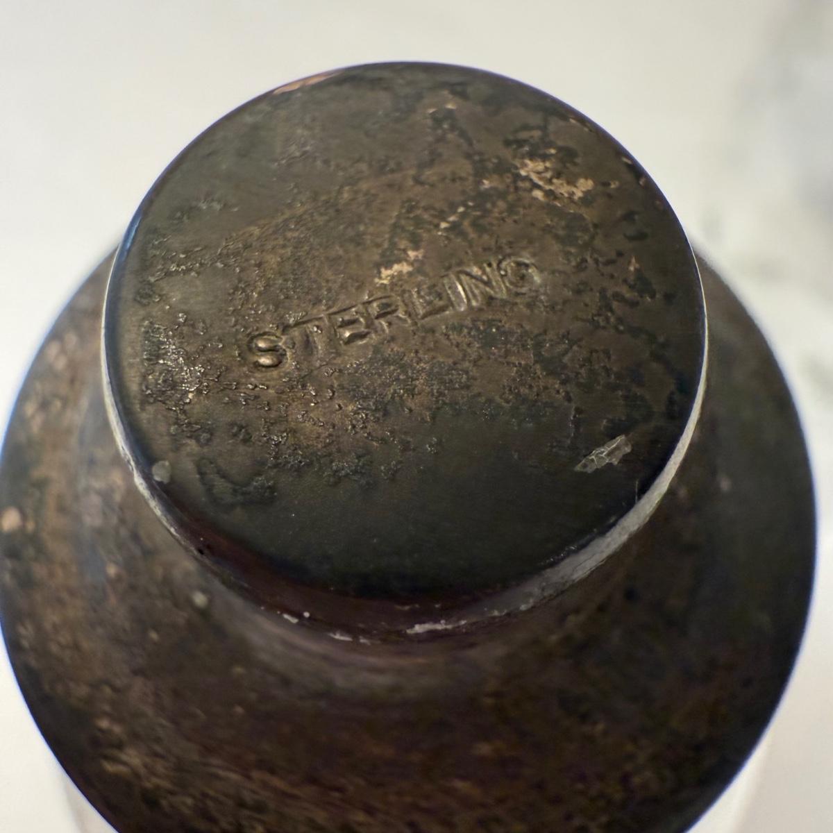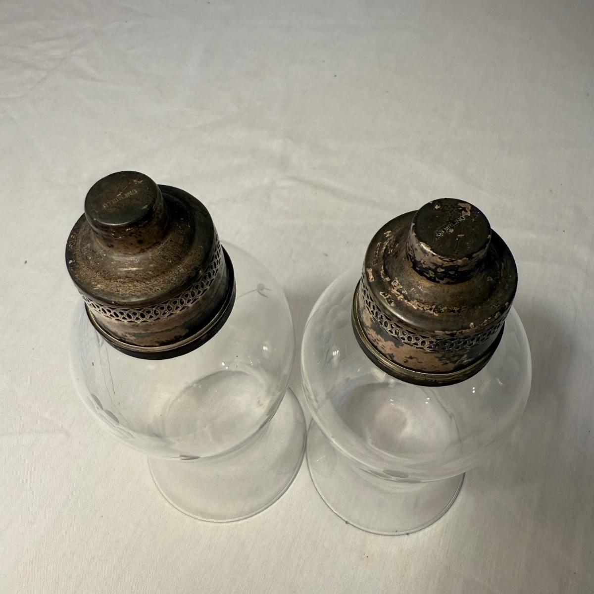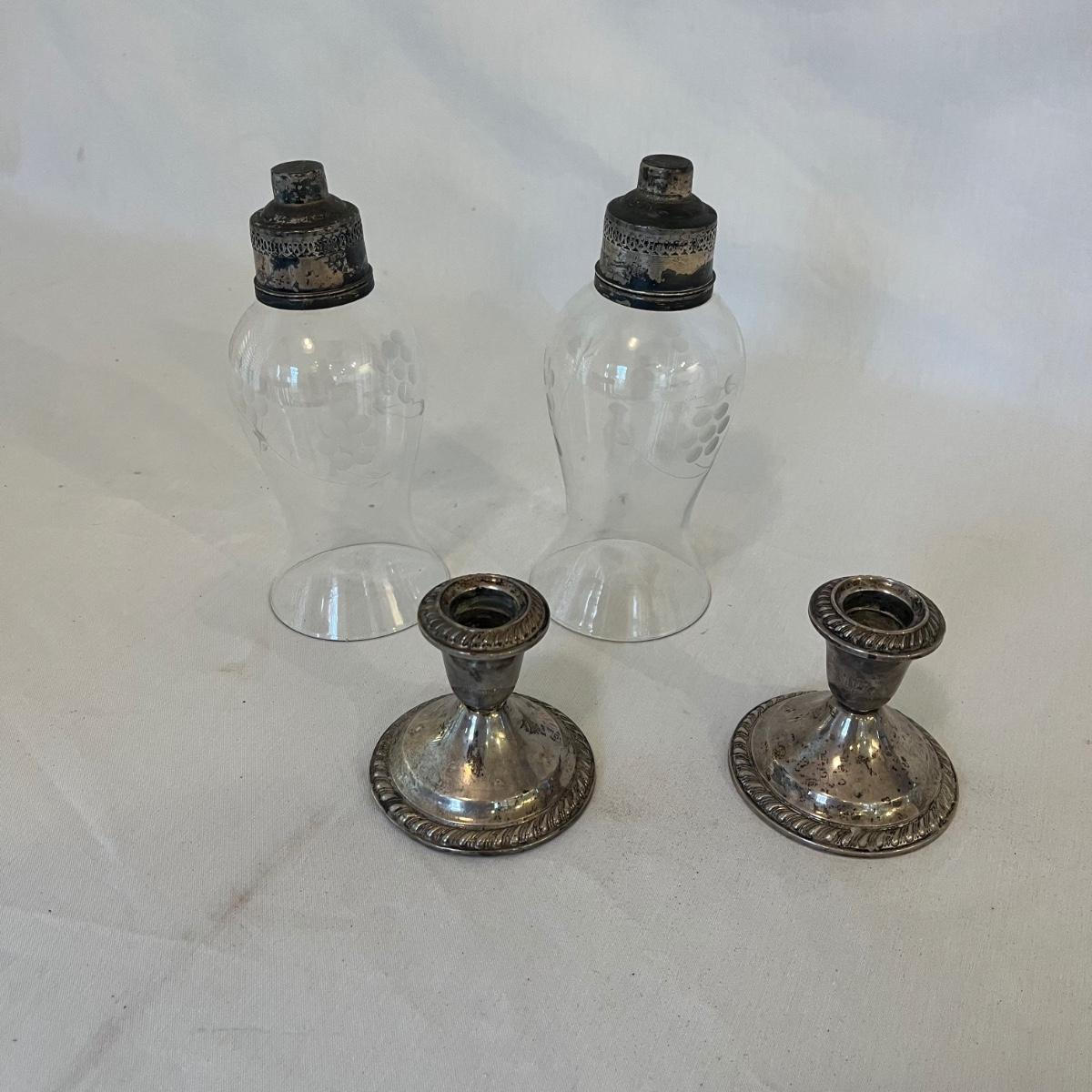 This lot has two Gorham sterling candlesticks with hurricane globe attachments, a set of six salt and pepper shakers in a case labeled "Mitchell's", a sugar and creamer set, and a Sanborns Mexico footed bowl with a dragon-like design. The tallest items are the candlesticks at 3.5”D x 10.25"H. All items show signs of tarnishing/wear. One salt shaker has no lid and one lid does not fit any of the shakers.