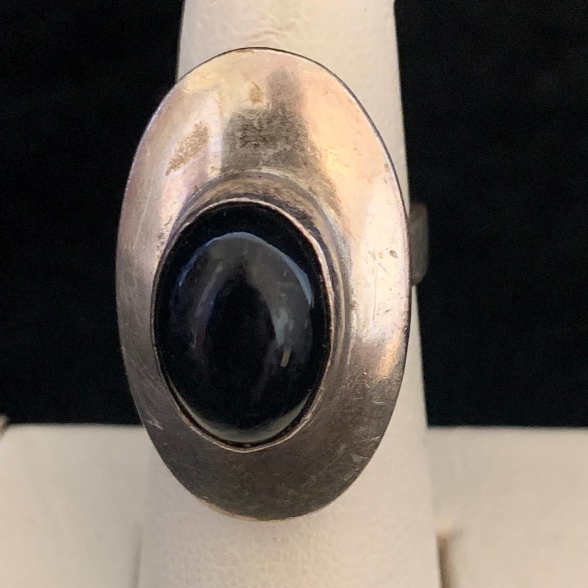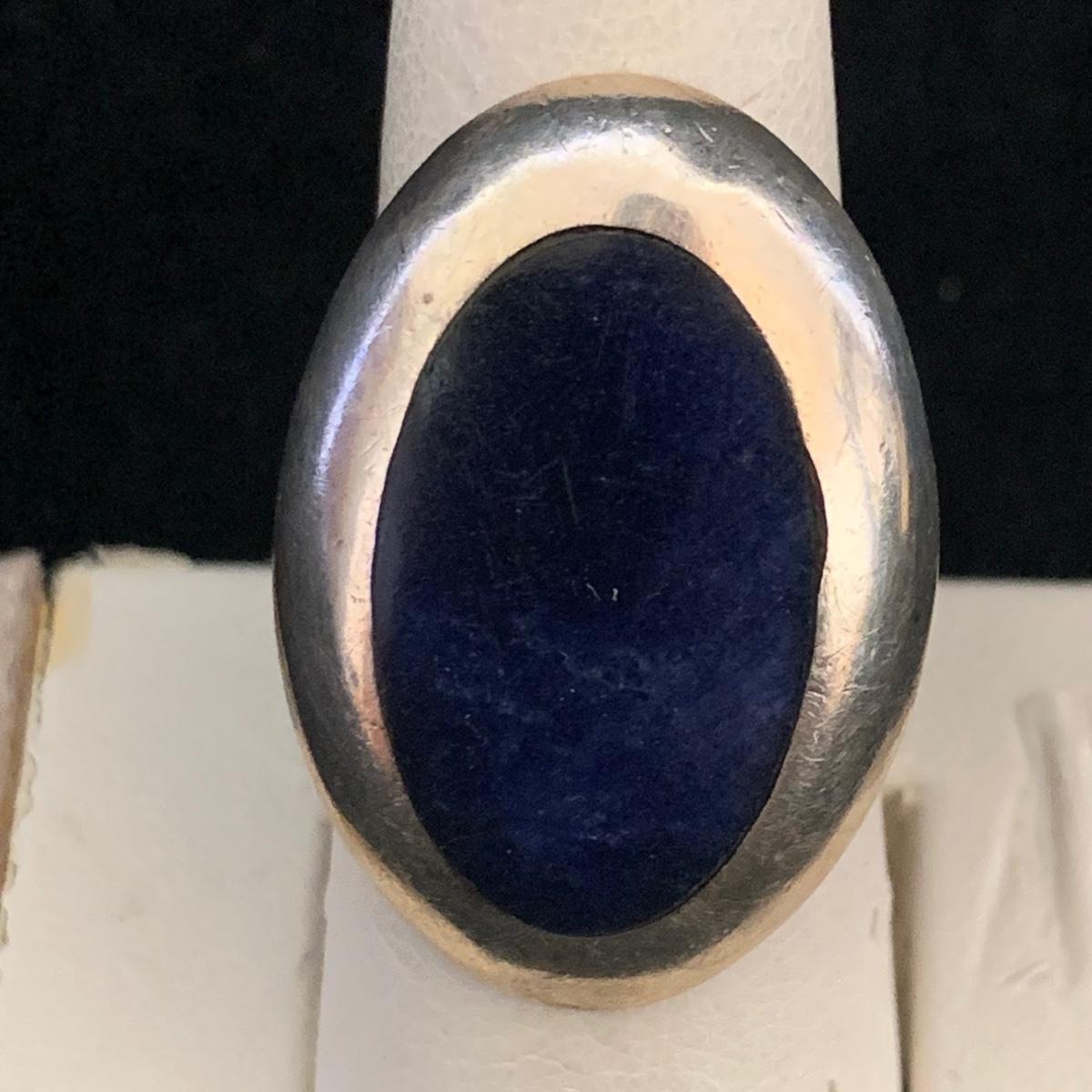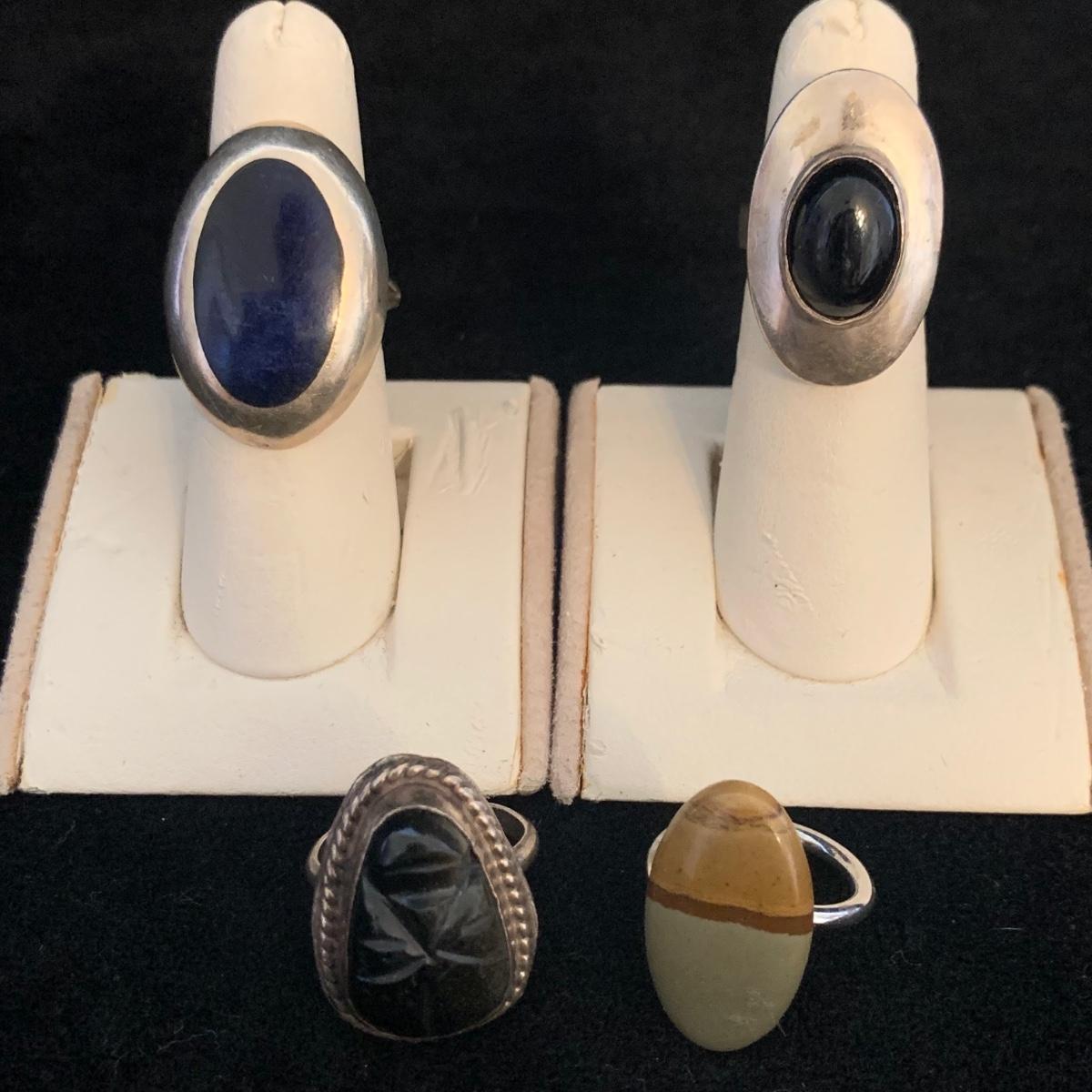 A collection of four rings. Three are marked “˜Sterling’ or “˜925’. One has an indecipherable marking. The large oval ring has a dark blue gemstone with the appearance of Lapis Lazuli. Two rings have black onyx-like stones; one is smooth and the other is carved. The last ring has a smooth gray and tan striated stone. Please see photos for all markings and size details.