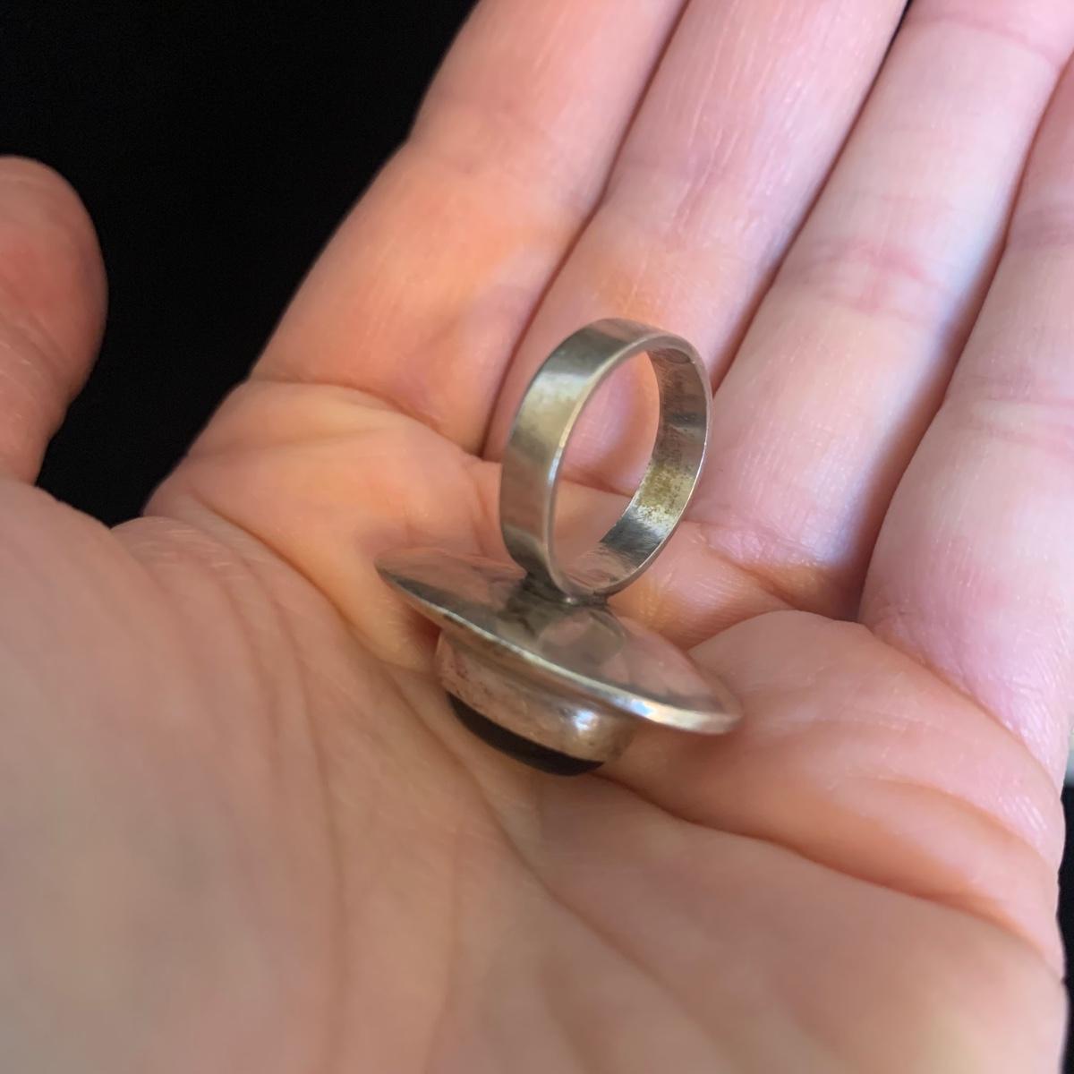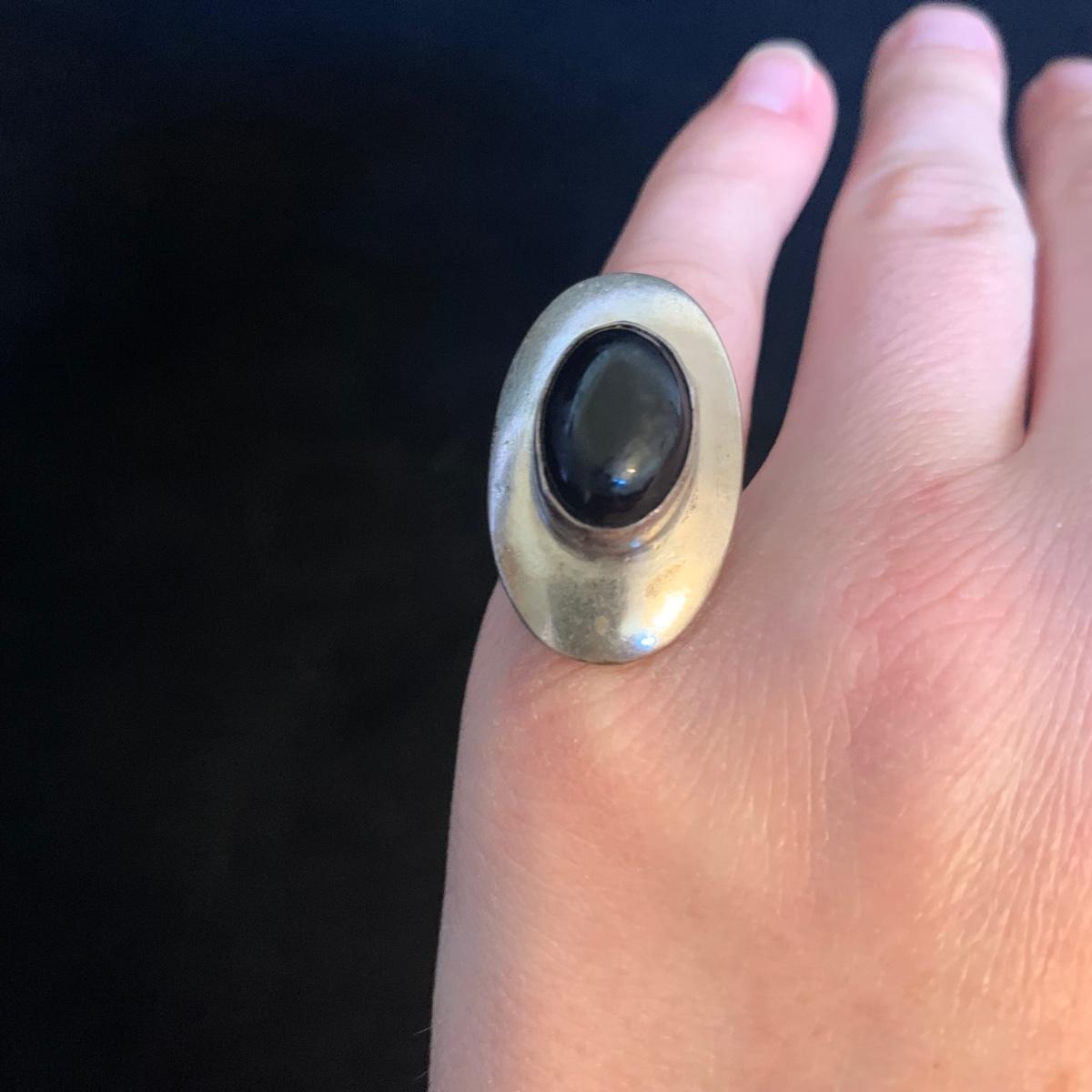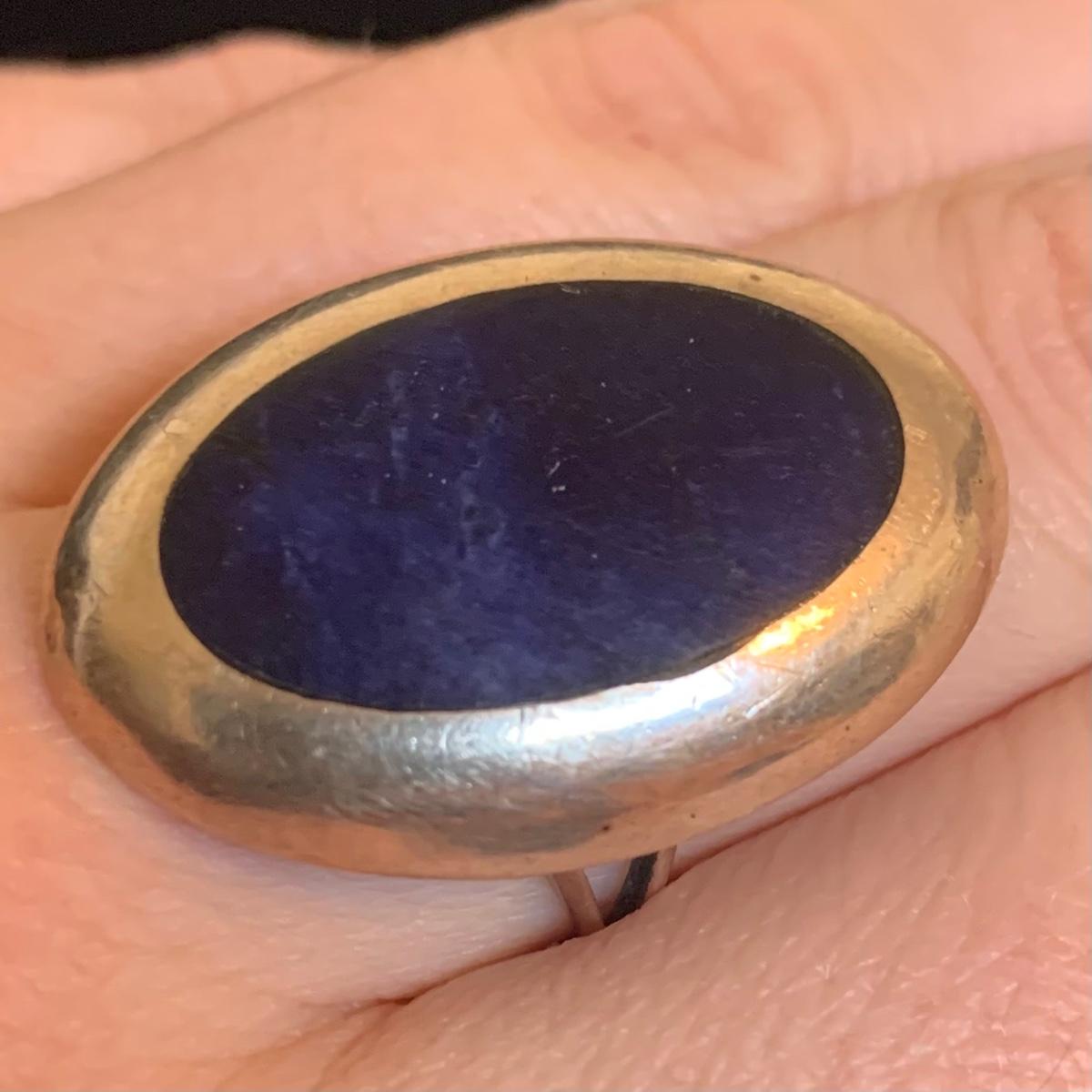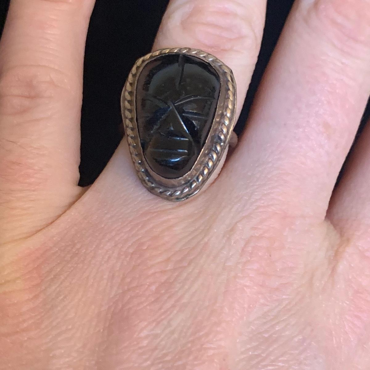 A collection of four rings. Three are marked “˜Sterling’ or “˜925’. One has an indecipherable marking. The large oval ring has a dark blue gemstone with the appearance of Lapis Lazuli. Two rings have black onyx-like stones; one is smooth and the other is carved. The last ring has a smooth gray and tan striated stone. Please see photos for all markings and size details.