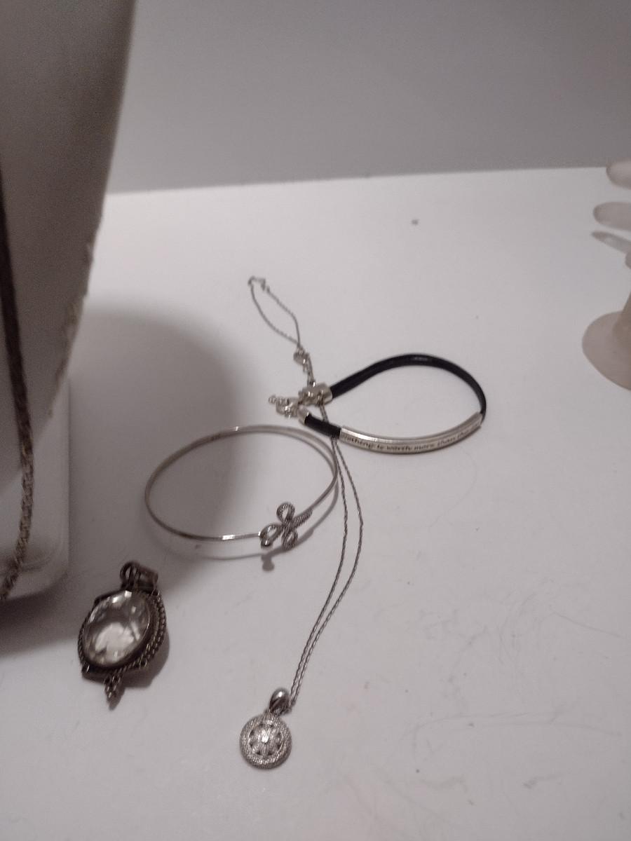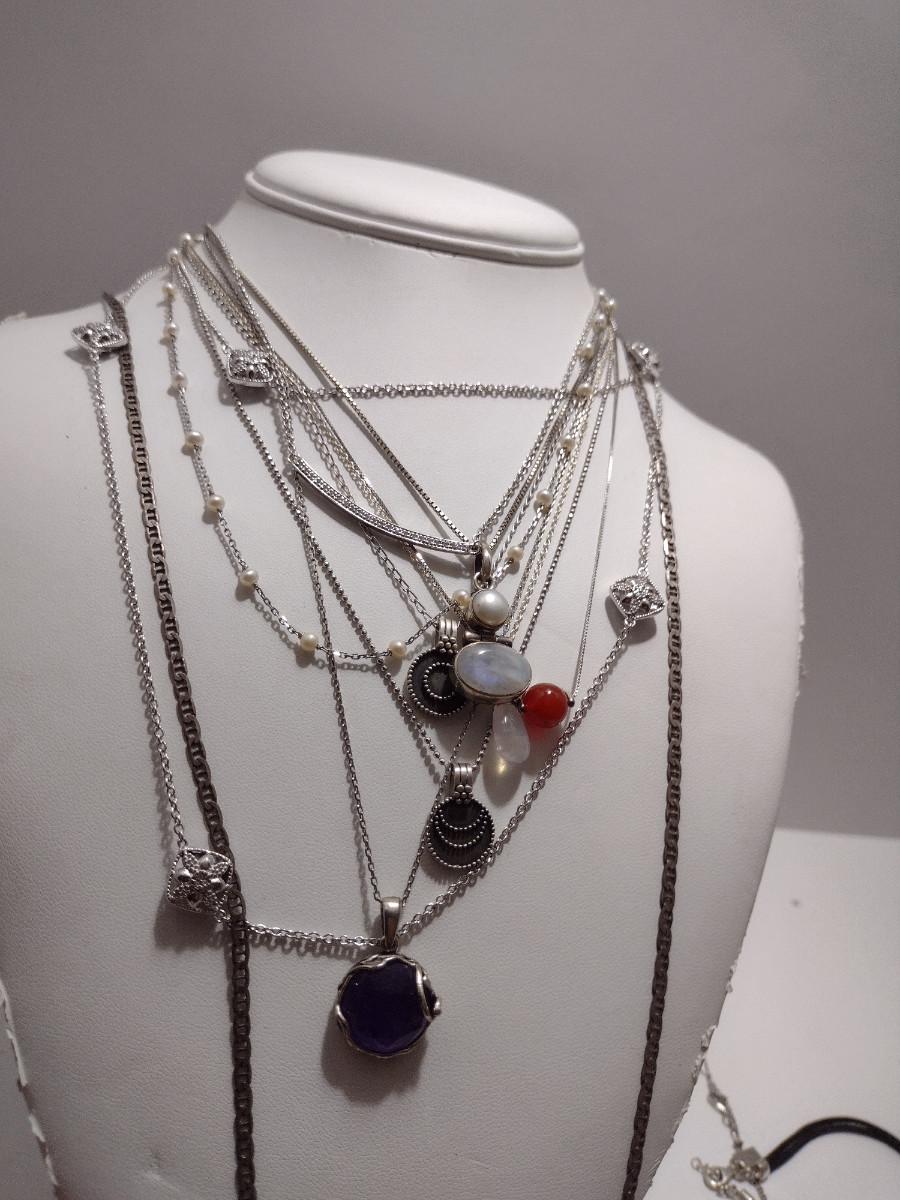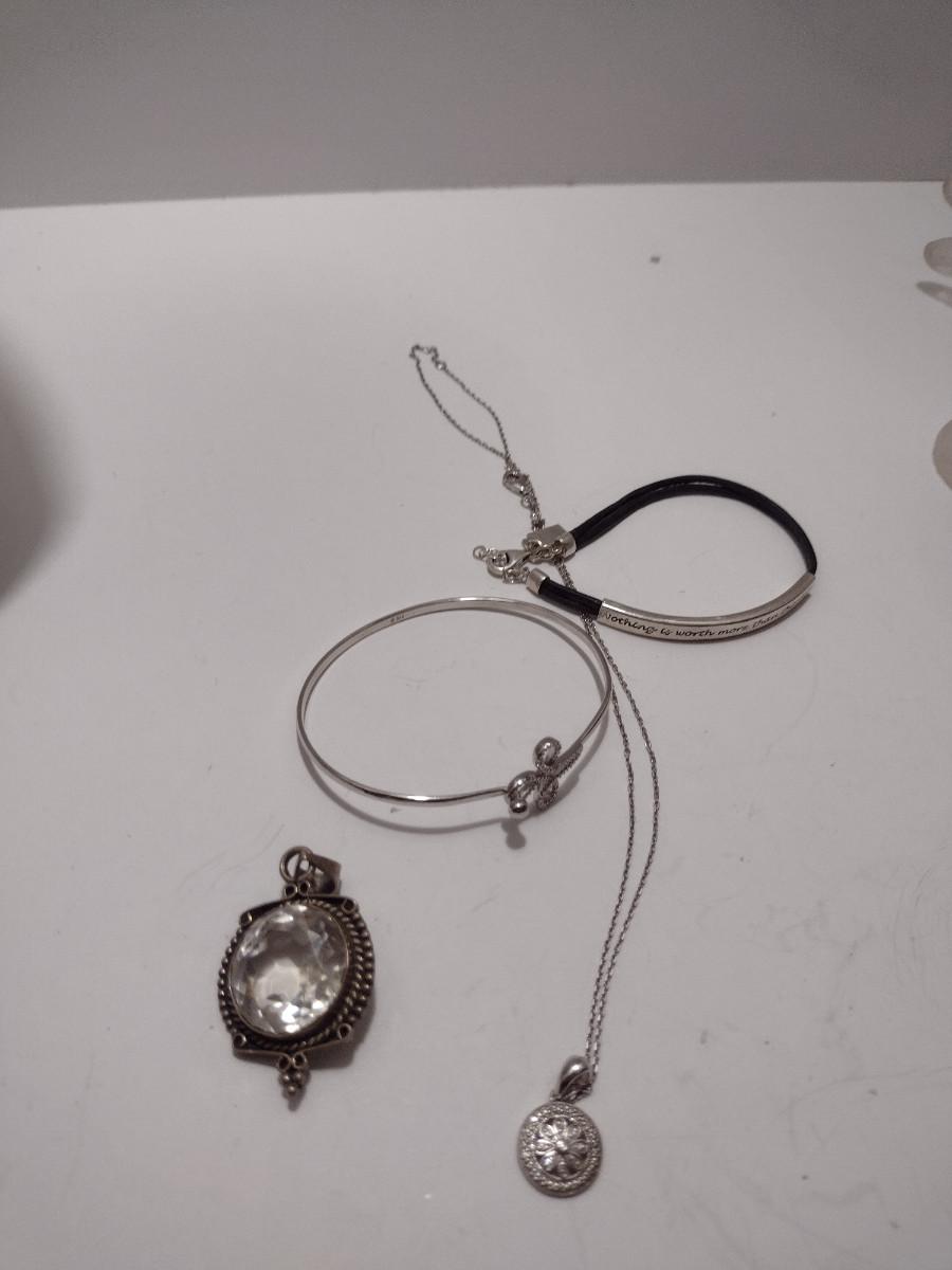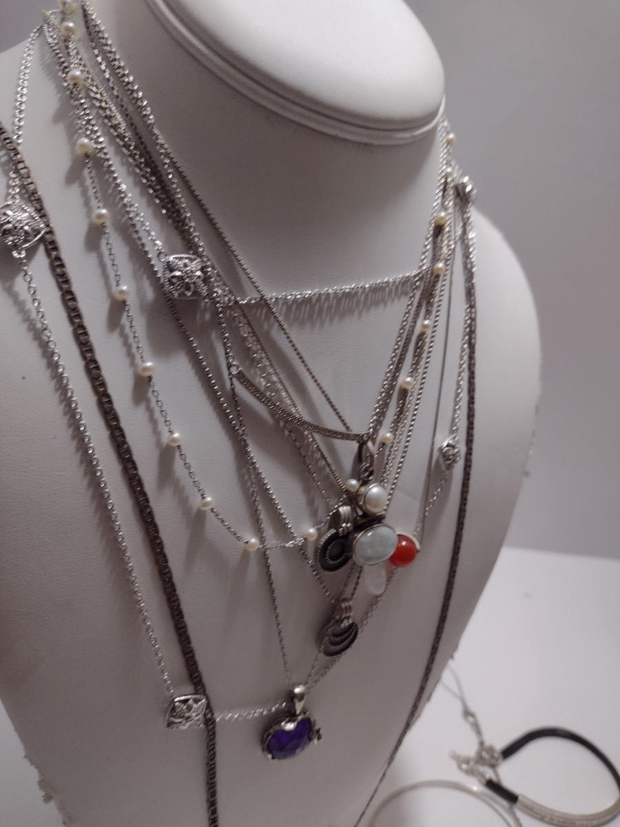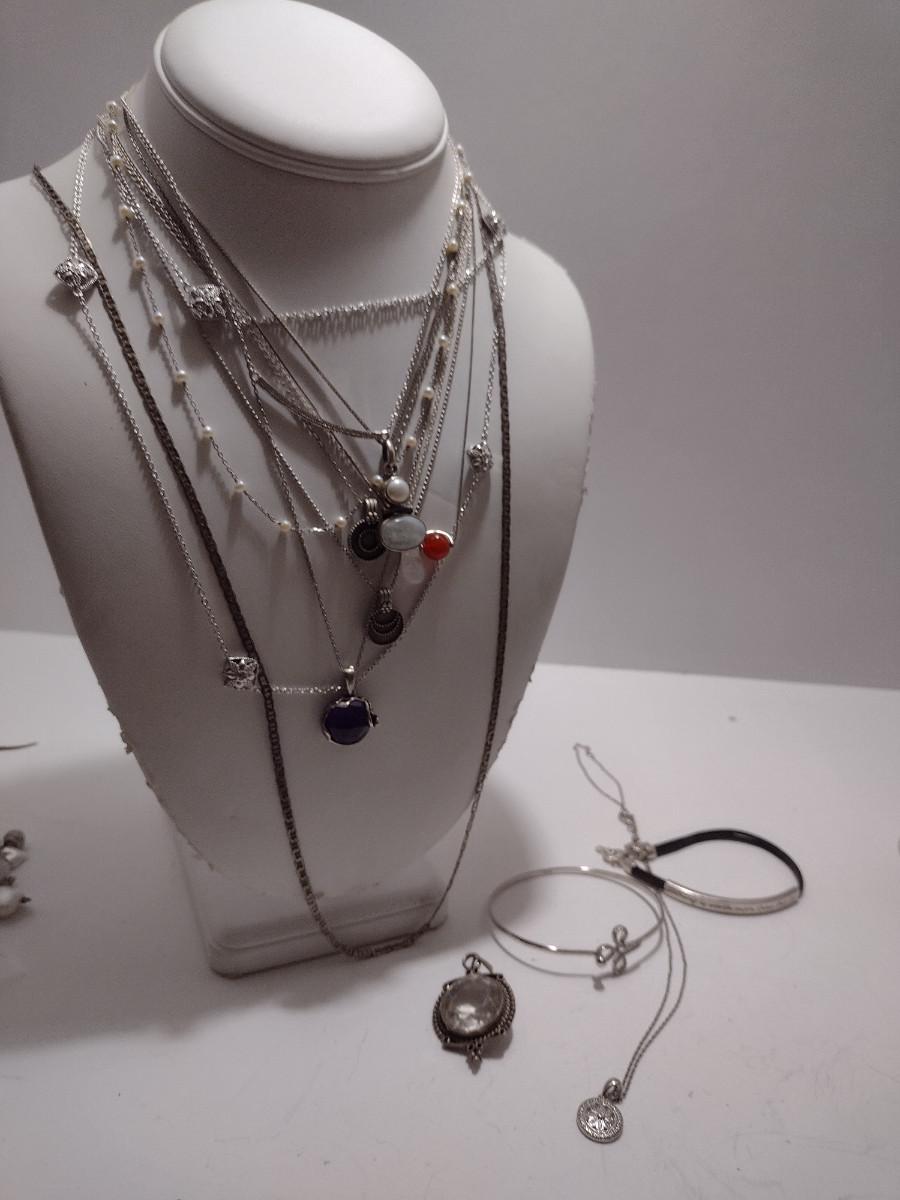 Collection of Sterling Silver Jewelry- Necklaces, Pendants, Bracelets (#34). Some necklaces are tangled and will need attention.