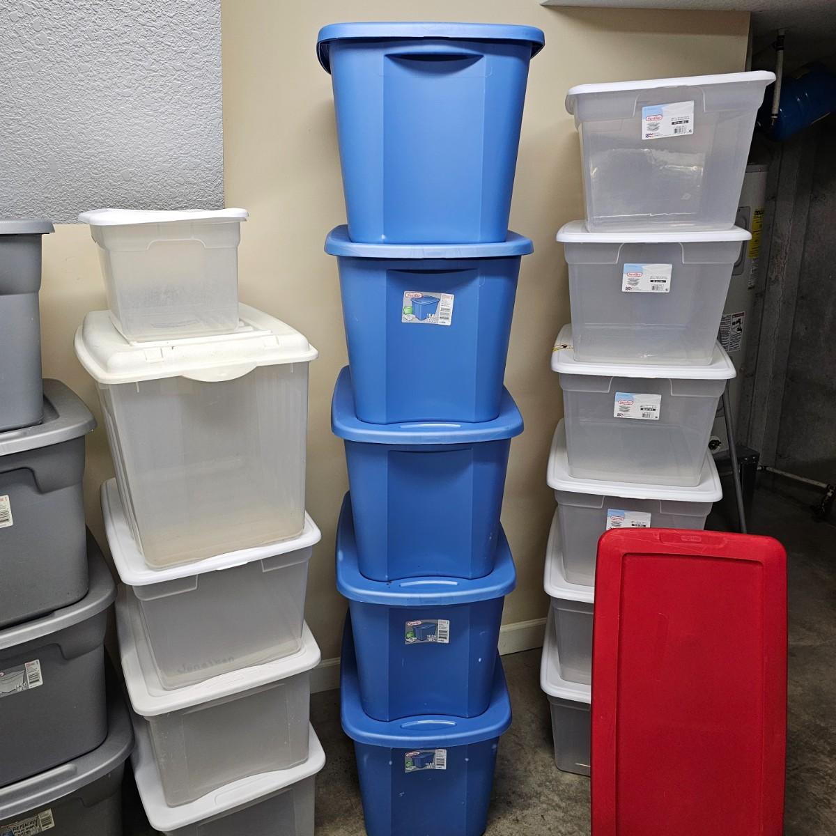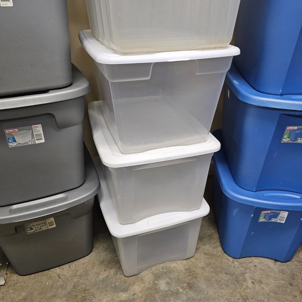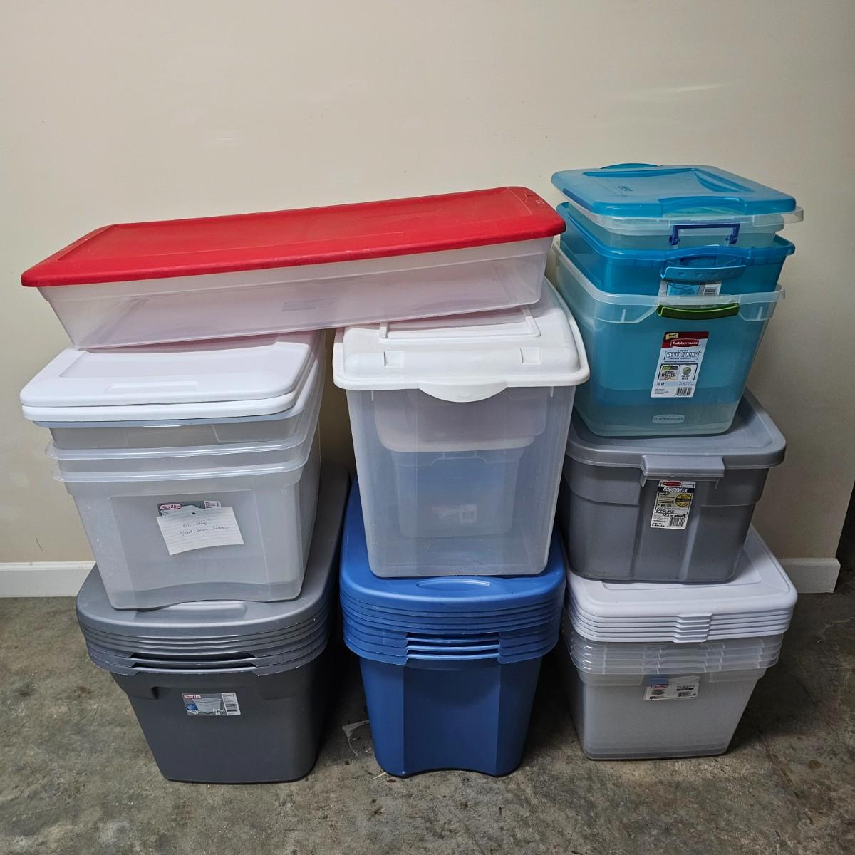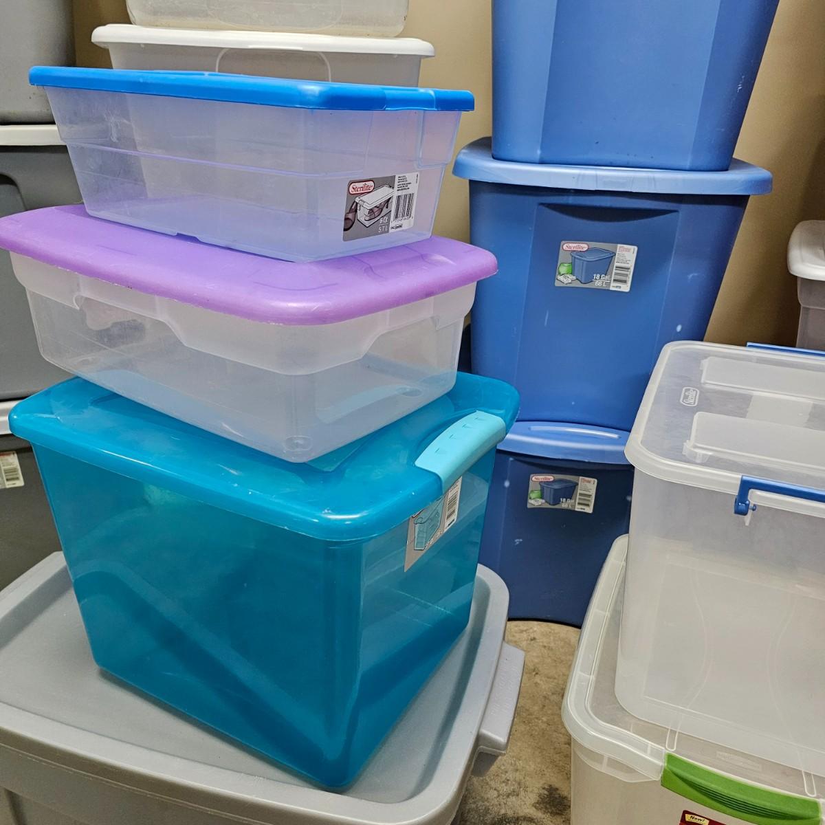 Most all Sterlite brand containers, different sizes. From shoebox size to 18 gal capacity. All items with lids. 27 pieces in all. See photos for details. Local pickup only.