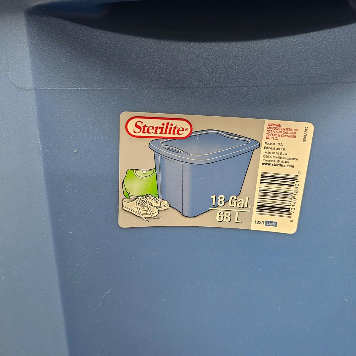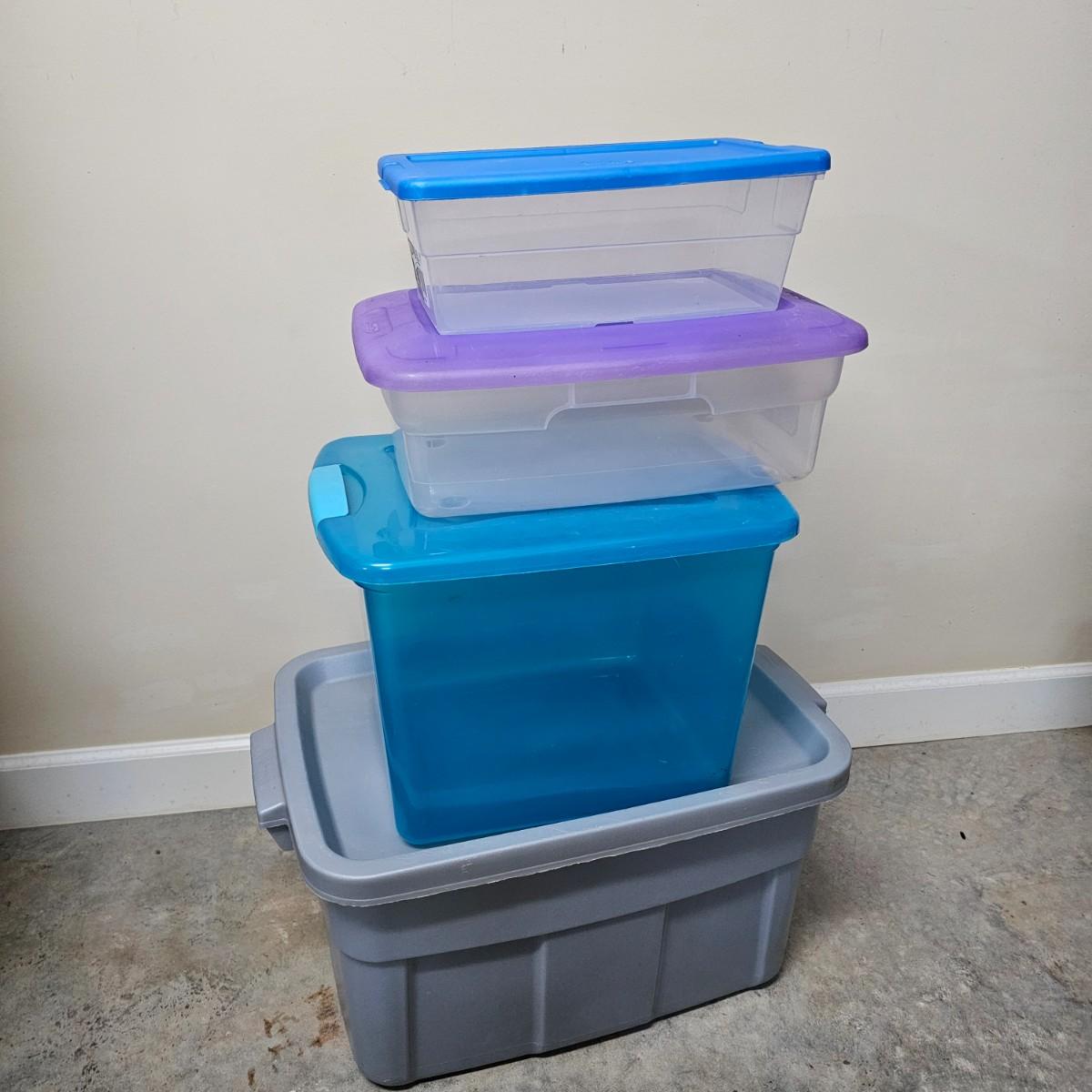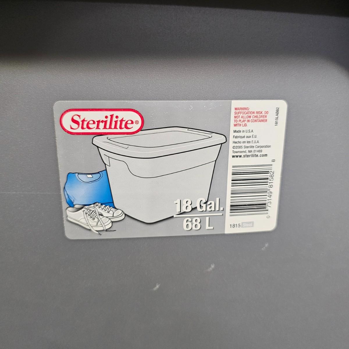 Most all Sterlite brand containers, different sizes. From shoebox size to 18 gal capacity. All items with lids. 27 pieces in all. See photos for details. Local pickup only.