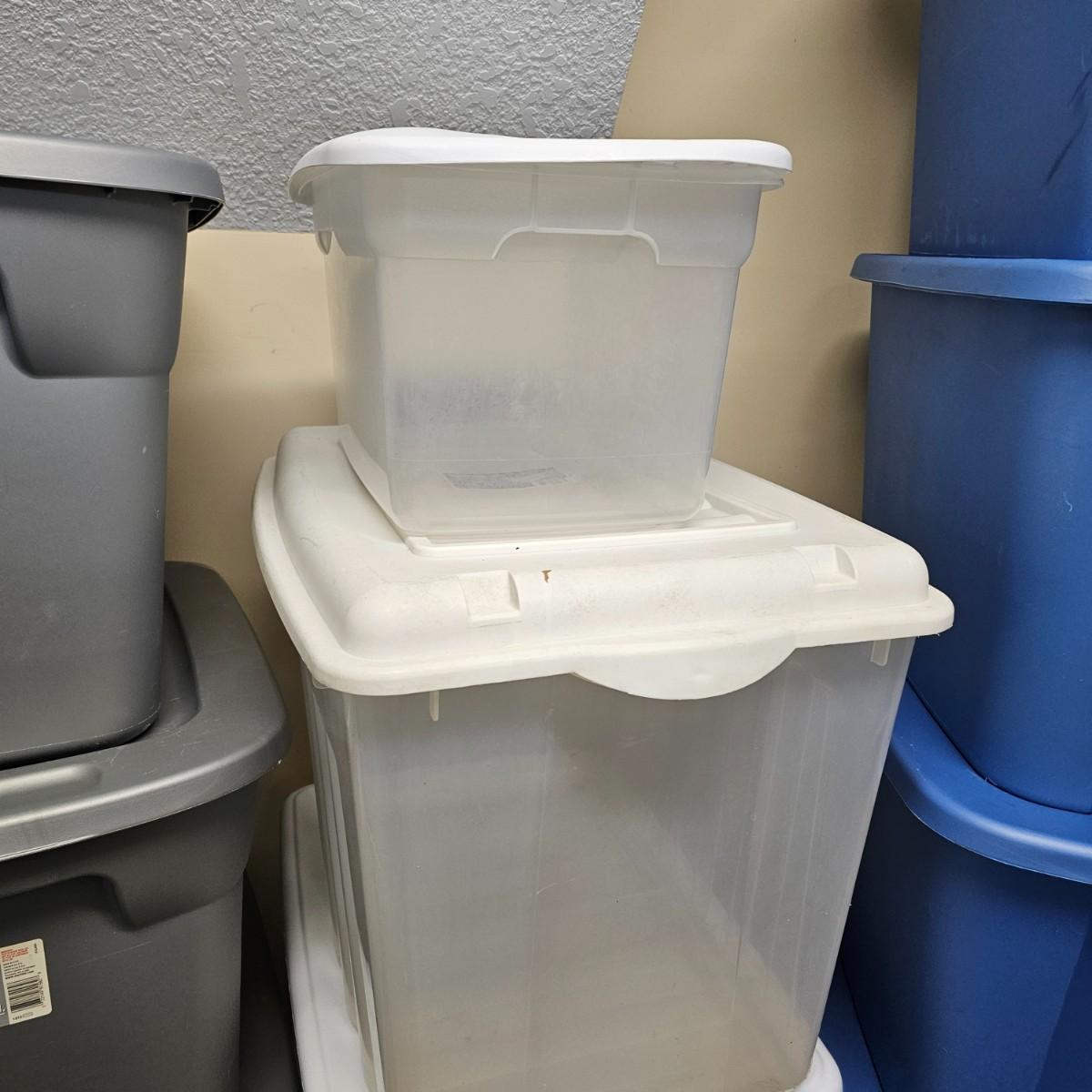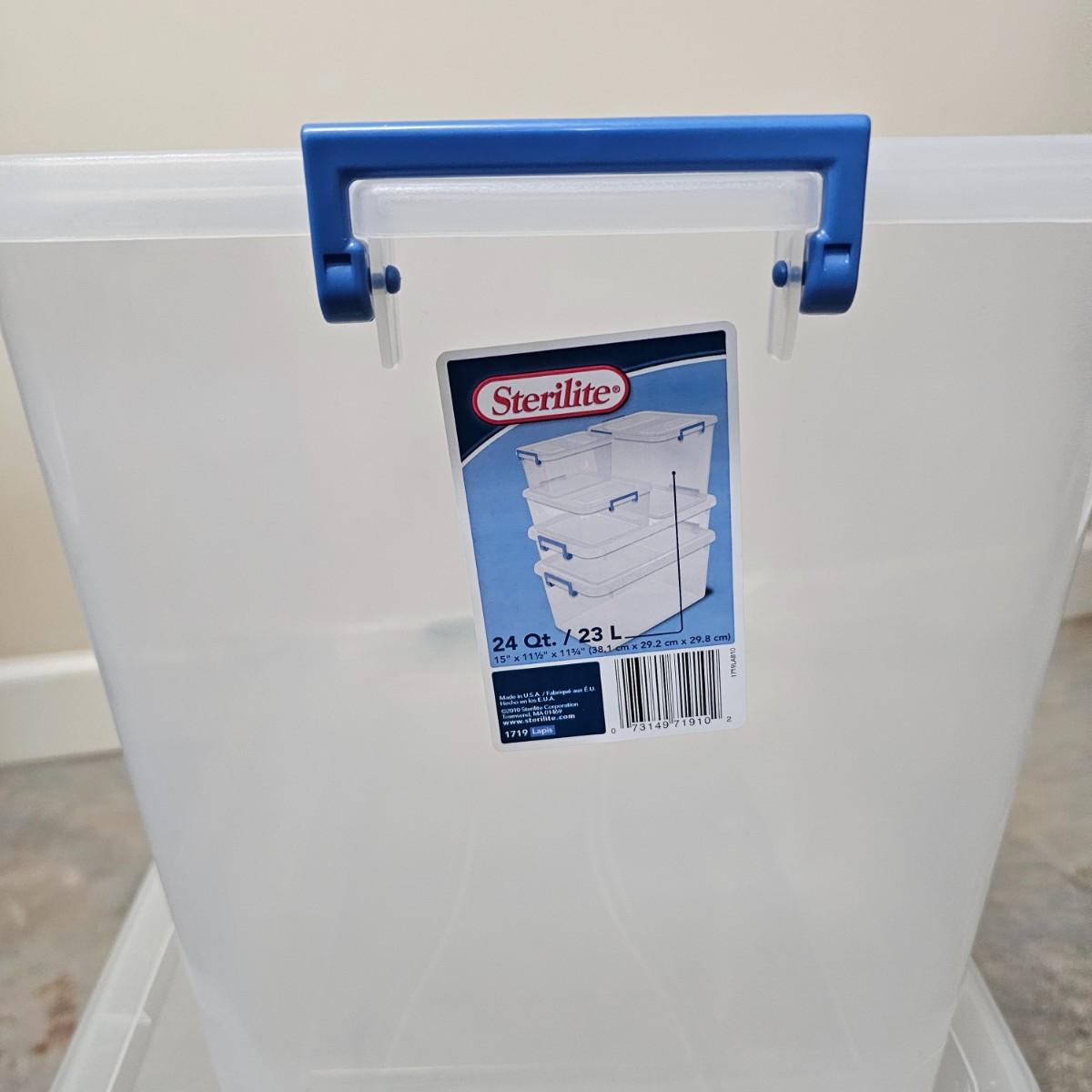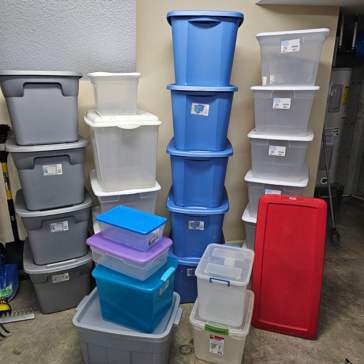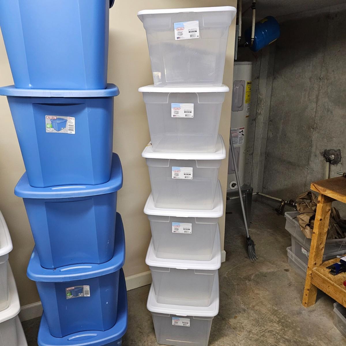 Most all Sterlite brand containers, different sizes. From shoebox size to 18 gal capacity. All items with lids. 27 pieces in all. See photos for details. Local pickup only.