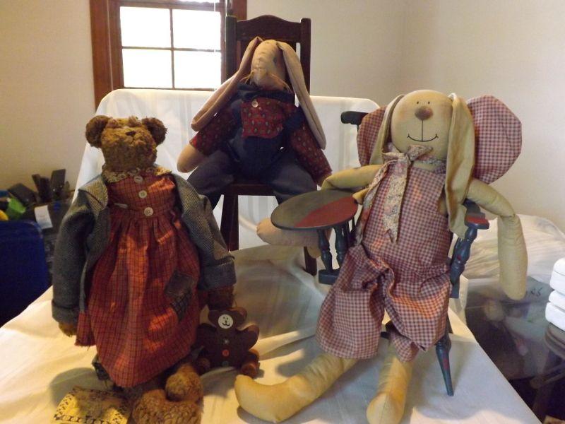 Two rabbits, one bear and 2 doll chairs. **Please read Terms and Conditions before placing a bid. Pick up is Sunday, September 15, 2019 from 11am to 4pm and Tuesday, September 17 from 4pm-7pm in Sicklerville. All sales are final. All sales are as is, where is. Please review all photos. Any props included in photos are not included in listing. All measurements are approximate.