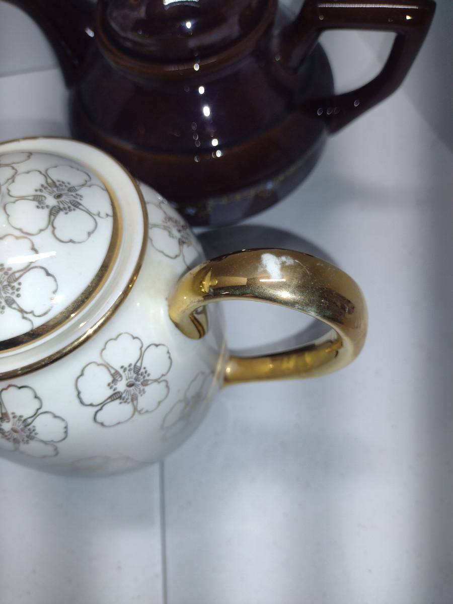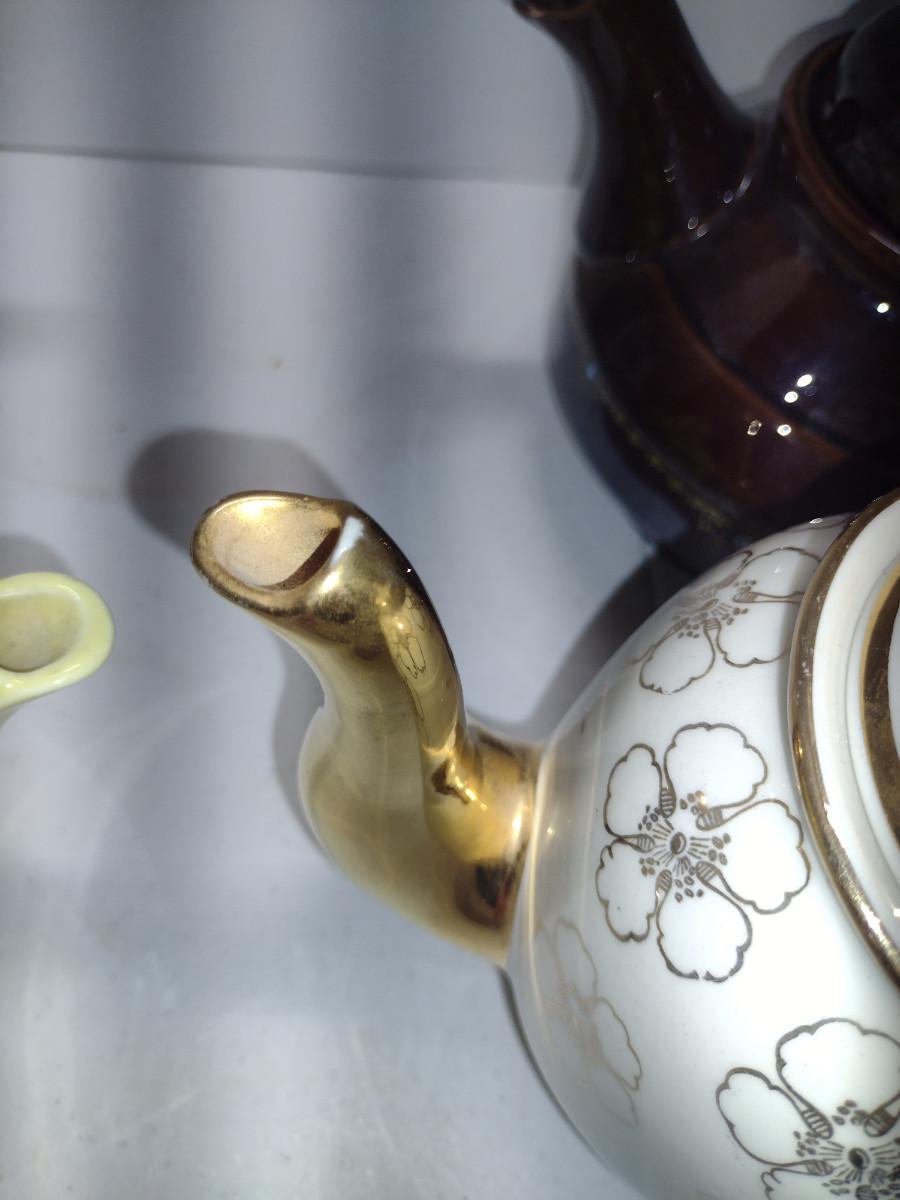 Collection of Tea Pots- Assorted Makers- Four Pieces. Items have some chipping and wear to finish.