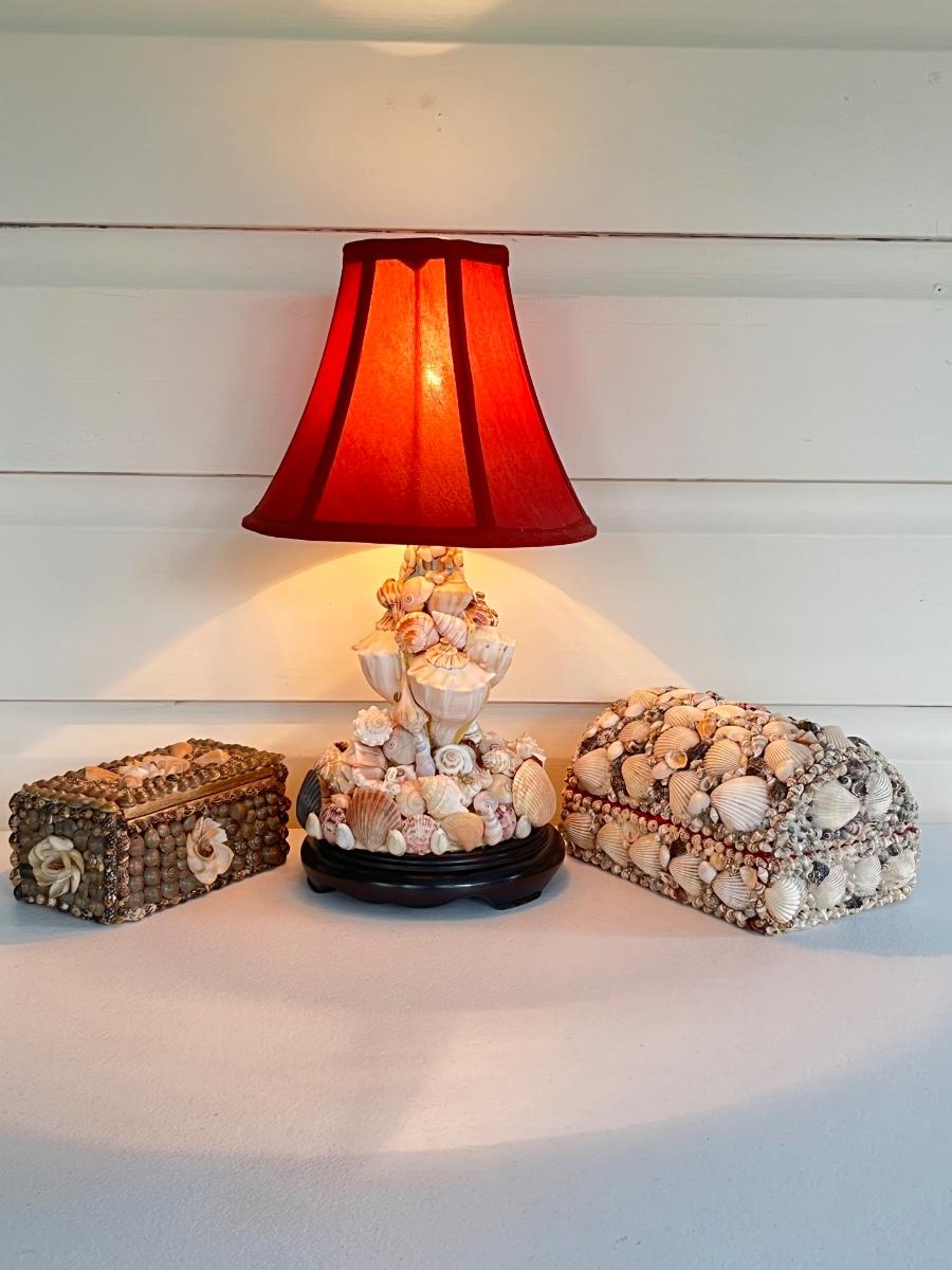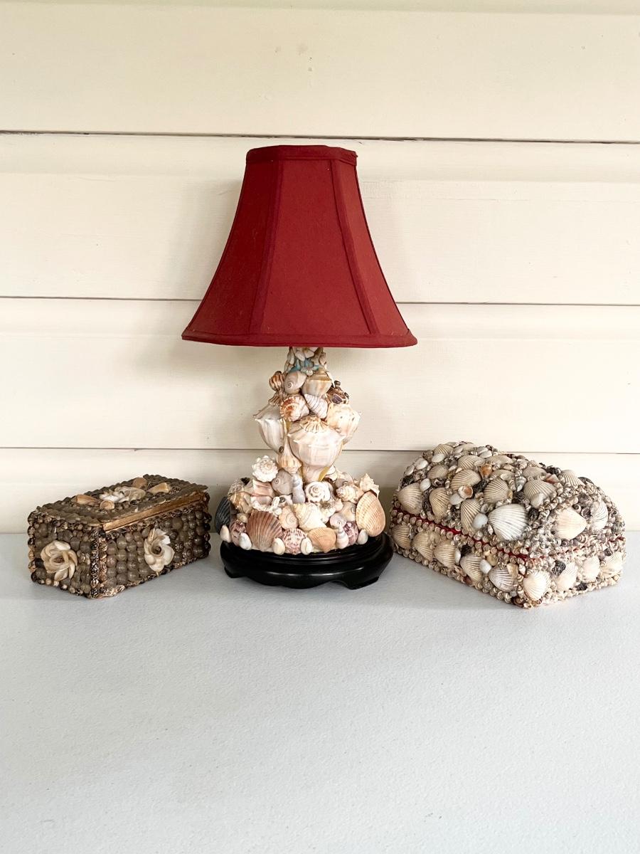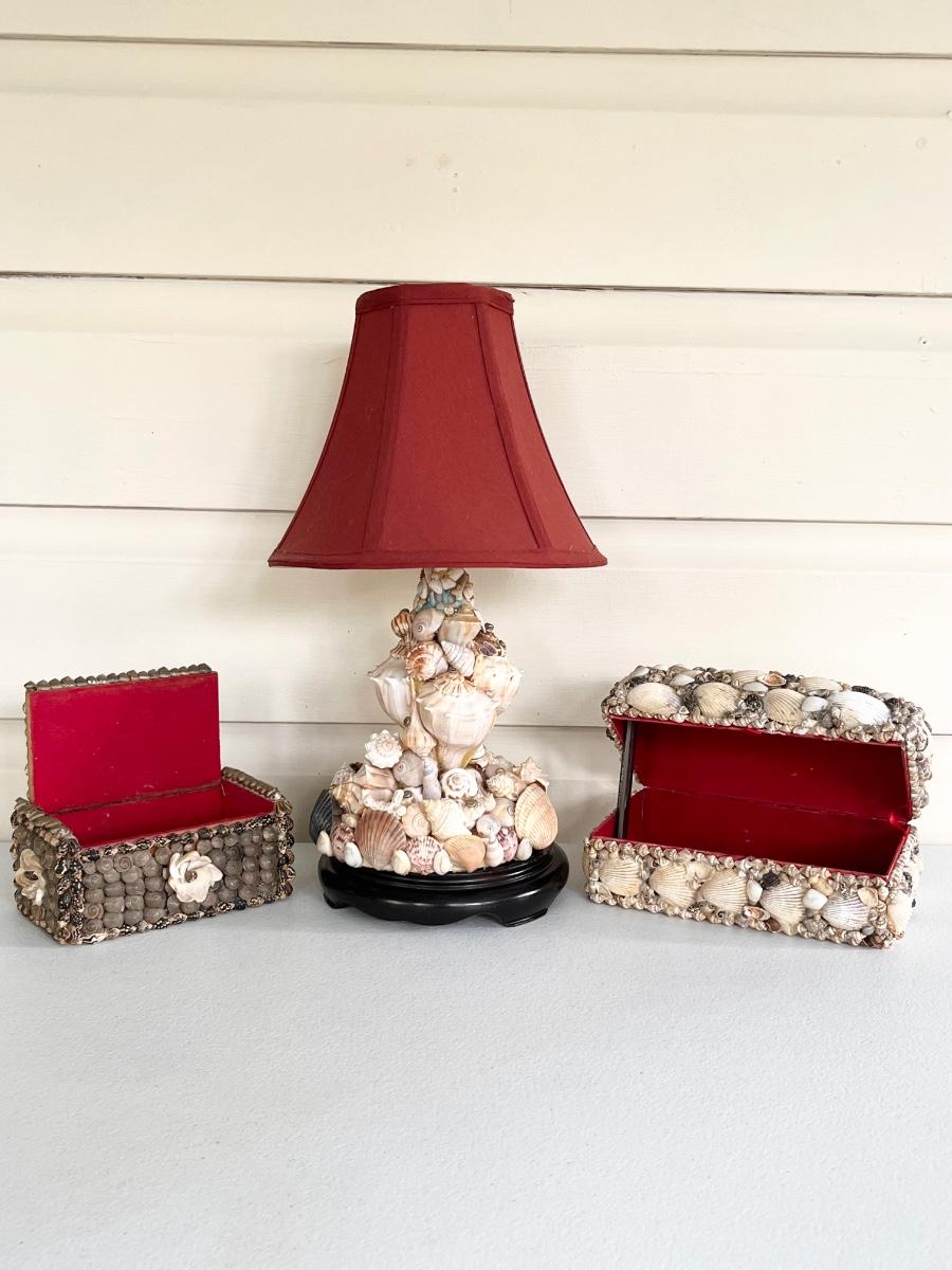 (1) Lamp with wood stand 17” H 9” Round Shade ~ (1) Box 3” H x 7” W x 4” D ~ (1) Box 4.5” H x 9” W x 6” D