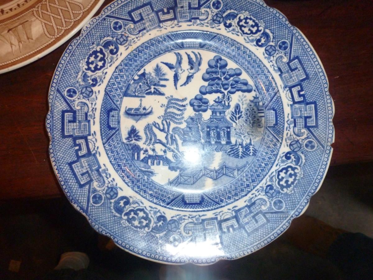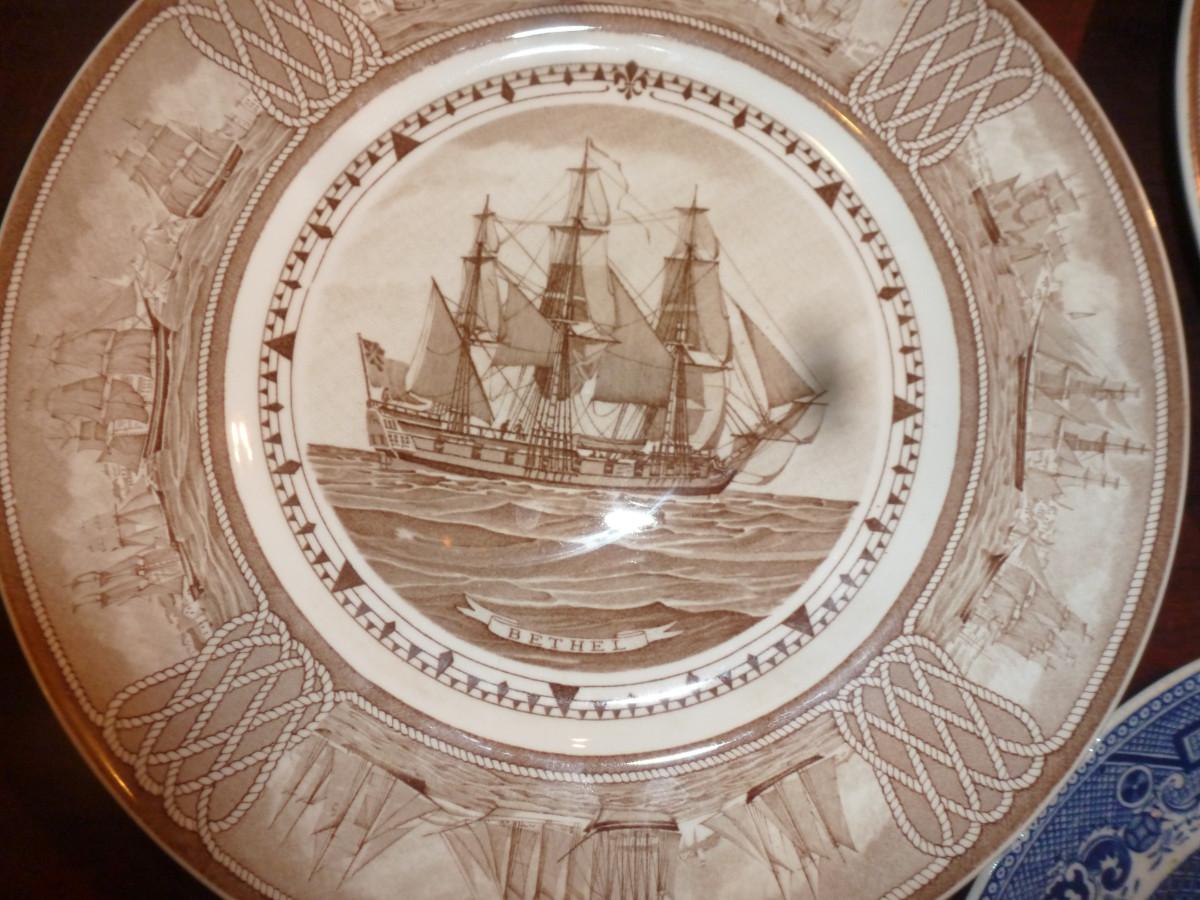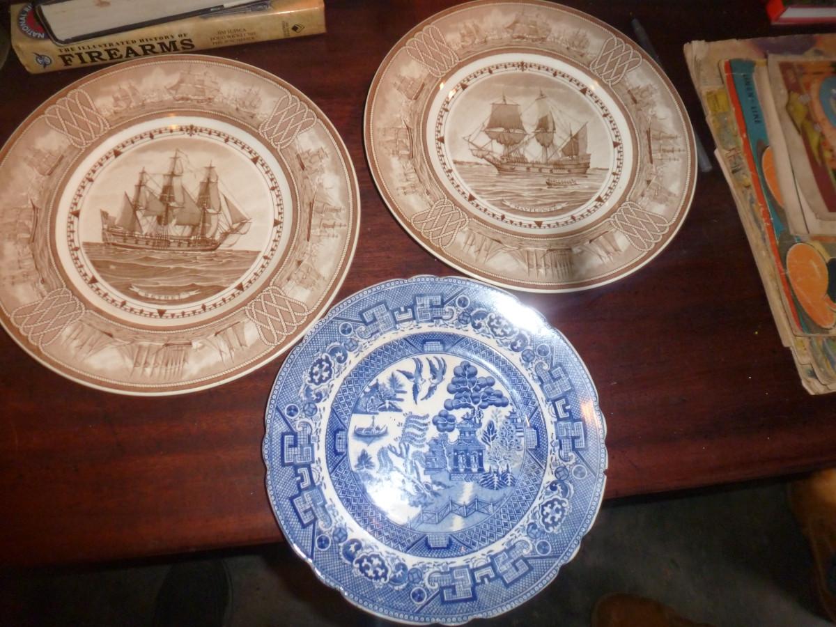 Collection of Three Plates- One Blue Willow and Two American Sailing Ships