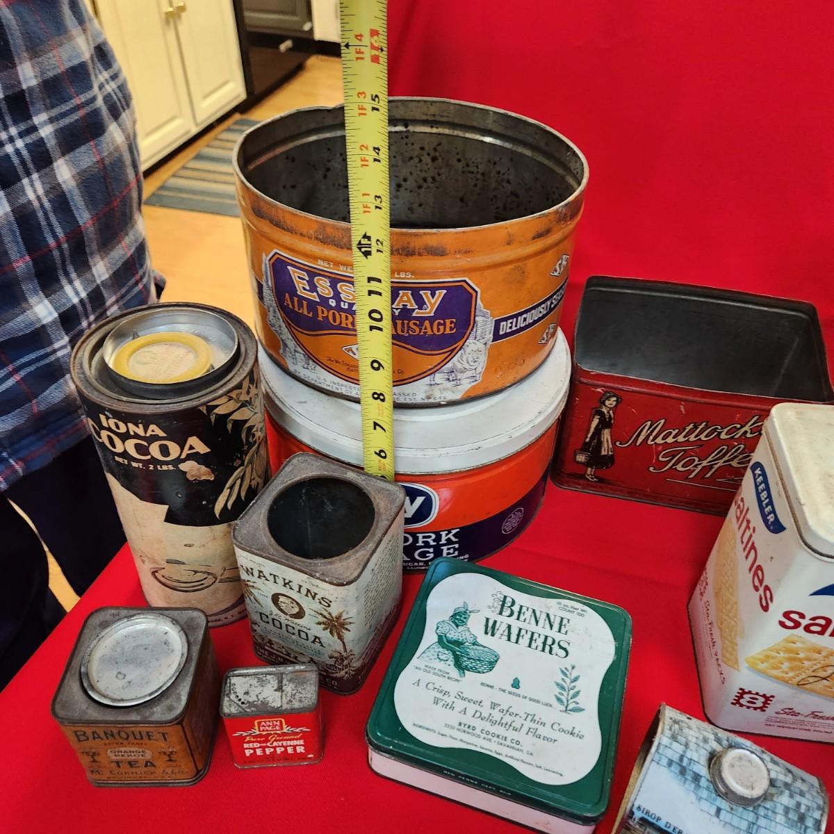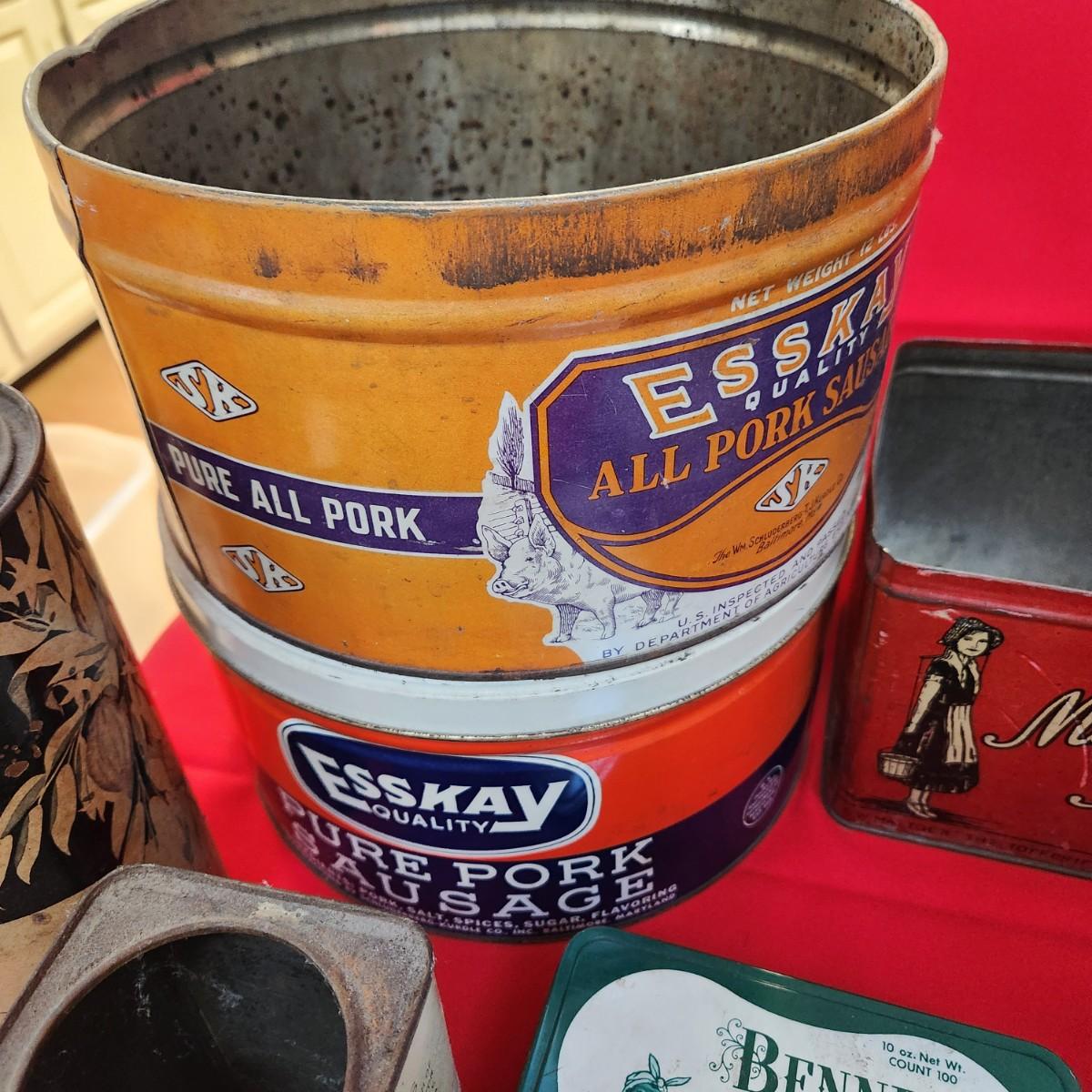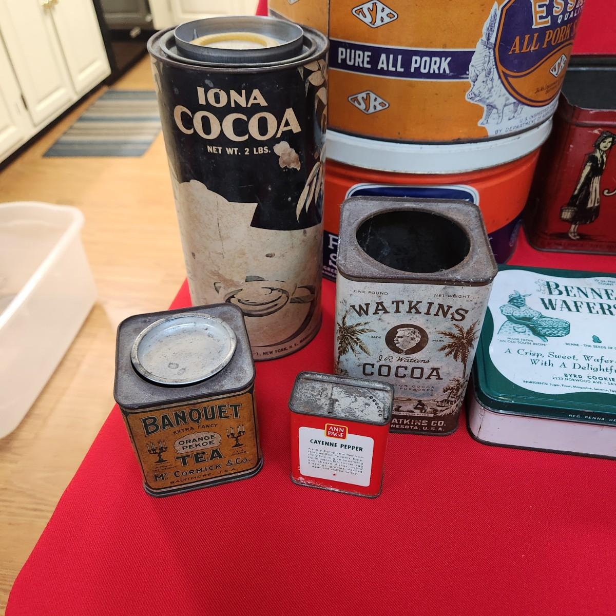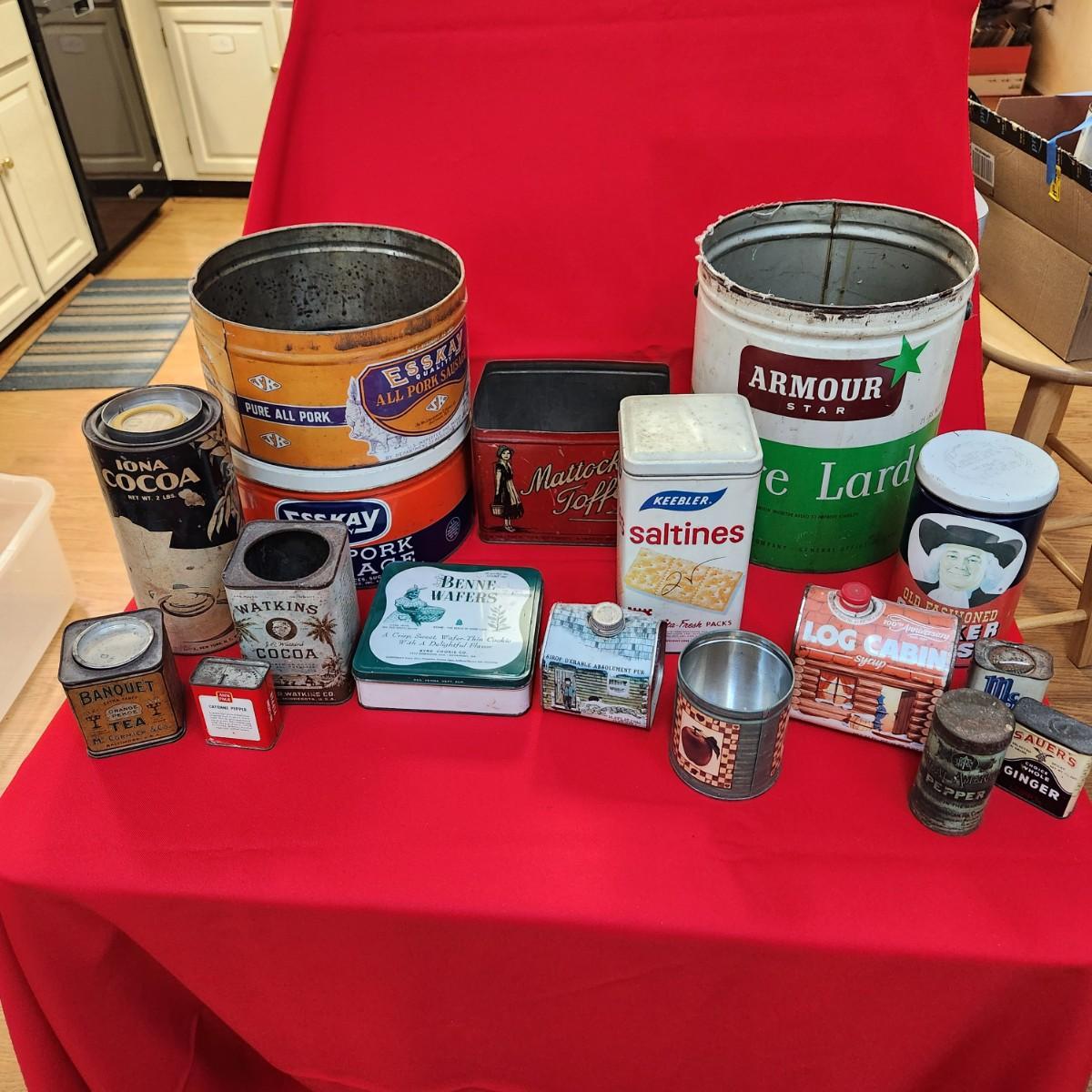 Collection of Tin Cans Esskay Meats Armour Lard Watkins Cocoa , Banquet Tea , McCormick Spices