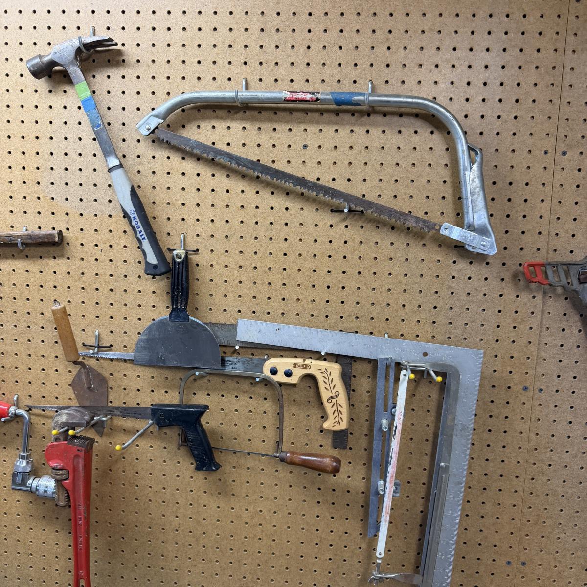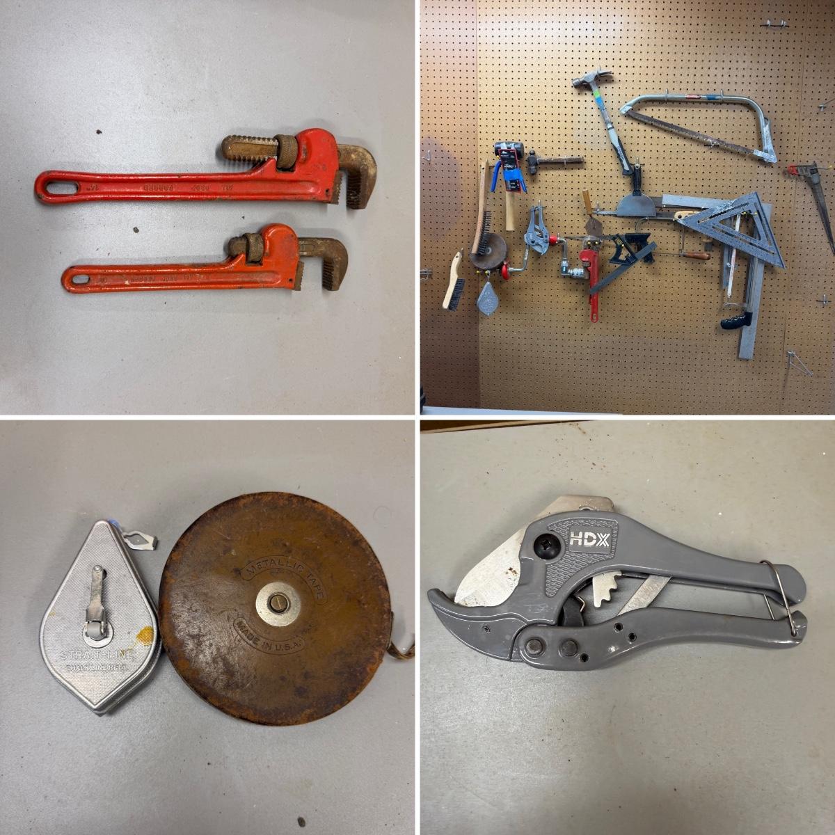 Lot includes saws, hammer, ball peen hammer, rubber hammer 12” metal square, hand drills, PVC cutters, chalk line, hand drill and more.