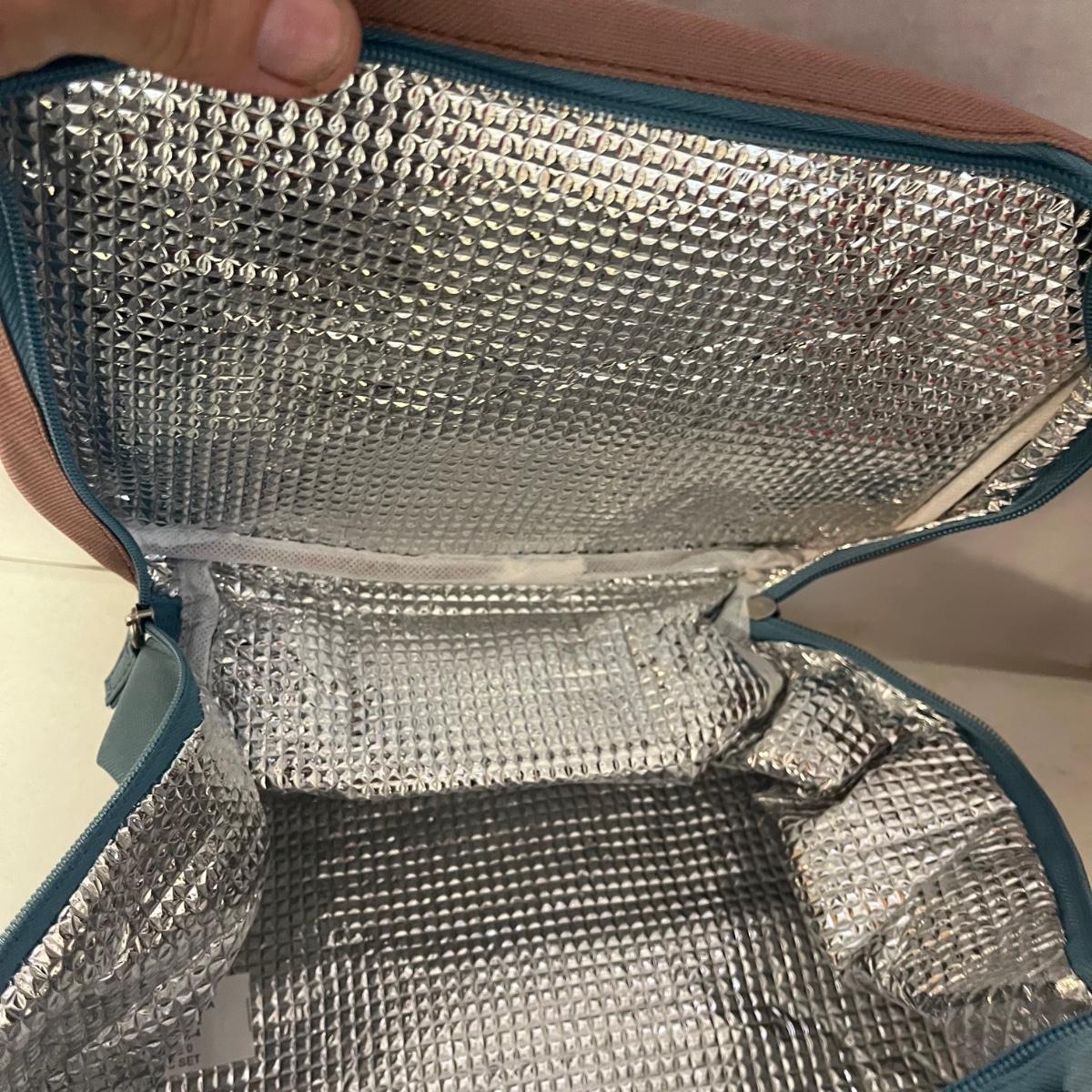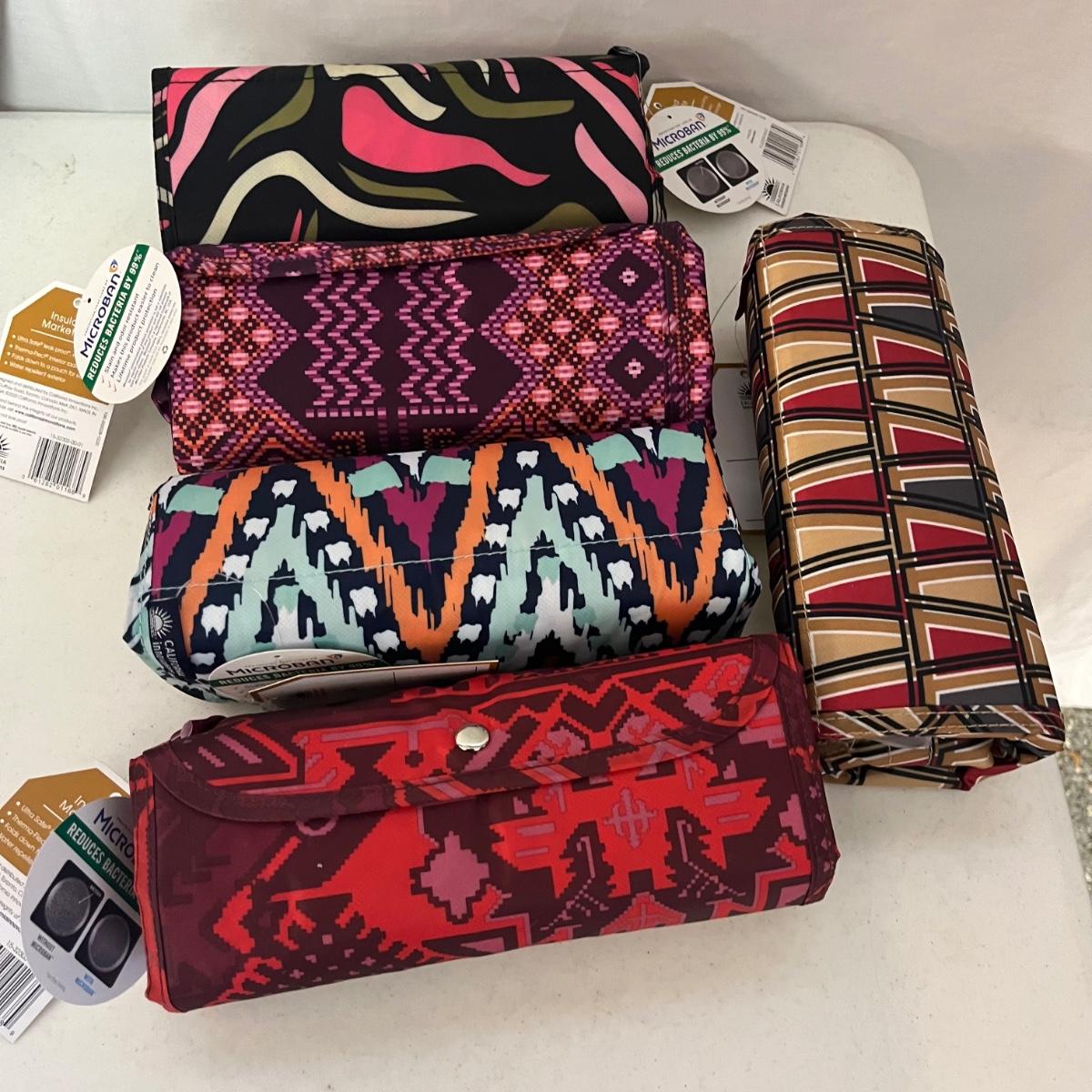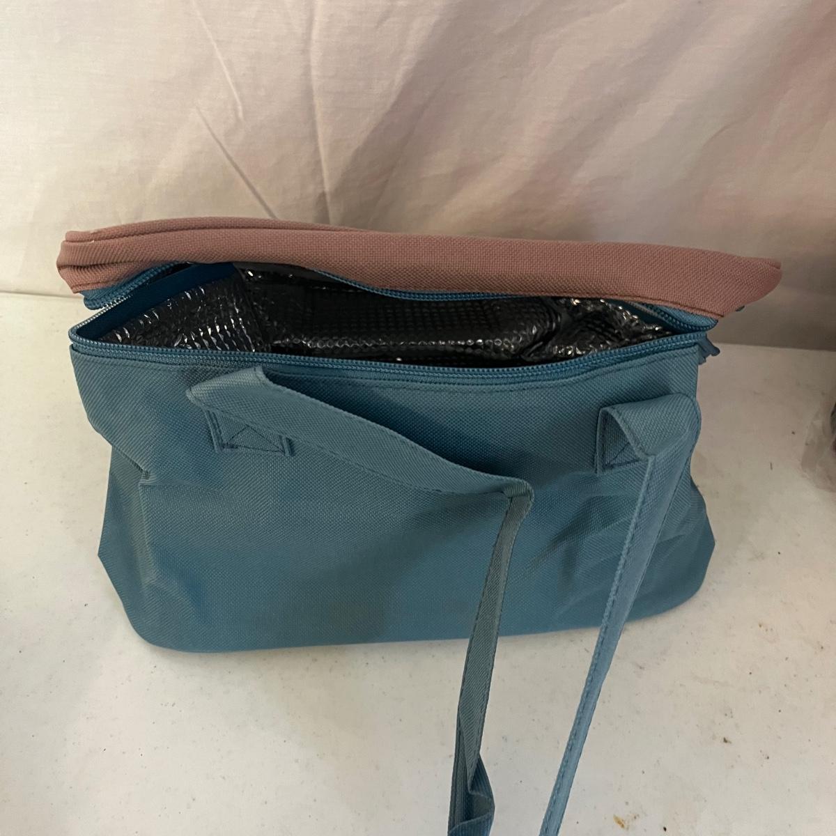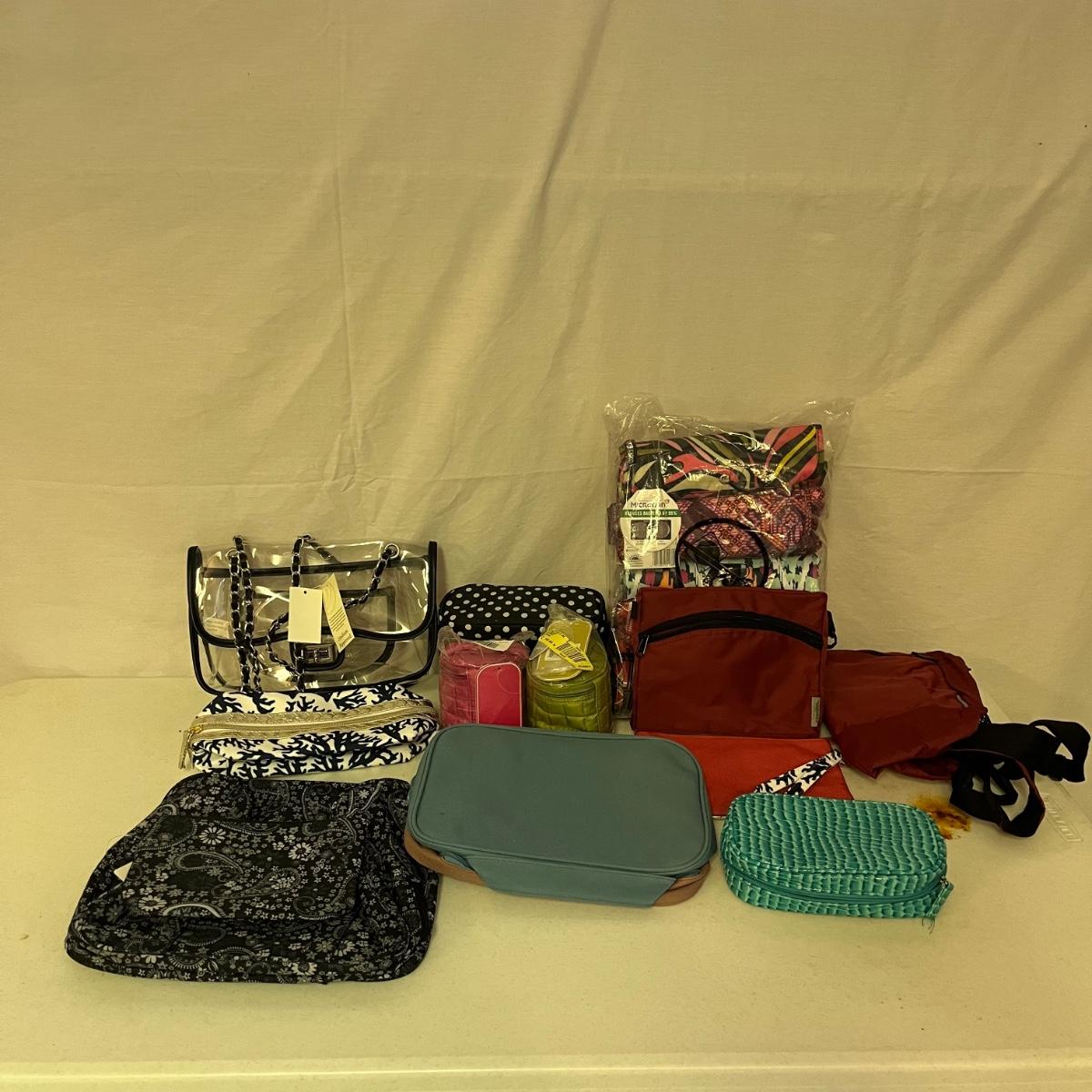 Lot includes five insulated market totes, stadium clear purse, Magellans backpack and flat bag, blue and tan tote bag that measures 21” x 7” x 16”. Also includes small insulated cooler bag and more.