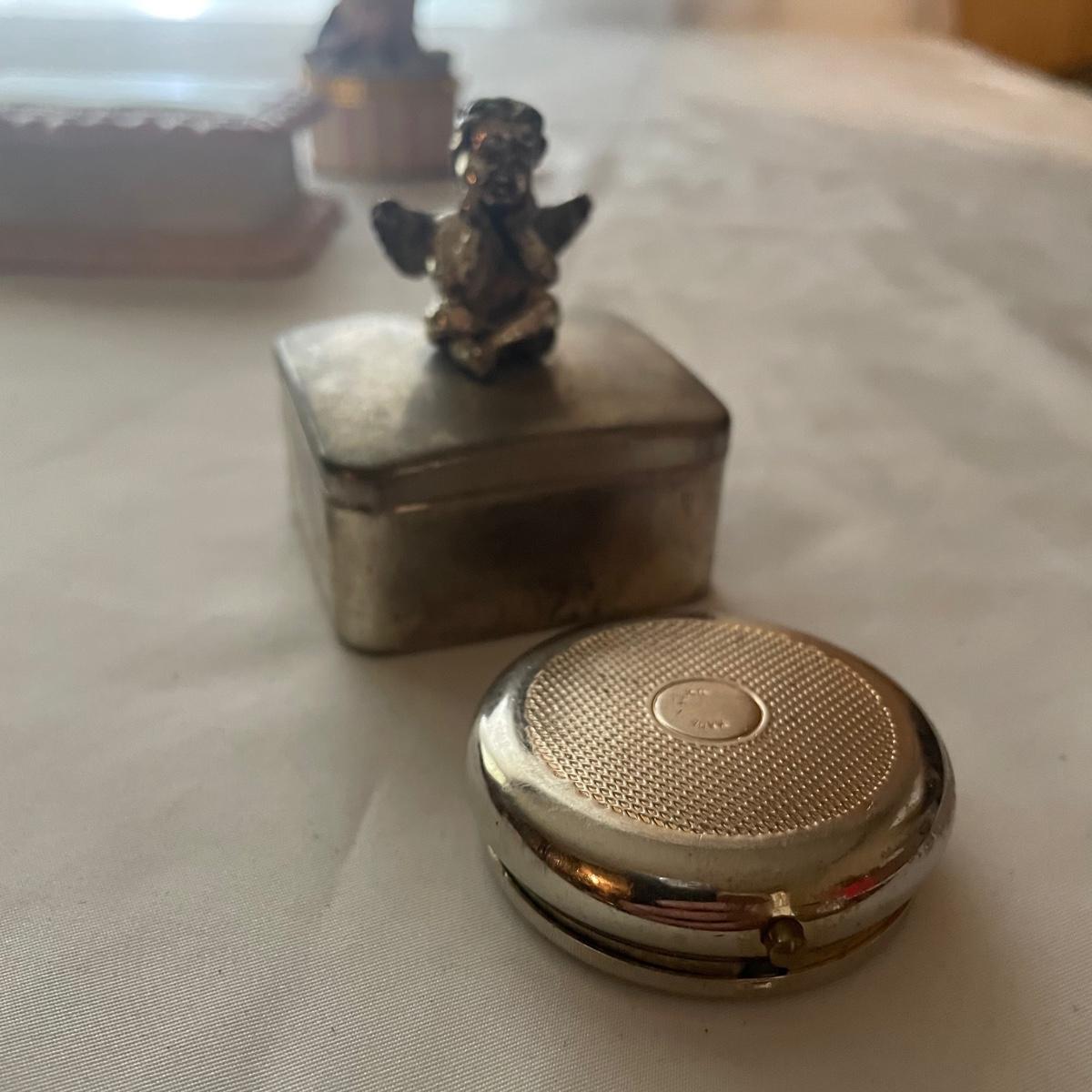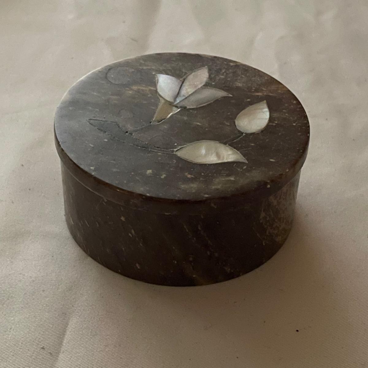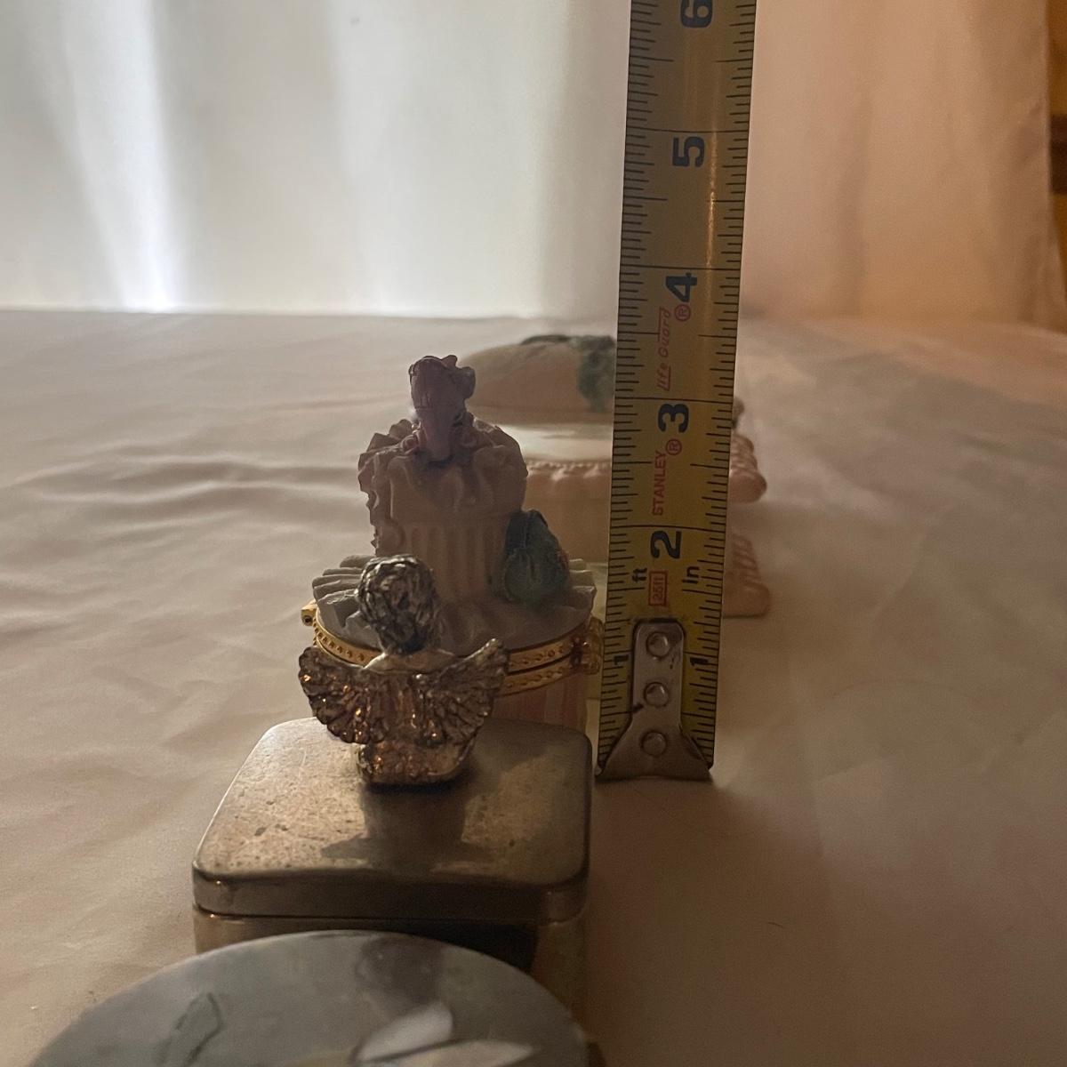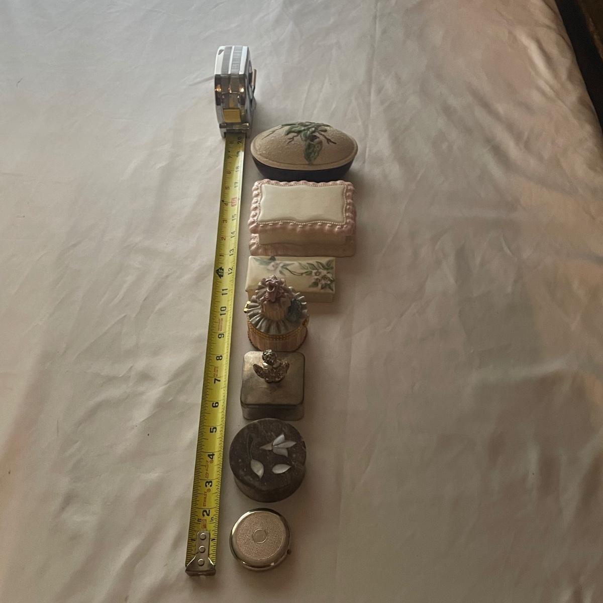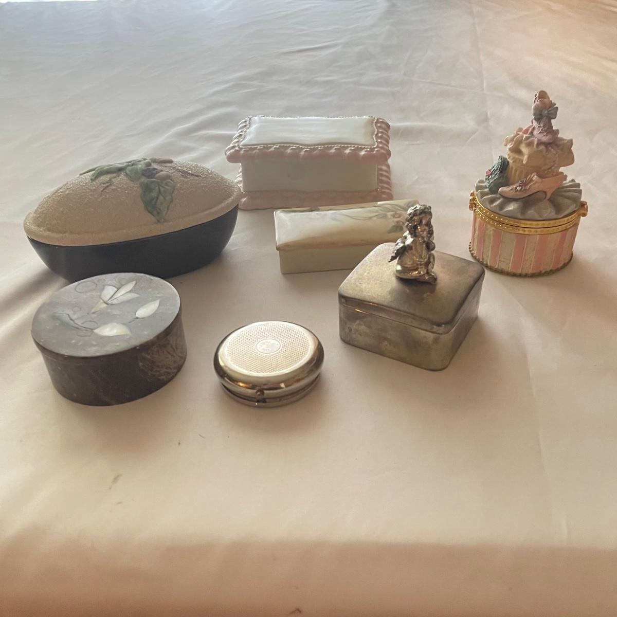Seven trinket boxes total that includes porcelain, silver plated, a handmade stone like circular box with a Pearl like floral inlay.