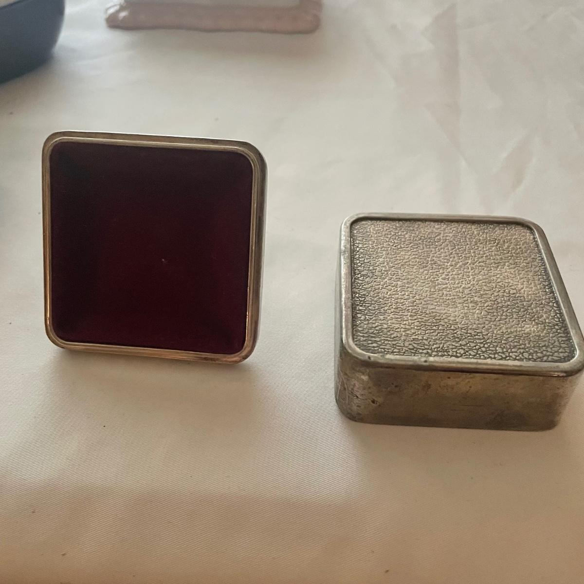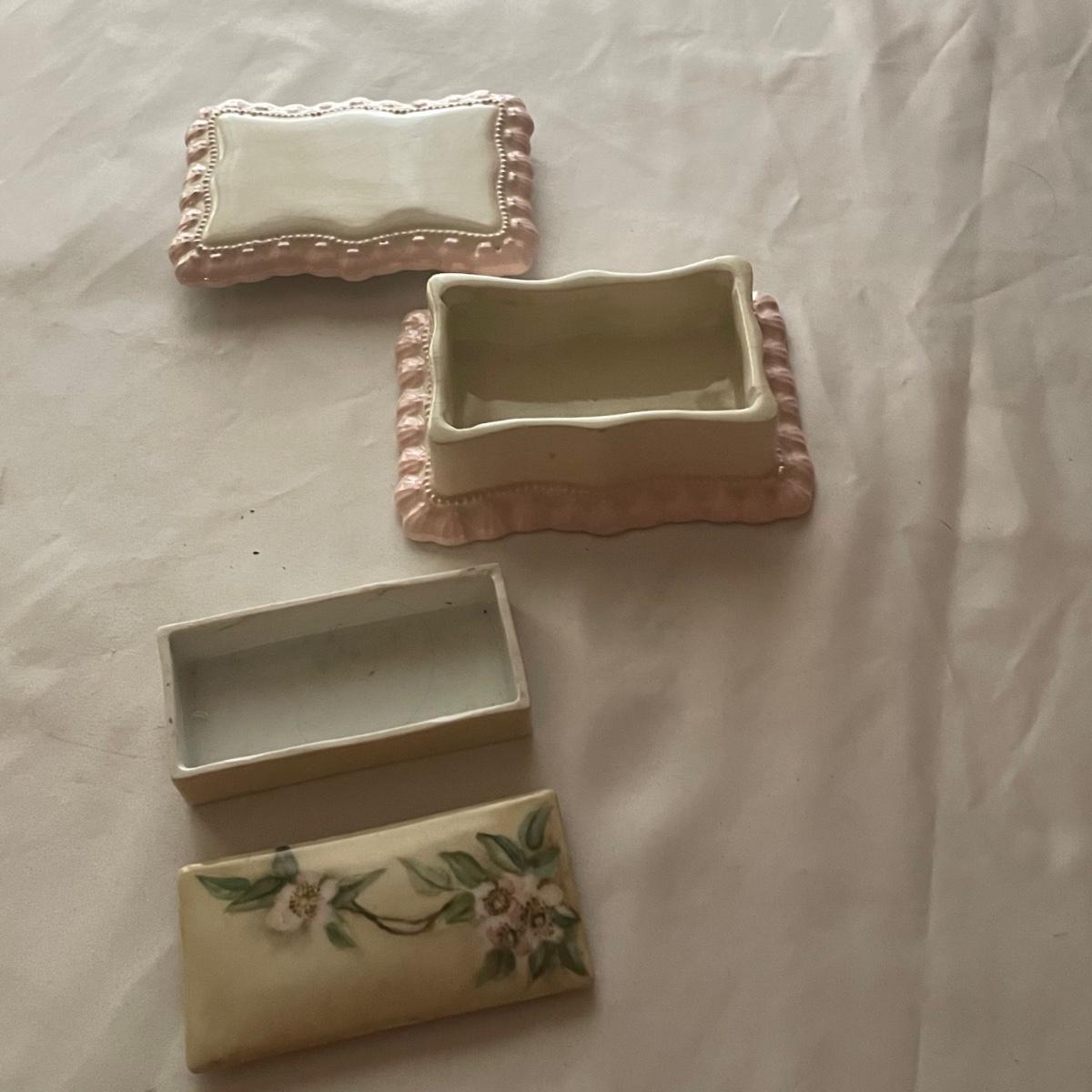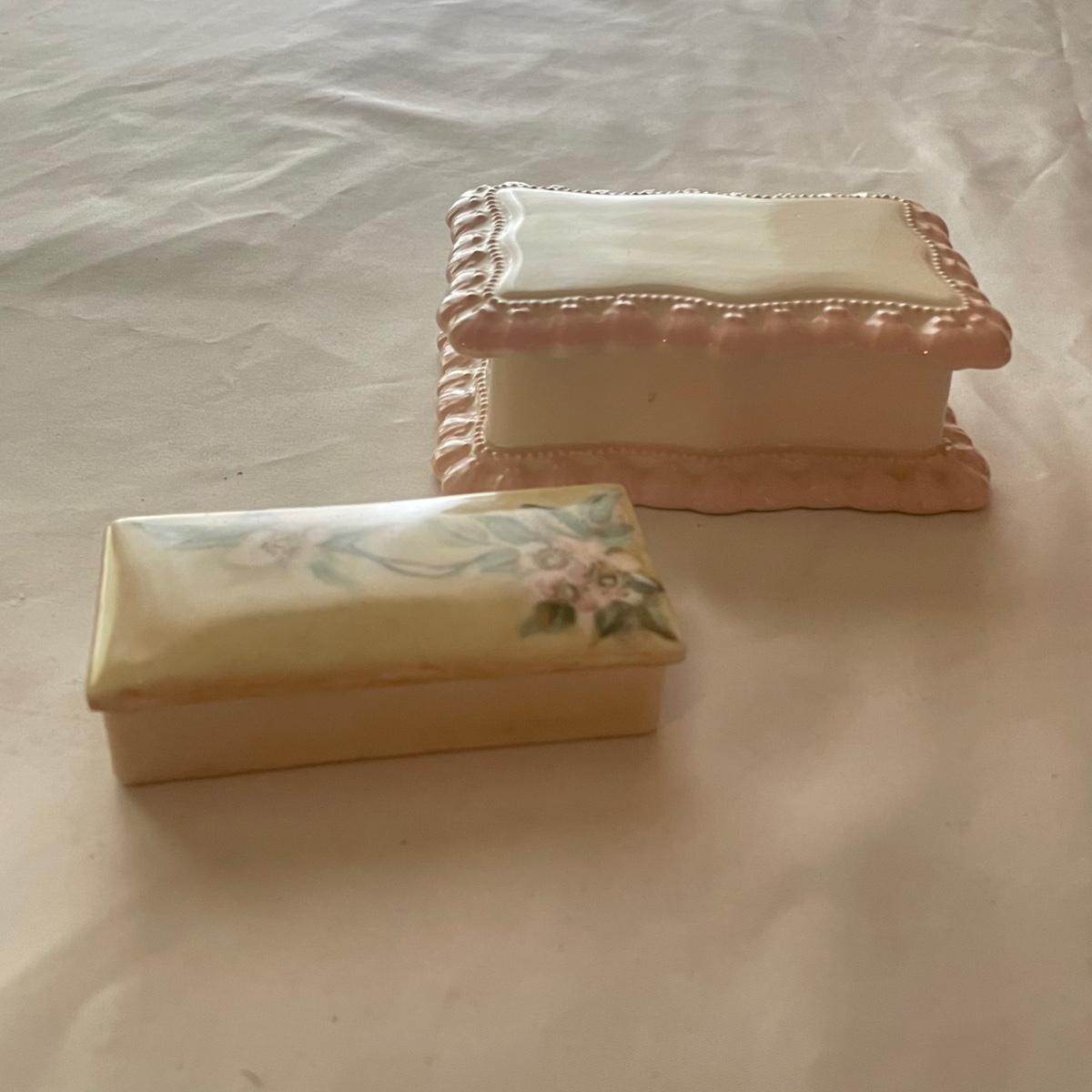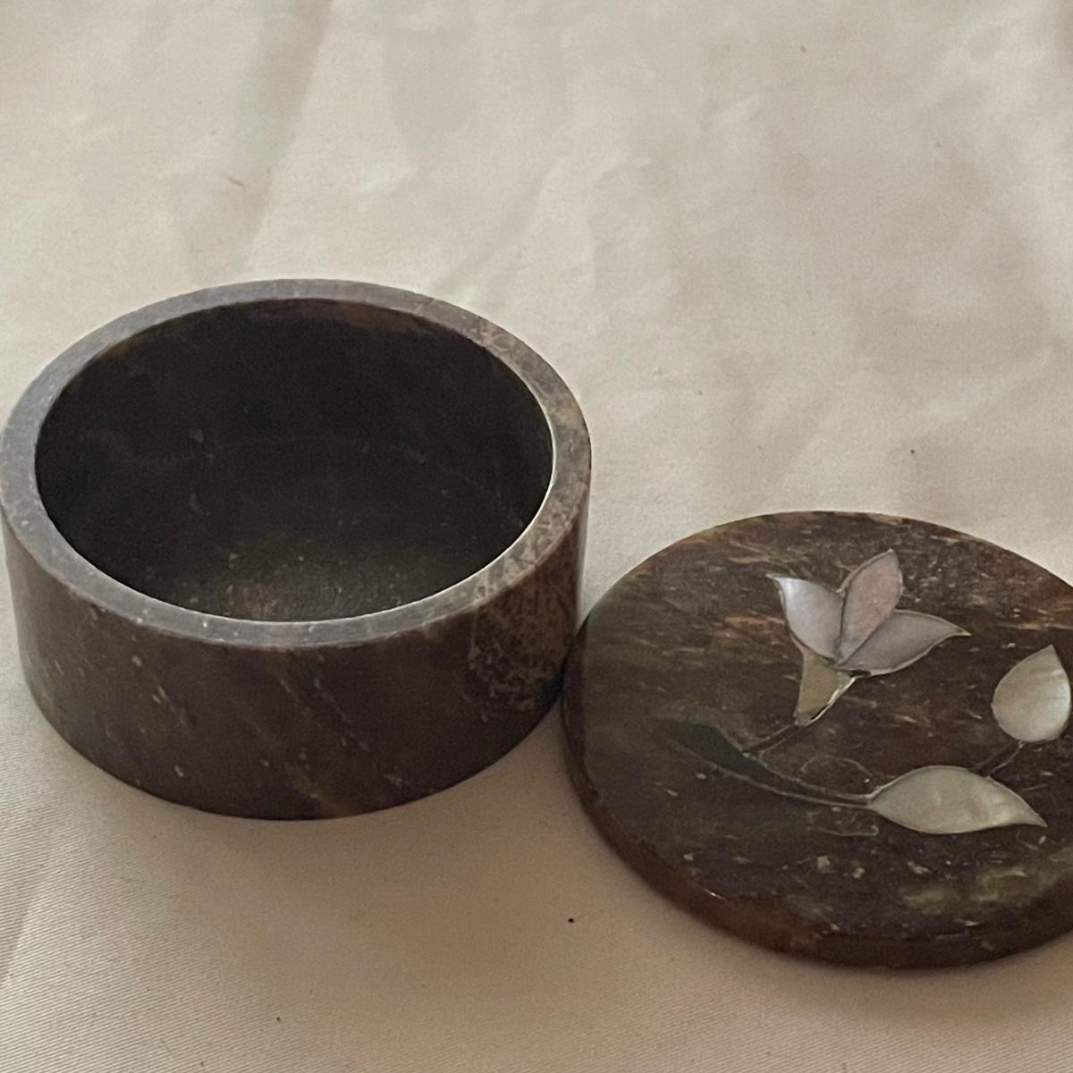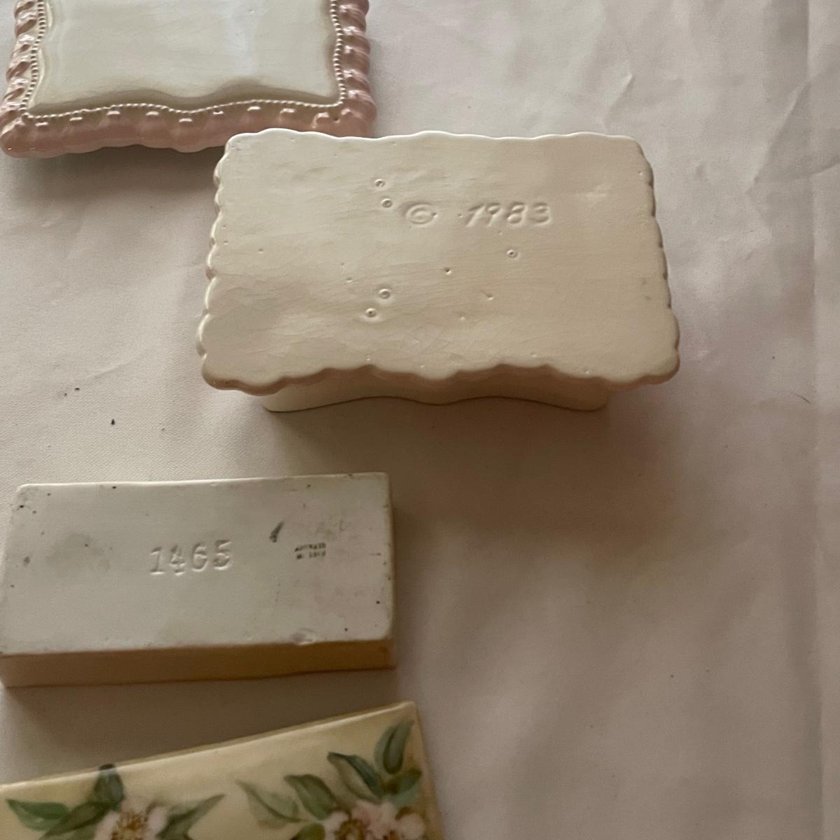 Seven trinket boxes total that includes porcelain, silver plated, a handmade stone like circular box with a Pearl like floral inlay.