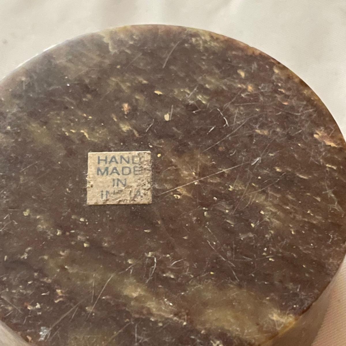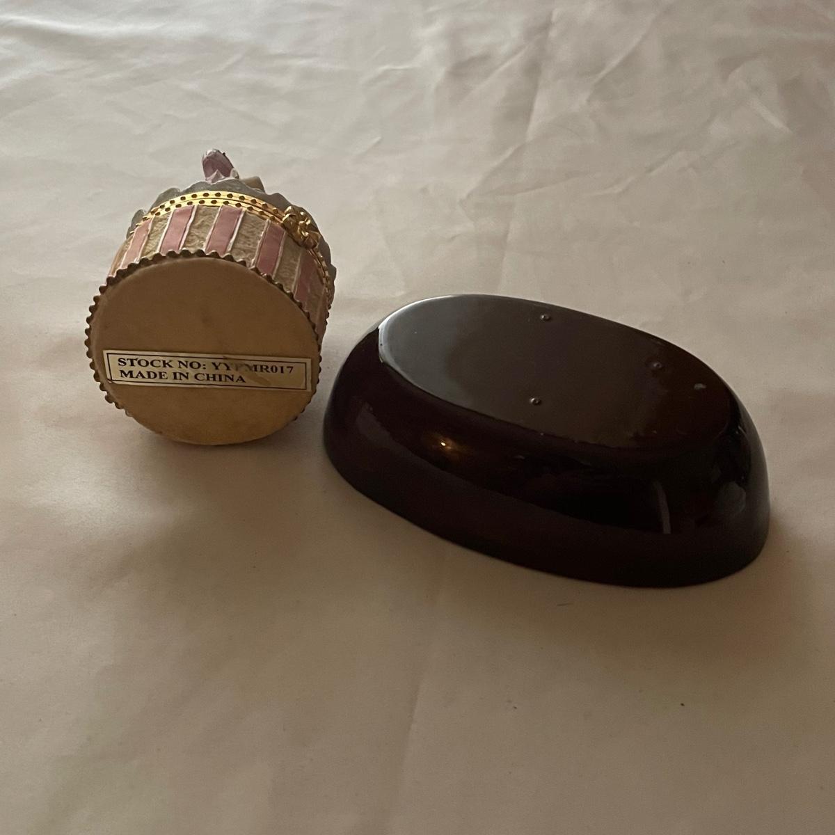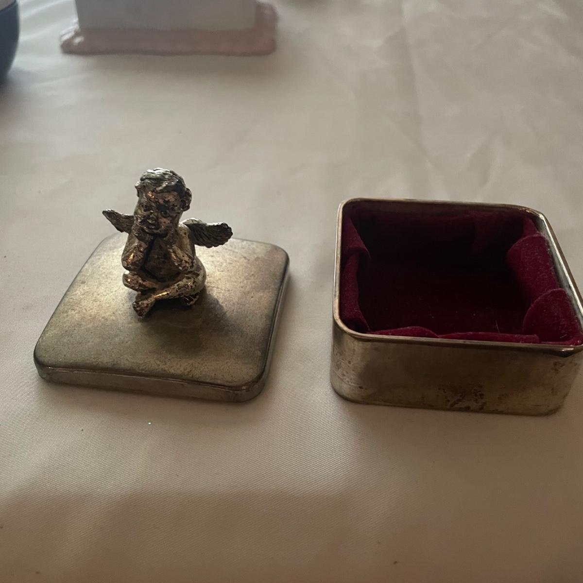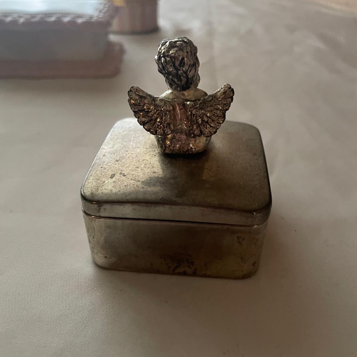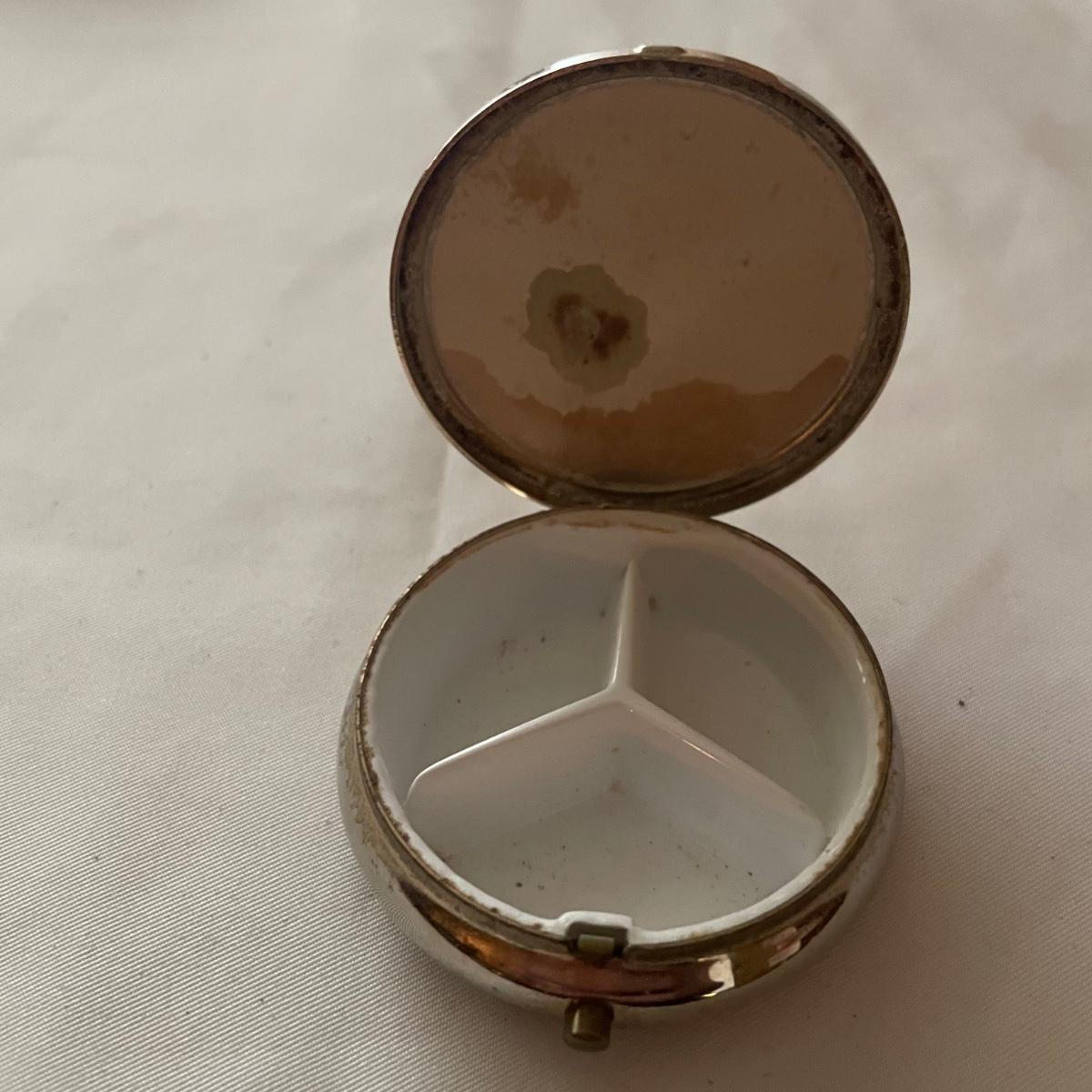 Seven trinket boxes total that includes porcelain, silver plated, a handmade stone like circular box with a Pearl like floral inlay.