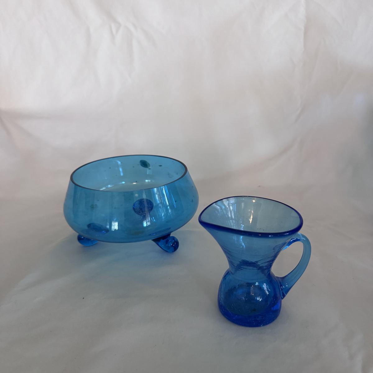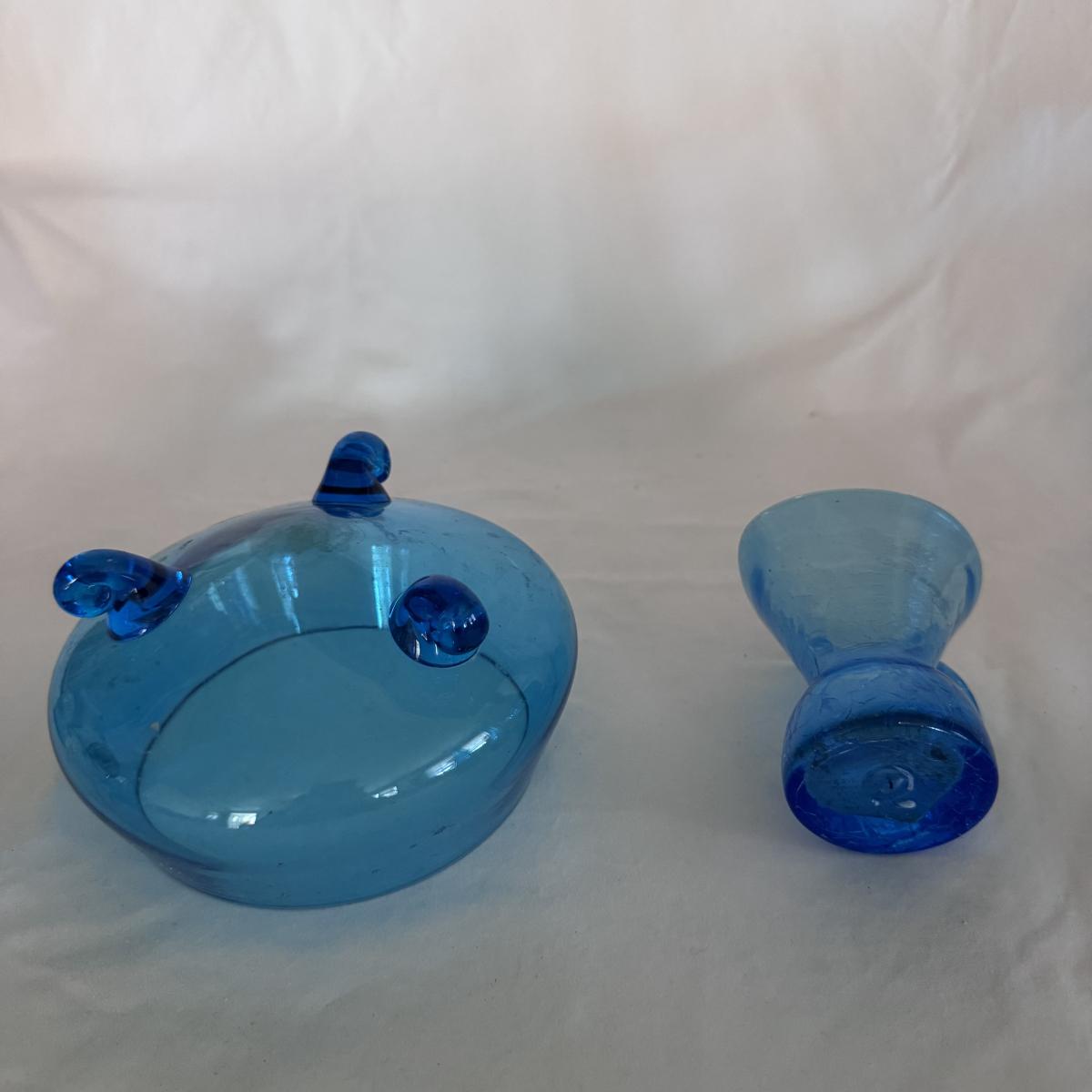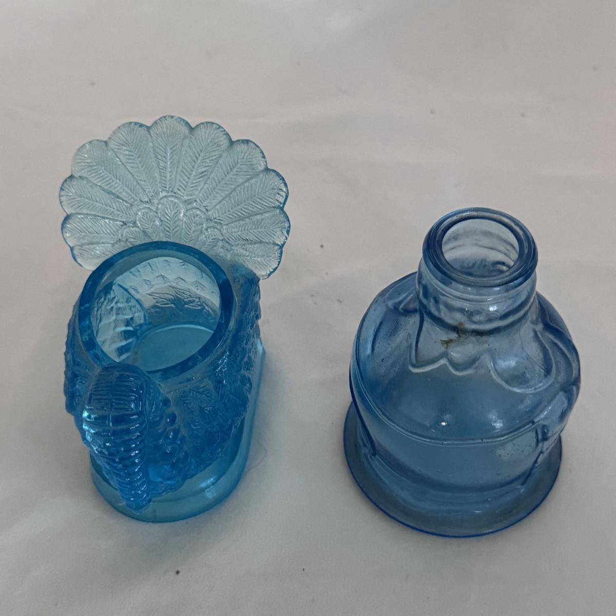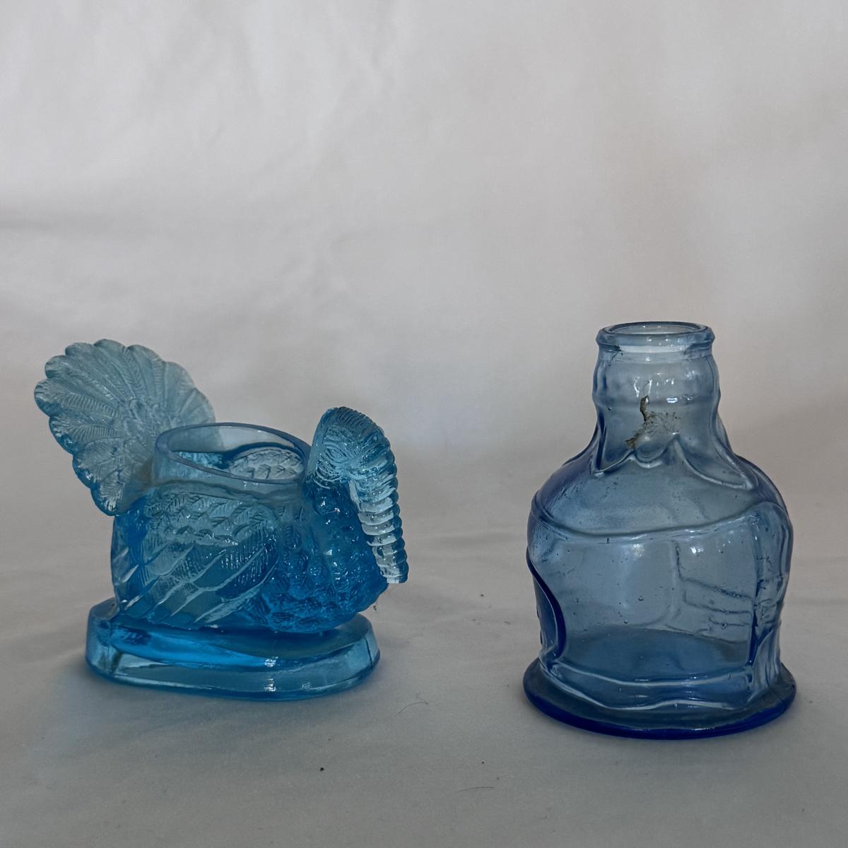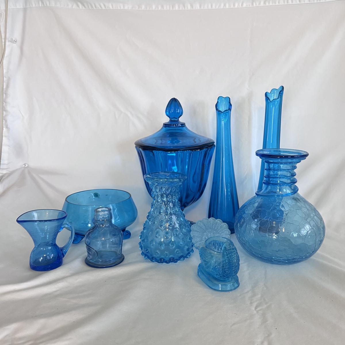 This lot includes nine pieces of turquoise glass. You’ll find two tall skinny vases with a ruffled rim, a turkey toothpick holder, Original Pocahontas mini bottle, candy dish with lid, and a mini crackle pitcher. You’ll also find a larger crackle glass vase, a hobnob vase, and a glass bowl with three feet. The largest item is the candy dish with lid that measures 7”D x 10”H. Shipping available. Shipping can be costly. We suggest contacting our preferred local shipping provider, Postage Express, with dimensions and getting an estimate before bidding: (828) 255-9250 or shipping@postageexpressnc.com.