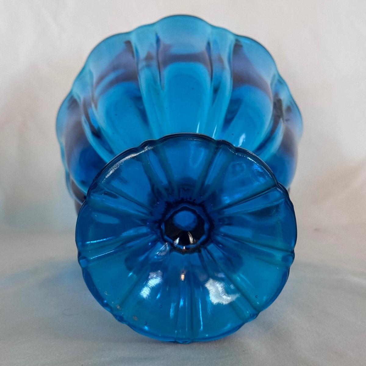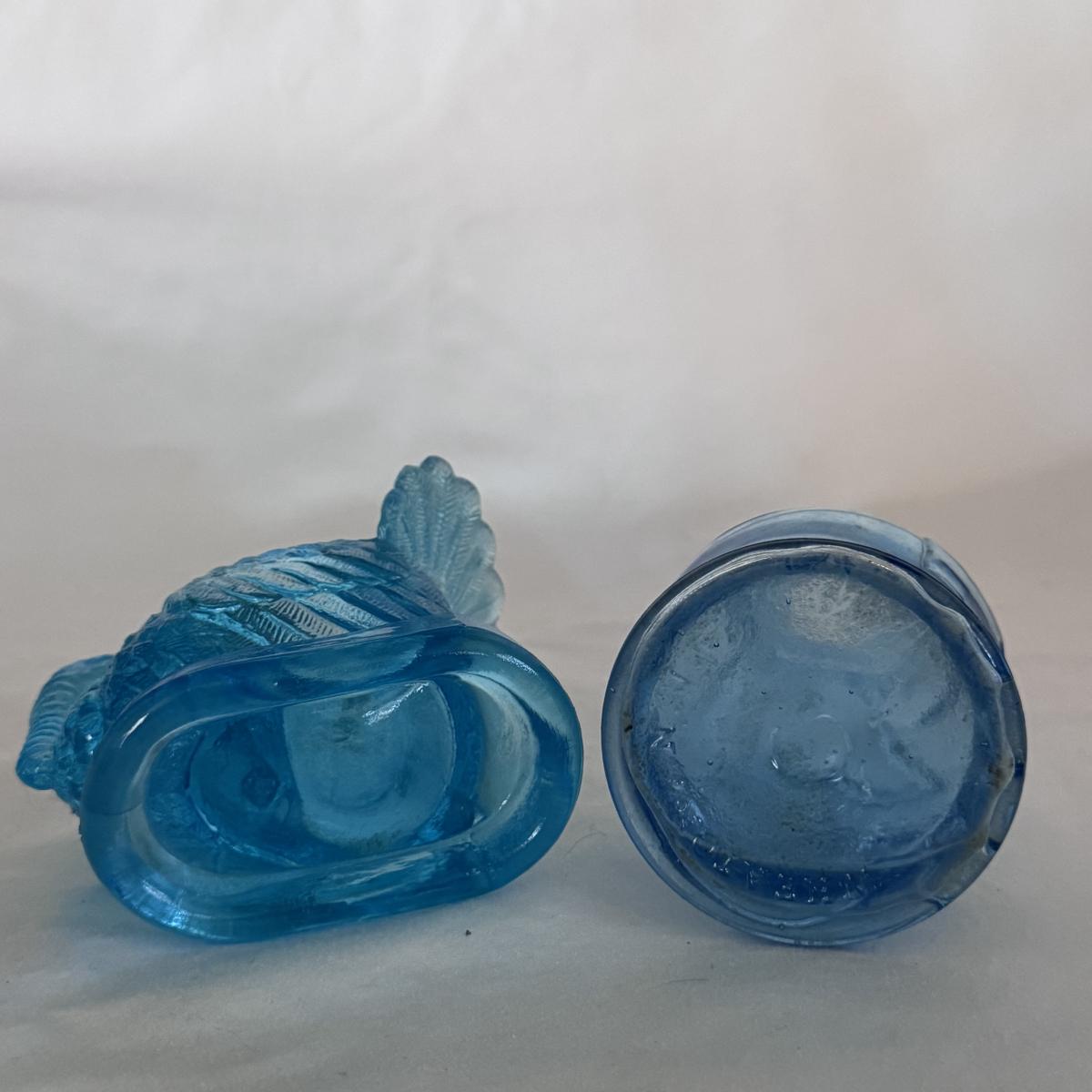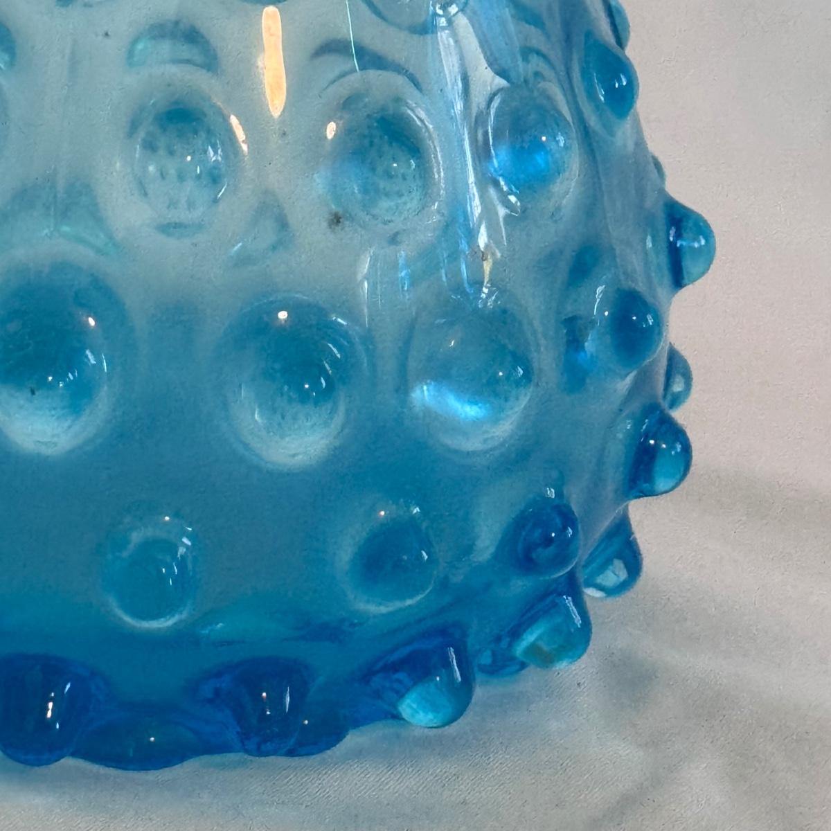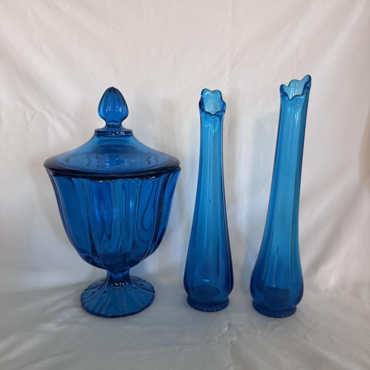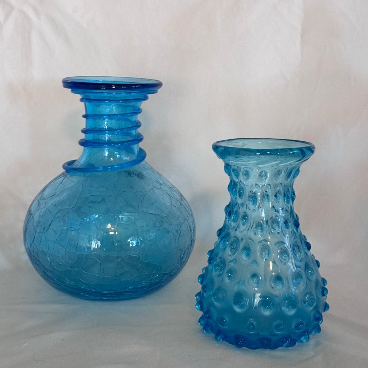 This lot includes nine pieces of turquoise glass. You’ll find two tall skinny vases with a ruffled rim, a turkey toothpick holder, Original Pocahontas mini bottle, candy dish with lid, and a mini crackle pitcher. You’ll also find a larger crackle glass vase, a hobnob vase, and a glass bowl with three feet. The largest item is the candy dish with lid that measures 7”D x 10”H. Shipping available. Shipping can be costly. We suggest contacting our preferred local shipping provider, Postage Express, with dimensions and getting an estimate before bidding: (828) 255-9250 or shipping@postageexpressnc.com.