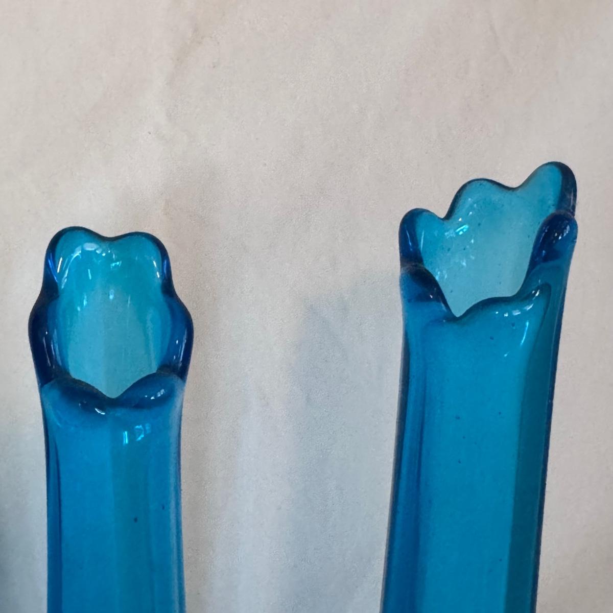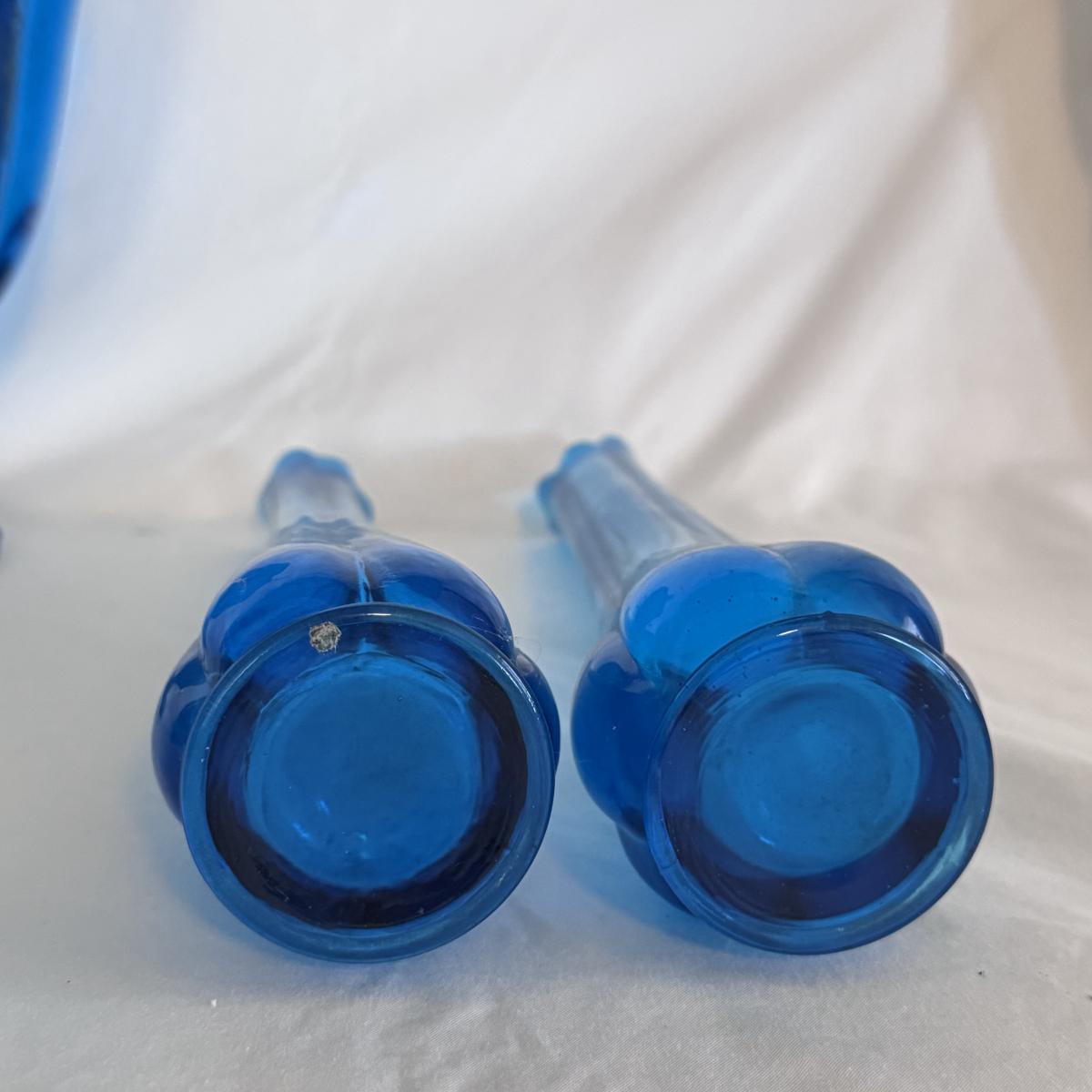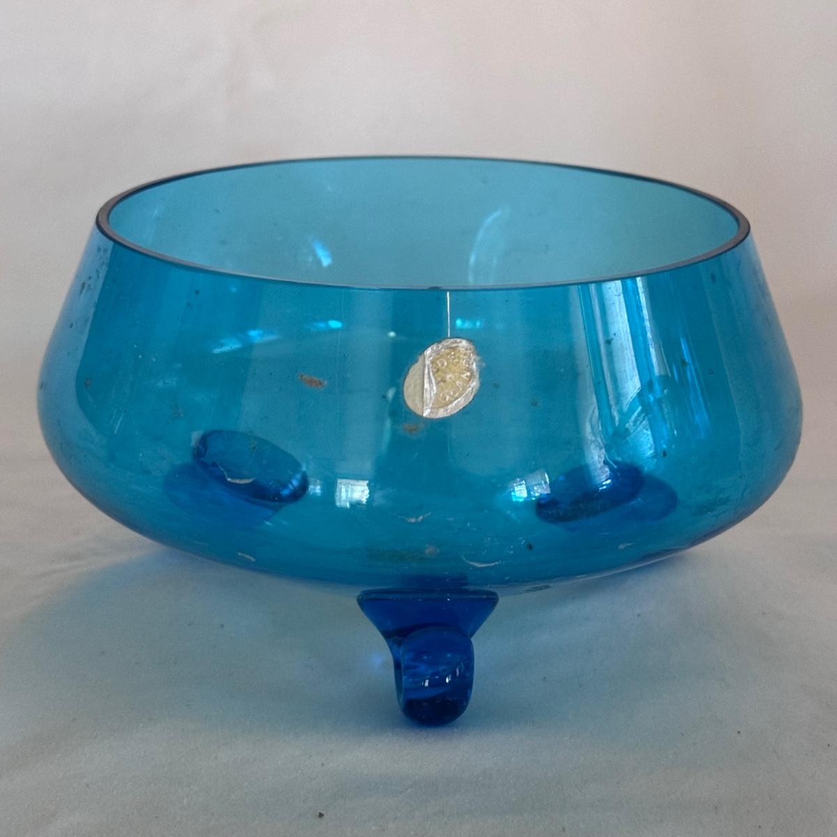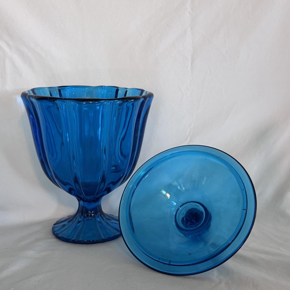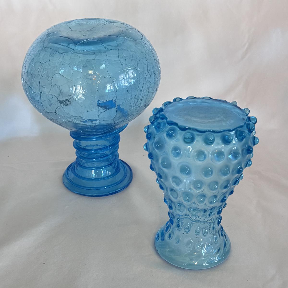 This lot includes nine pieces of turquoise glass. You’ll find two tall skinny vases with a ruffled rim, a turkey toothpick holder, Original Pocahontas mini bottle, candy dish with lid, and a mini crackle pitcher. You’ll also find a larger crackle glass vase, a hobnob vase, and a glass bowl with three feet. The largest item is the candy dish with lid that measures 7”D x 10”H. Shipping available. Shipping can be costly. We suggest contacting our preferred local shipping provider, Postage Express, with dimensions and getting an estimate before bidding: (828) 255-9250 or shipping@postageexpressnc.com.