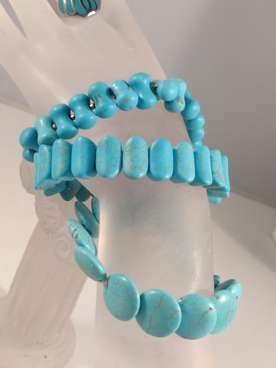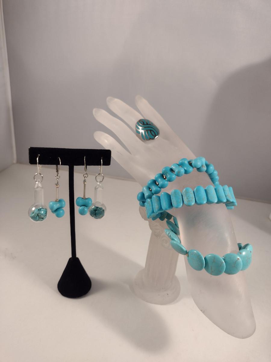 Collection of Turquoise Jewelry- Bracelets and Earrings (#5). Ring shown in pictures is enamel, not stone, and measures approx size 7 1/2.