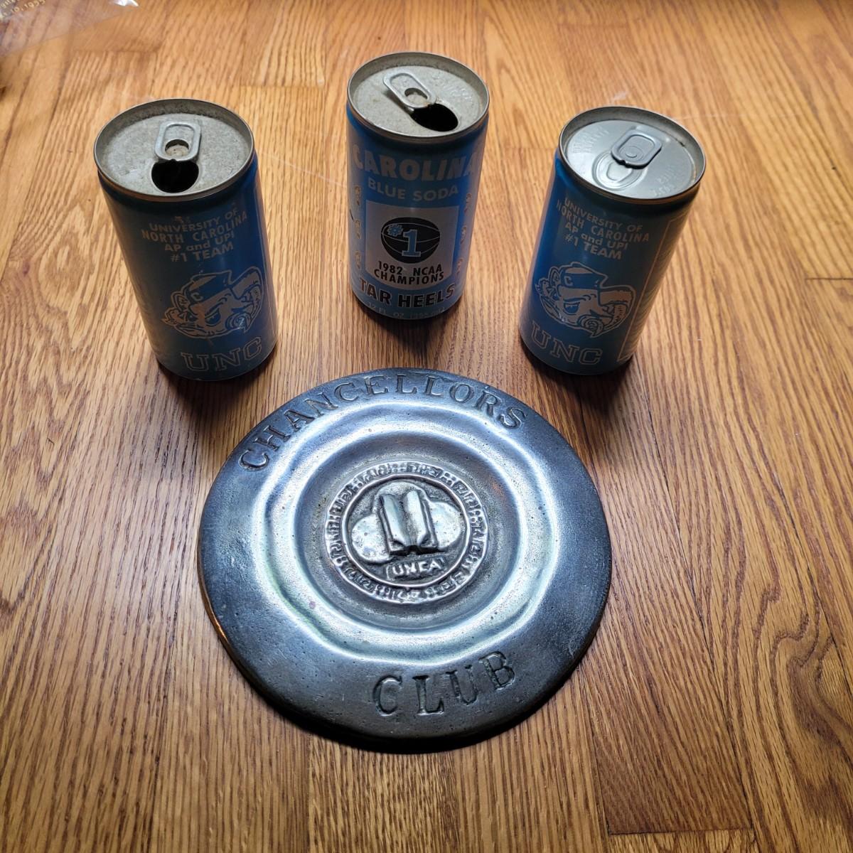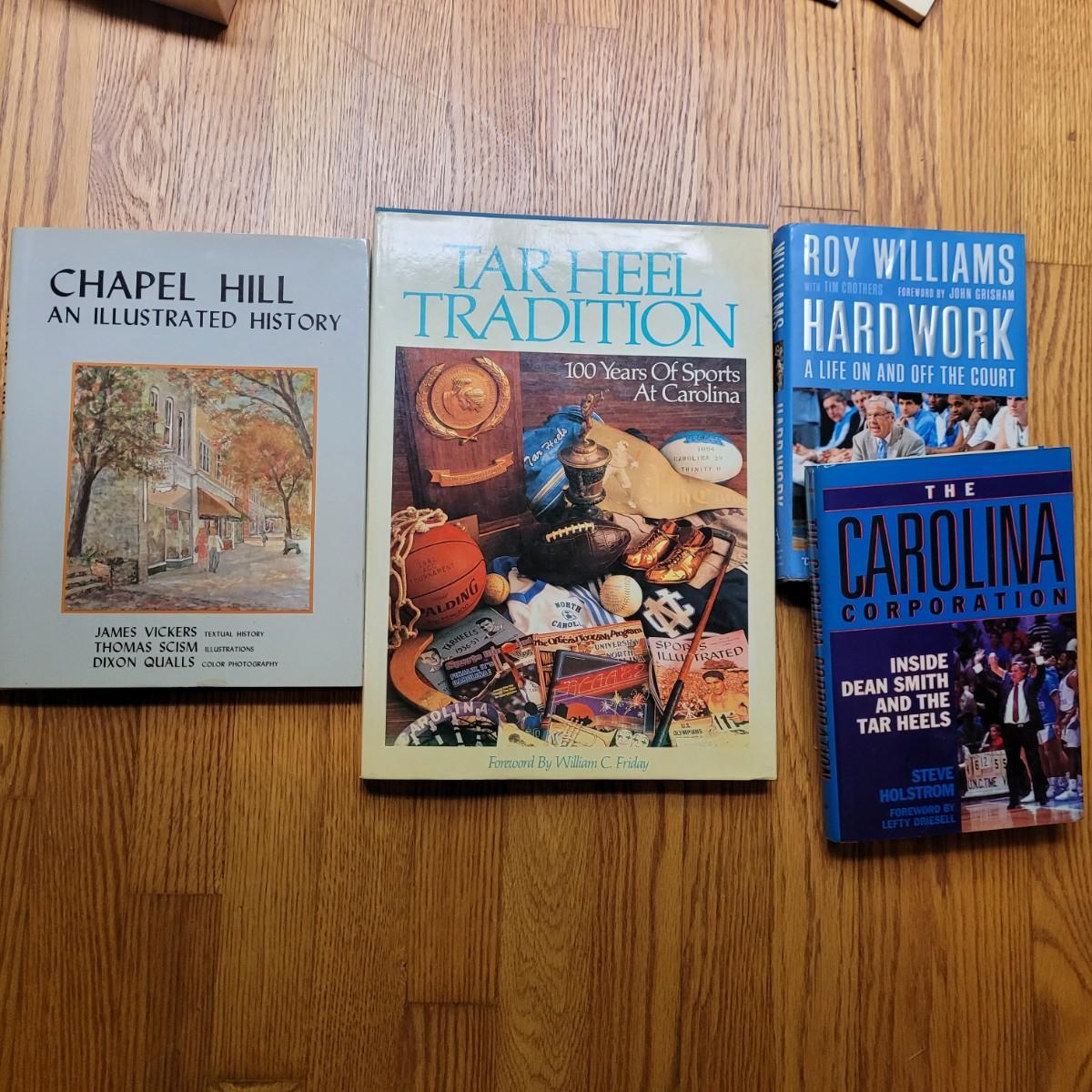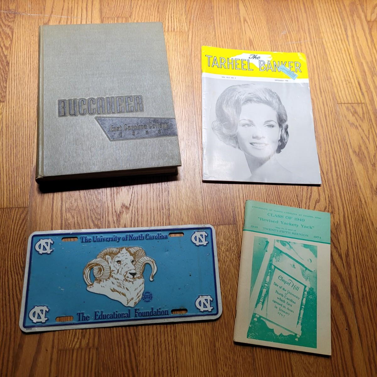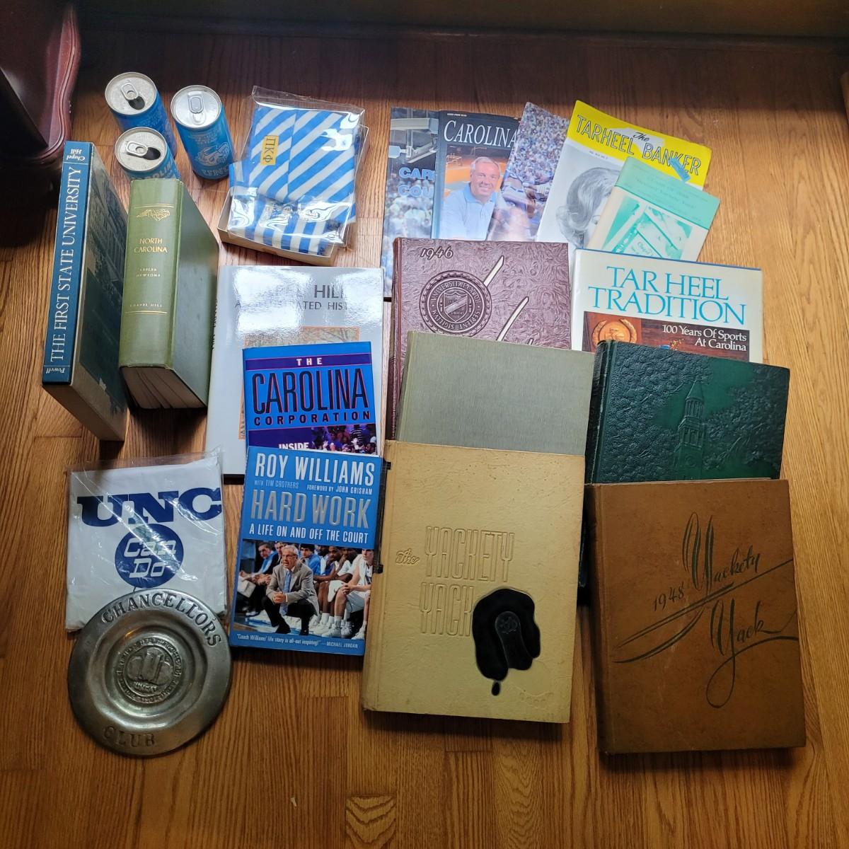 Collection of UNC Tarheel memorabilia and books, including four Yakckety Yack yearbooks from 1946-49. Other book items include an East Carolina College 1956 yearbook, a NC history book, pictorial history book of UNC, Tar Heel sports coffee table book, sports magazines, and biographies of notable basketball coaches Dean Smith and Roy Williams. Other miscellaneous items include a Greek life costume, poncho, license plate, Chancellor's Club metal plaque, and three 1982 championship soda cans (one unopened). Shipping available.