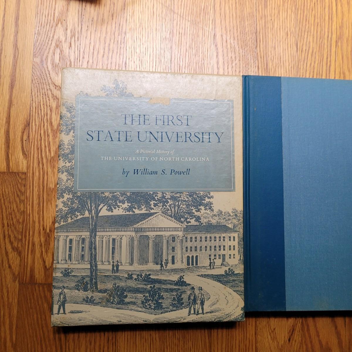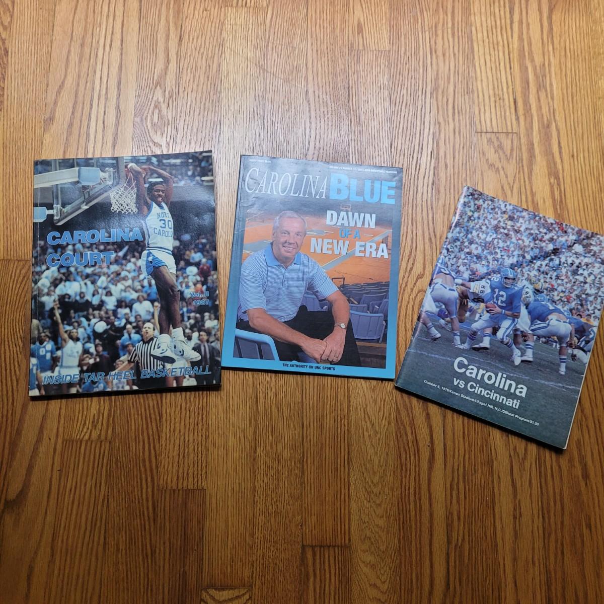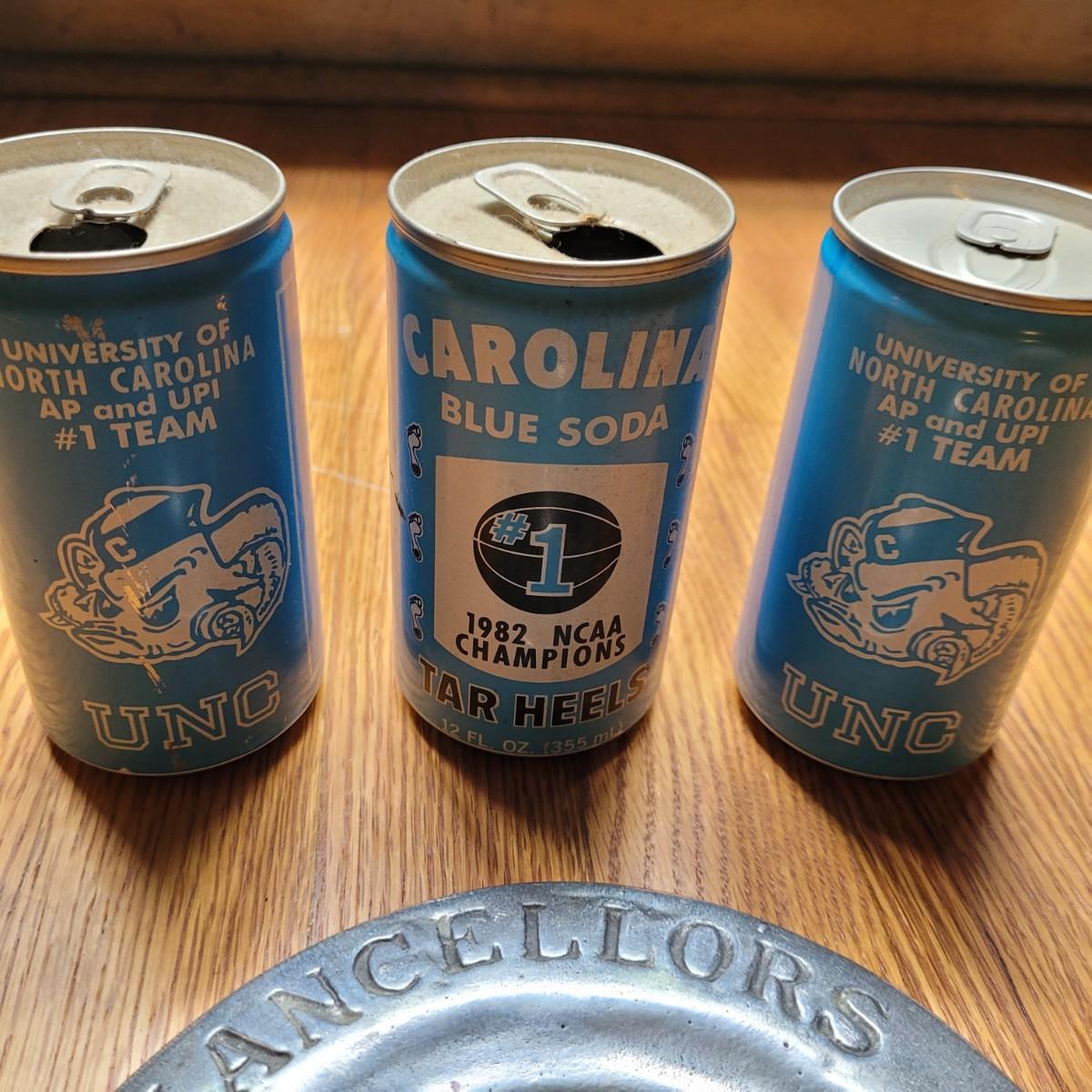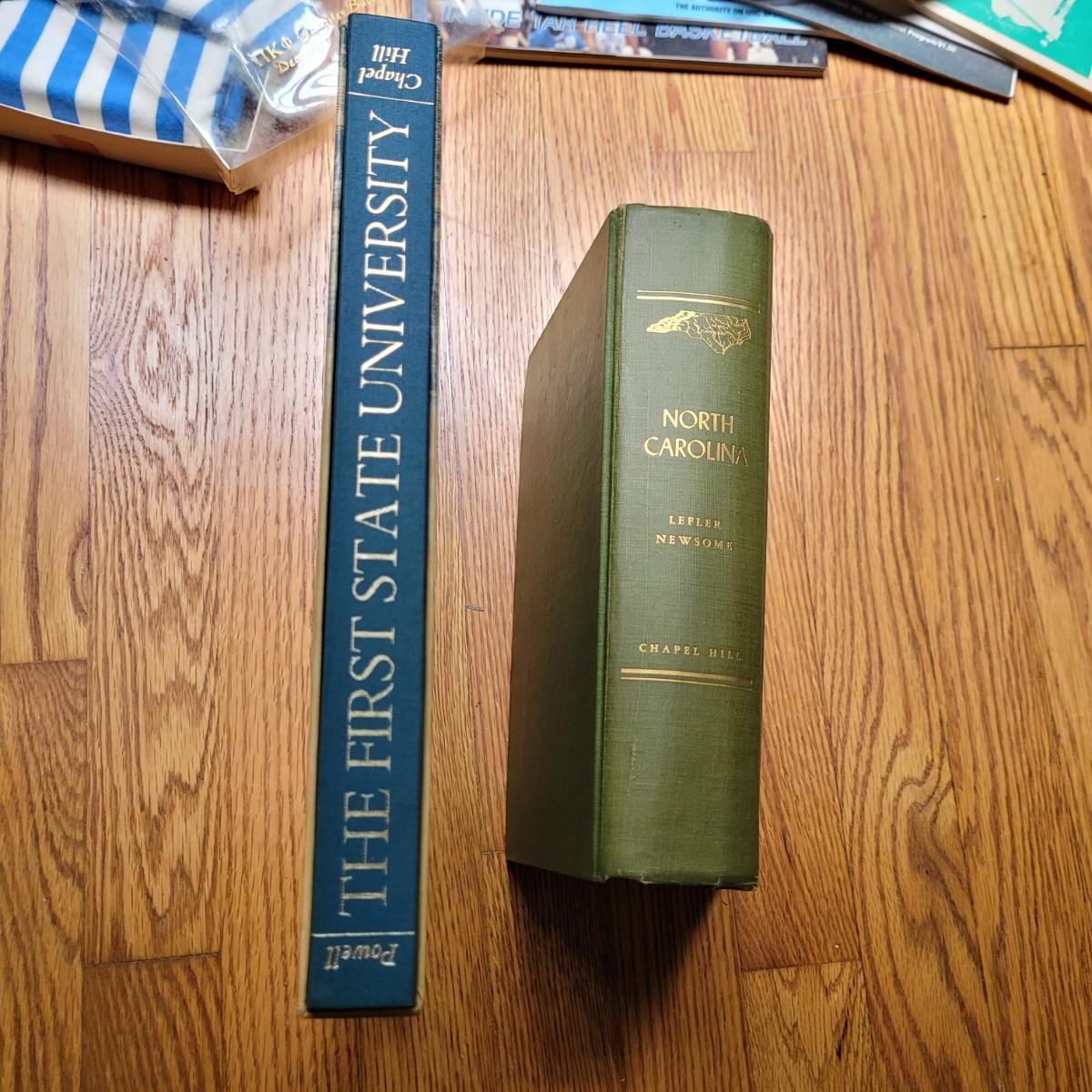 Collection of UNC Tarheel memorabilia and books, including four Yakckety Yack yearbooks from 1946-49. Other book items include an East Carolina College 1956 yearbook, a NC history book, pictorial history book of UNC, Tar Heel sports coffee table book, sports magazines, and biographies of notable basketball coaches Dean Smith and Roy Williams. Other miscellaneous items include a Greek life costume, poncho, license plate, Chancellor's Club metal plaque, and three 1982 championship soda cans (one unopened). Shipping available.