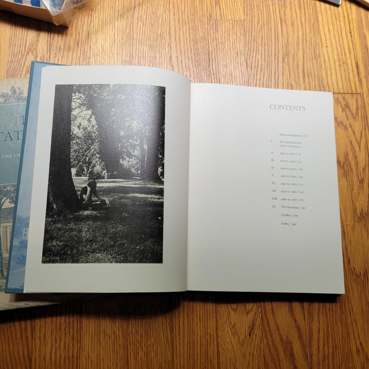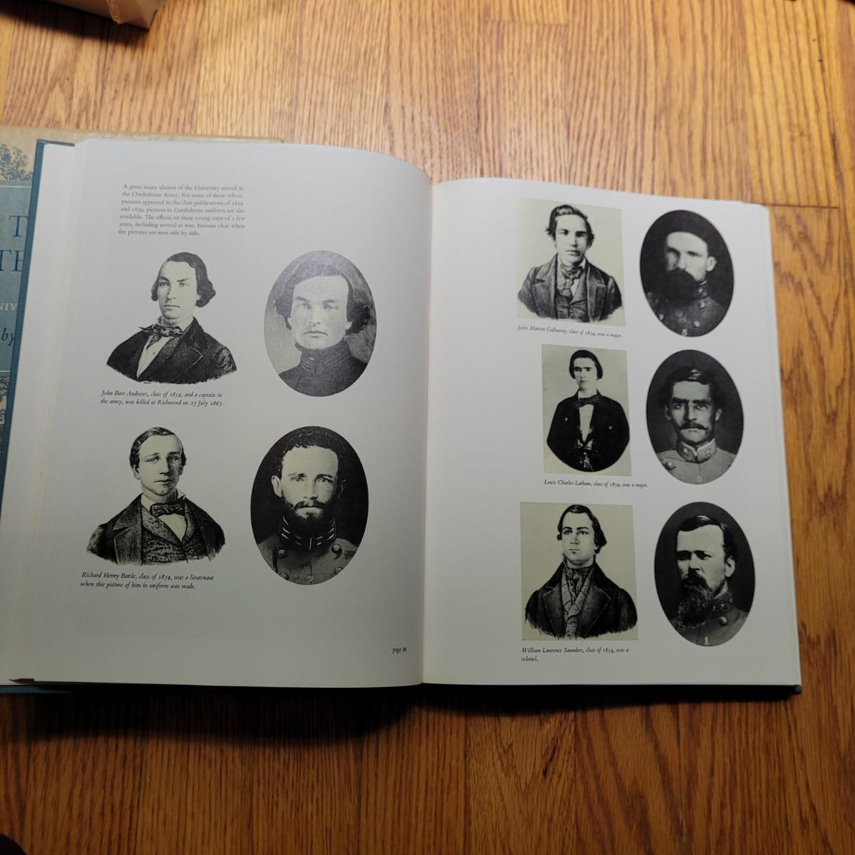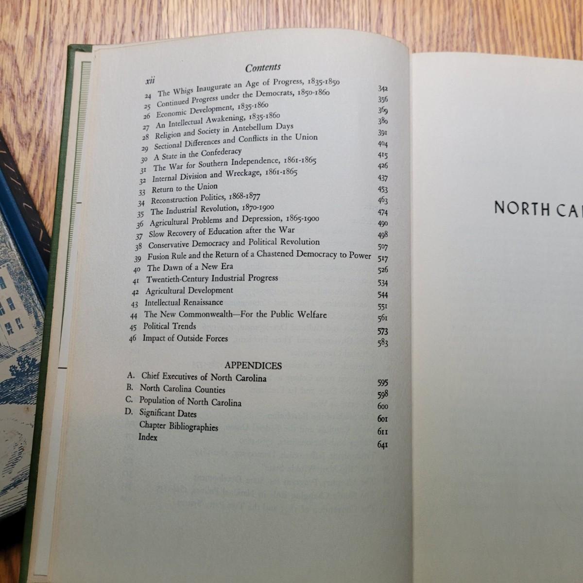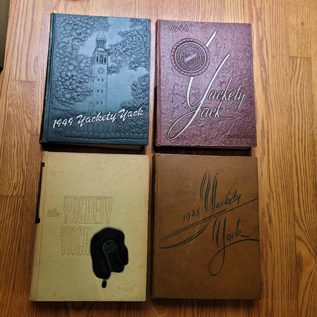 Collection of UNC Tarheel memorabilia and books, including four Yakckety Yack yearbooks from 1946-49. Other book items include an East Carolina College 1956 yearbook, a NC history book, pictorial history book of UNC, Tar Heel sports coffee table book, sports magazines, and biographies of notable basketball coaches Dean Smith and Roy Williams. Other miscellaneous items include a Greek life costume, poncho, license plate, Chancellor's Club metal plaque, and three 1982 championship soda cans (one unopened). Shipping available.