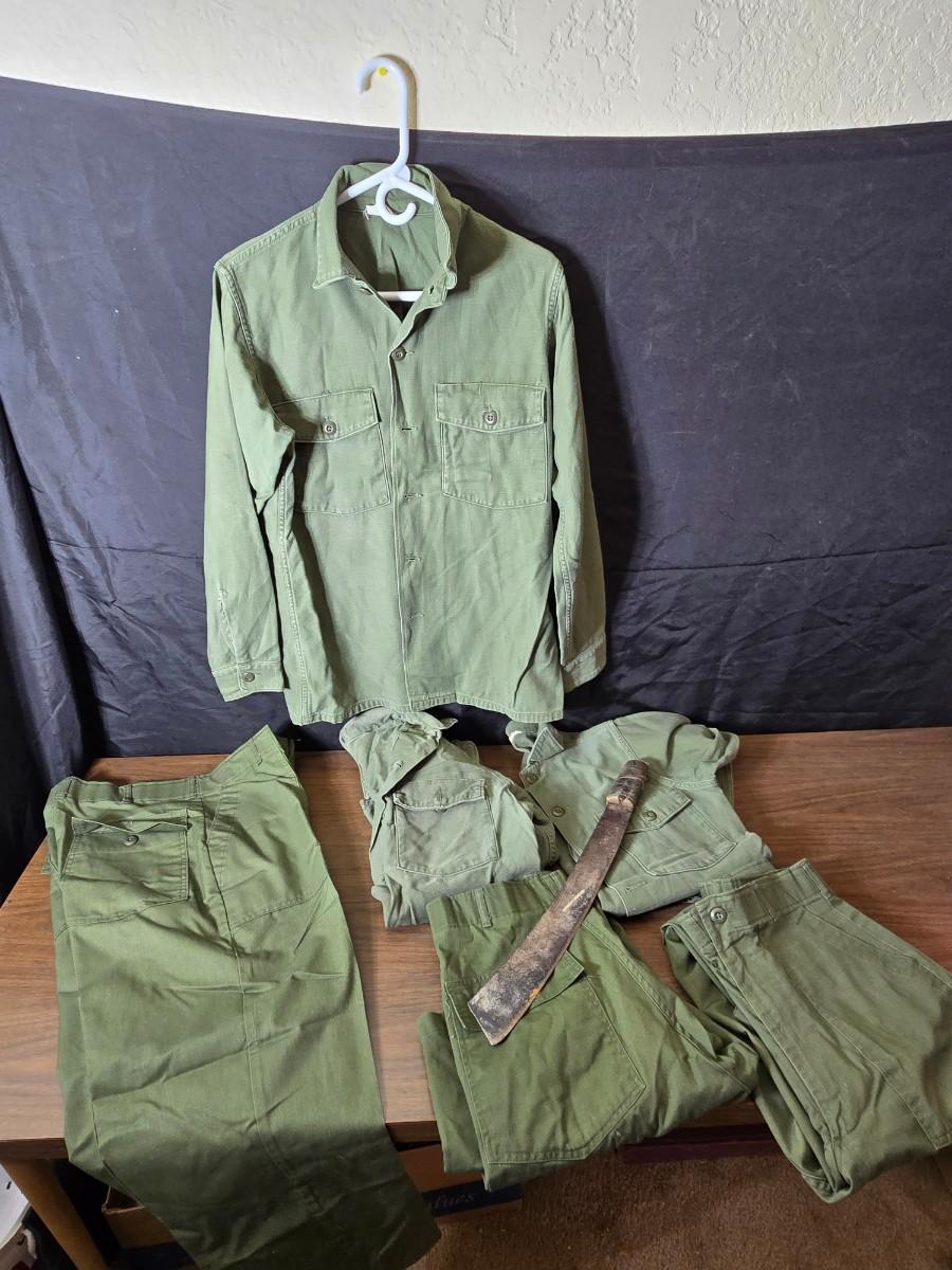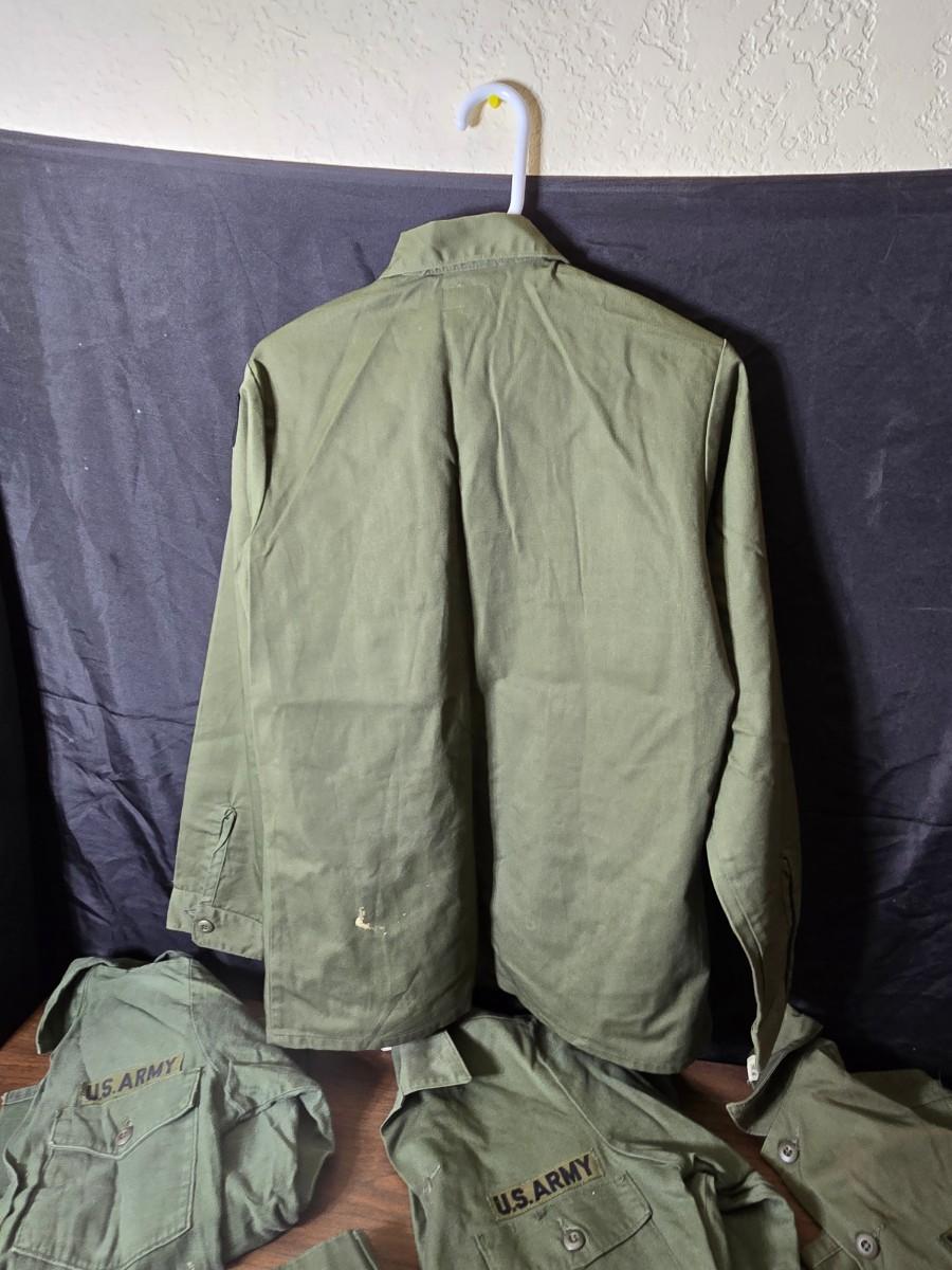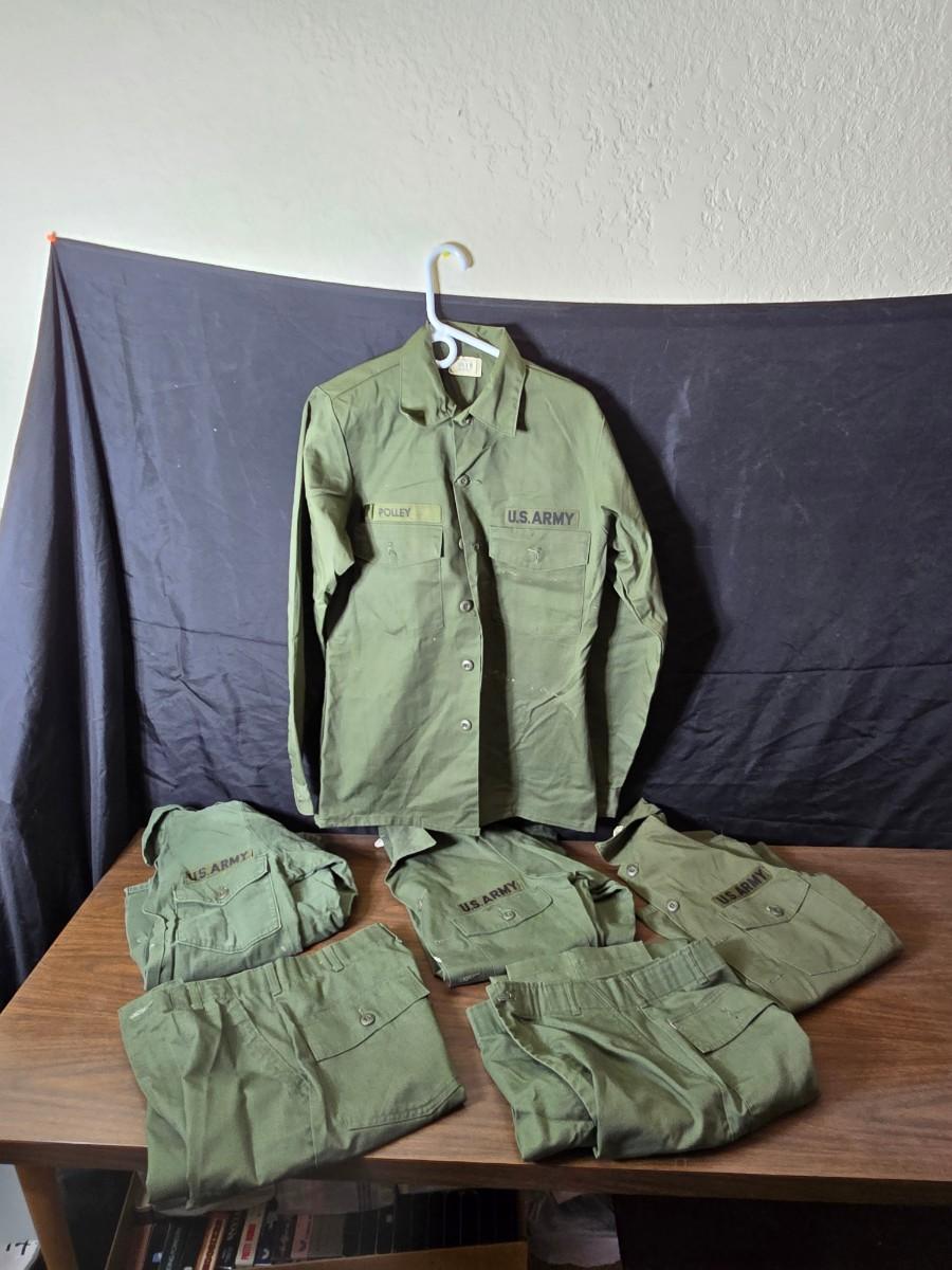 Collection of US Army OG-107 or OG-507 utility uniforms, including shirts and trousers. - See photos for size