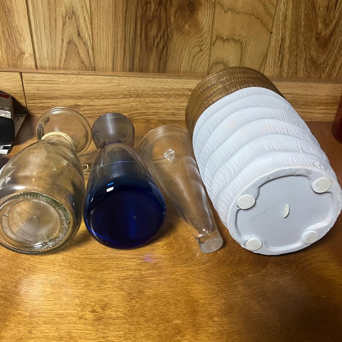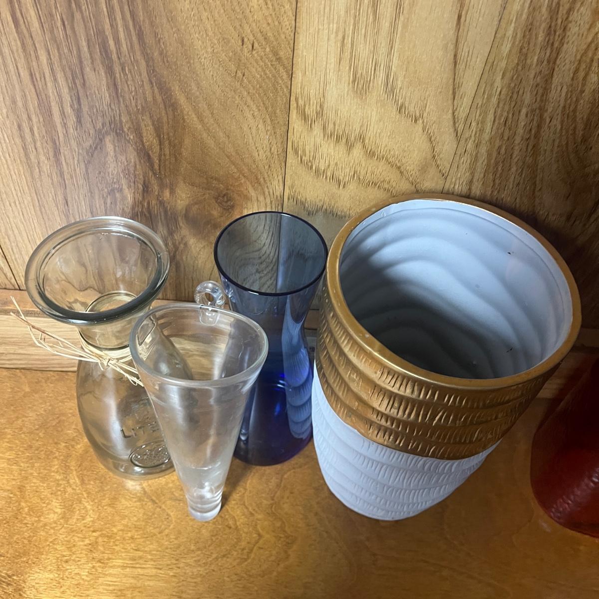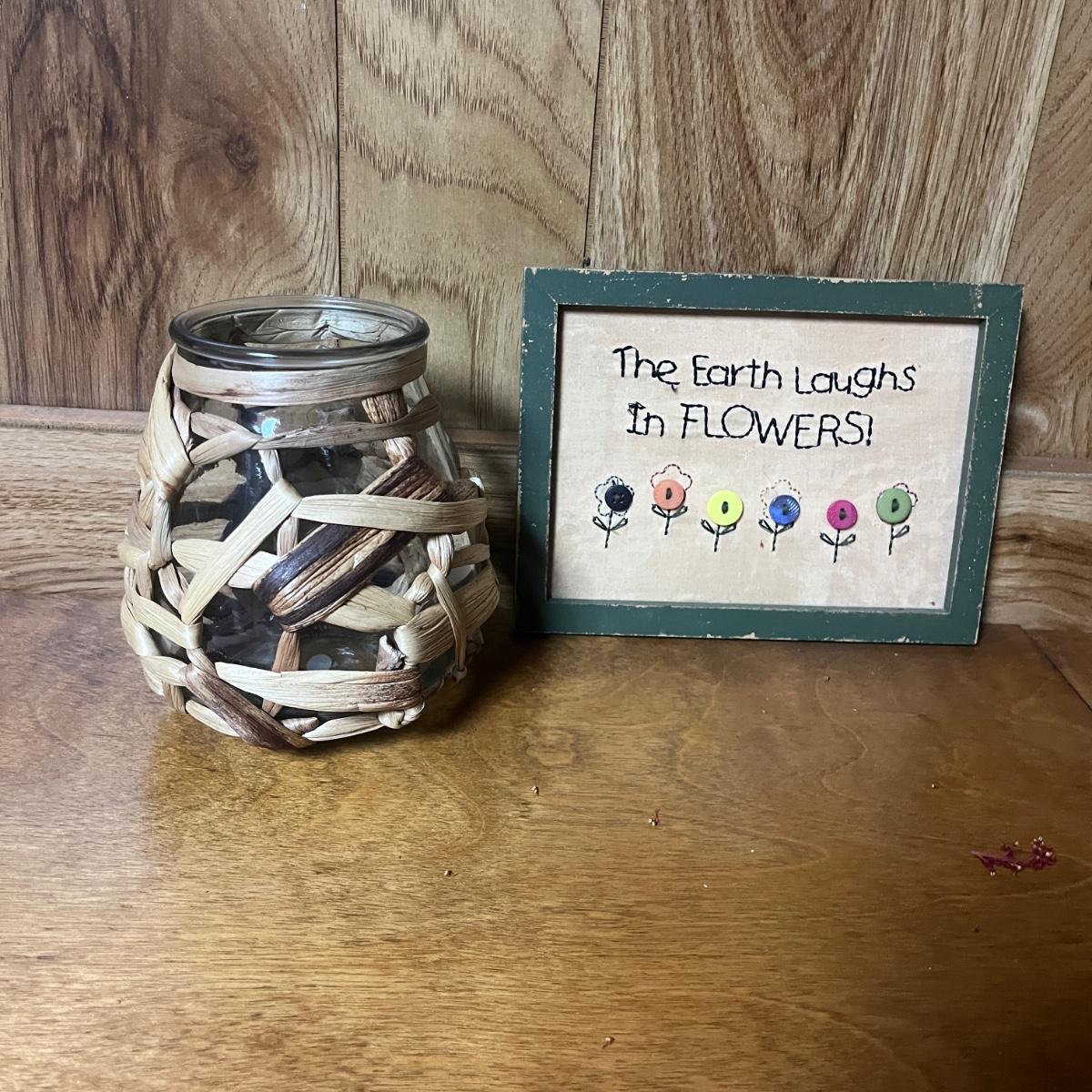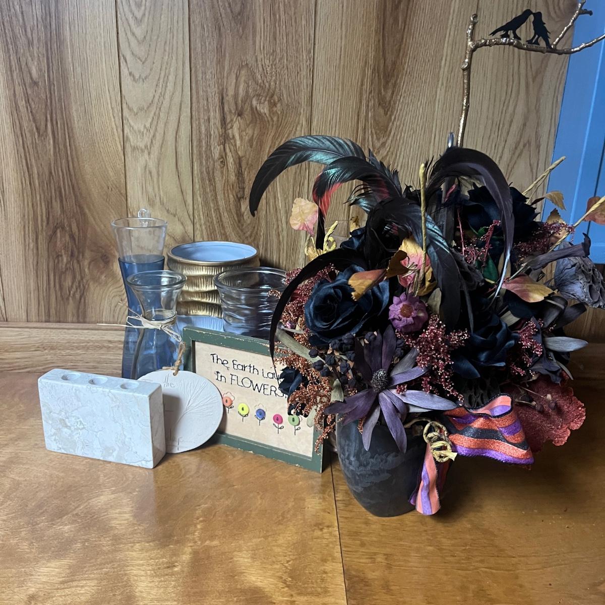 Lot includes eight glass vases in a variety of sizes and colors, one ceramic vase, a stone three bud vase, pottery sign, dried flowers in a vase and a wooden framed sign. Dried flowers measure 15” x 12” x 22”H.