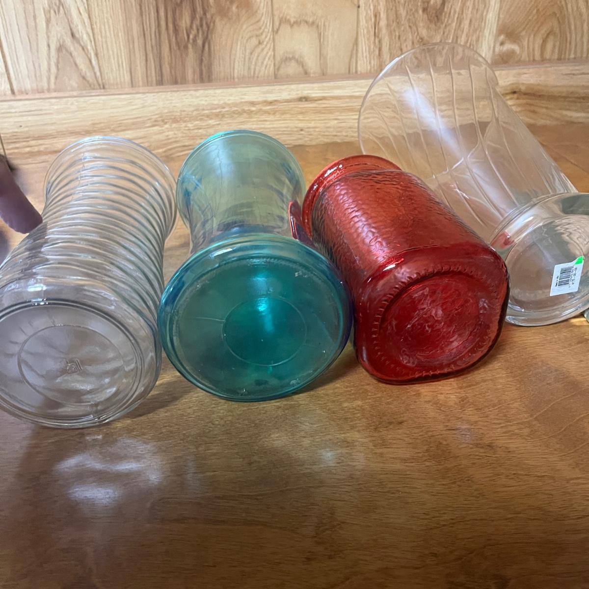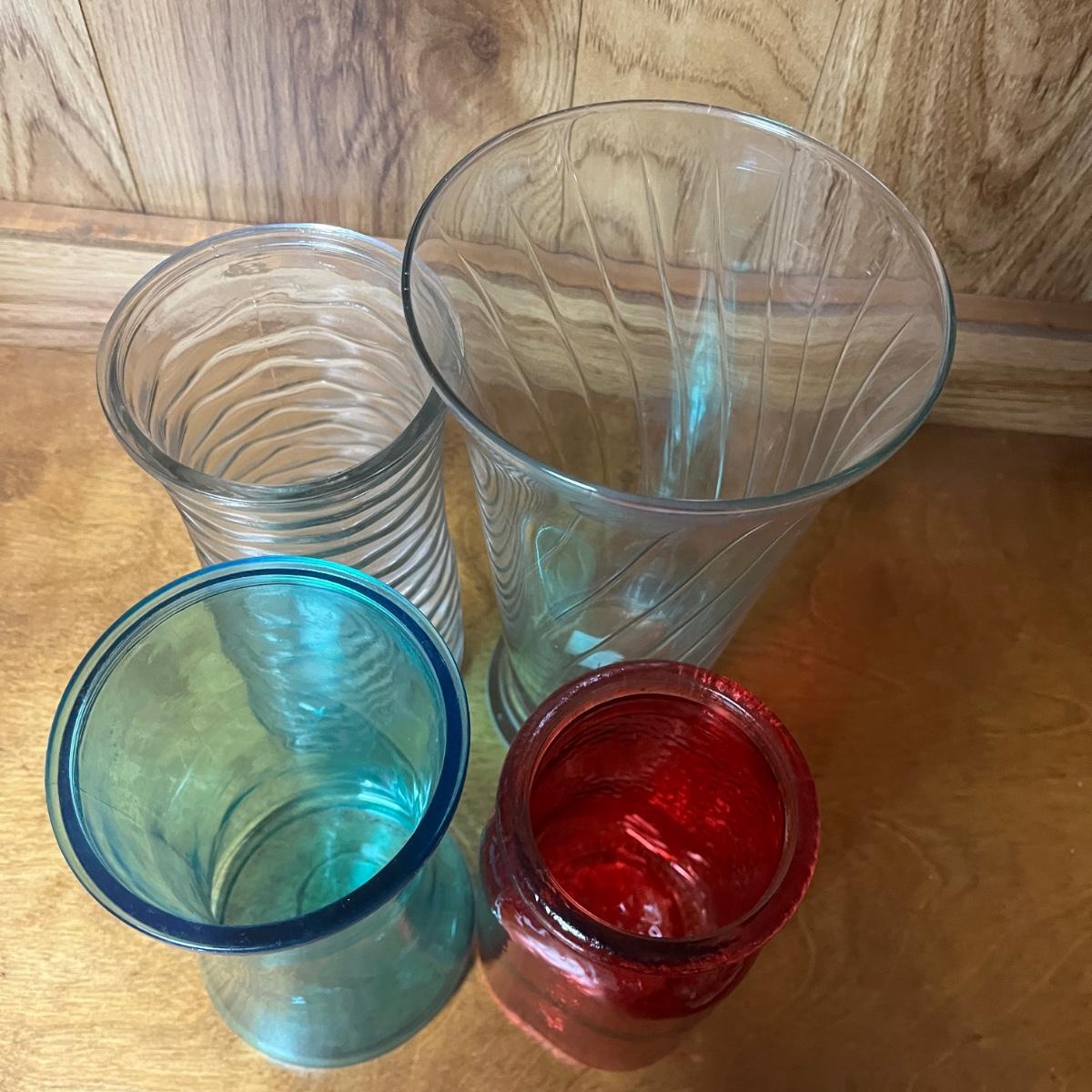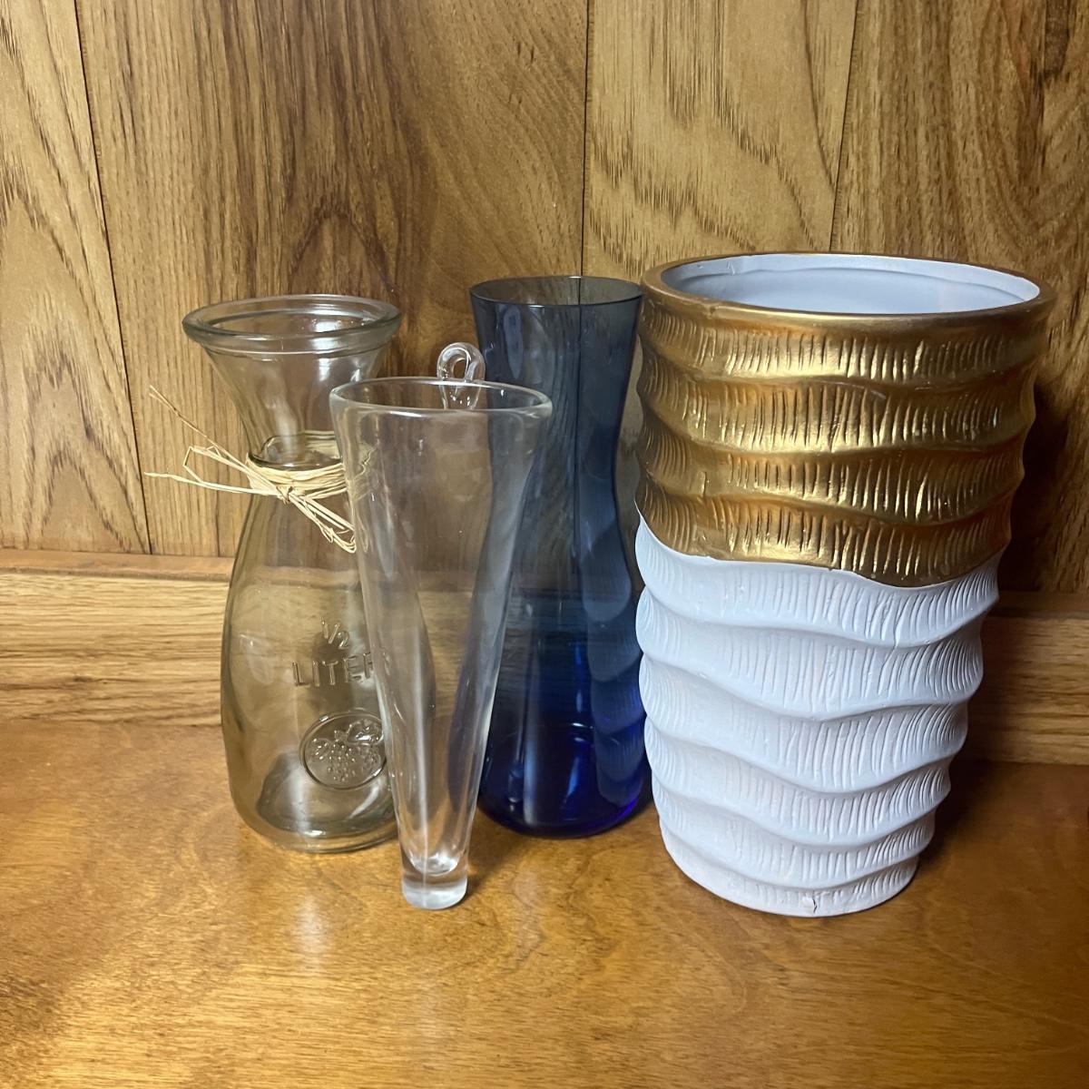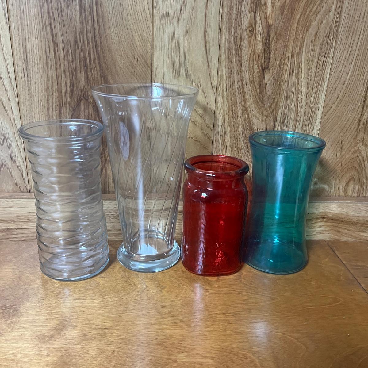 Lot includes eight glass vases in a variety of sizes and colors, one ceramic vase, a stone three bud vase, pottery sign, dried flowers in a vase and a wooden framed sign. Dried flowers measure 15” x 12” x 22”H.