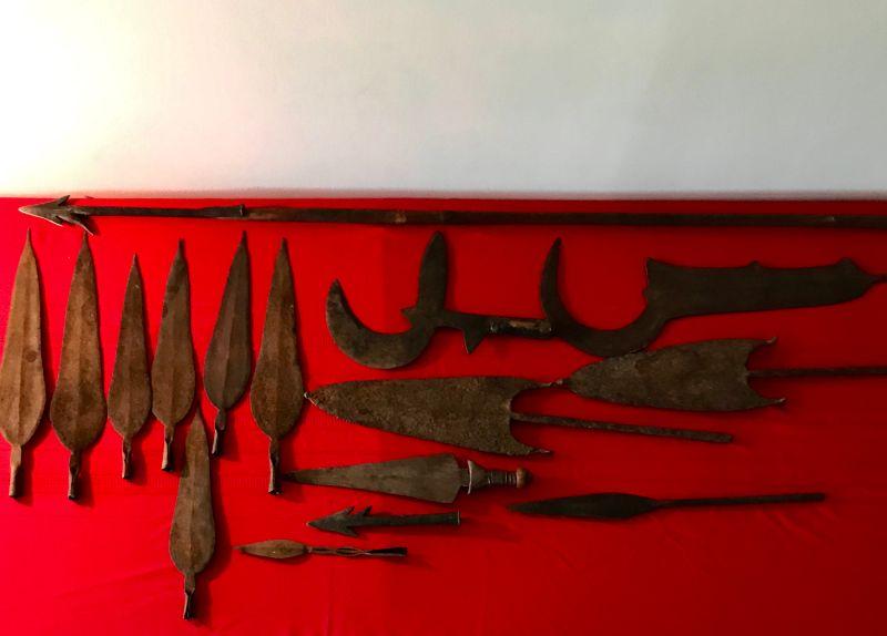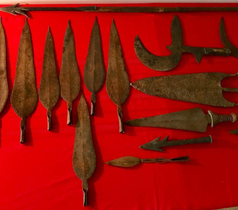 Includes 13 spear heads of various sizes, 1 spear shaft (65 inches long), 1 knife and two blades.