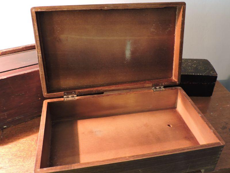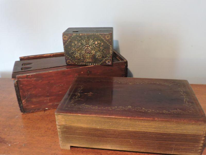 Collection of 3 vintage/antique wooden boxes. **Please read Terms and Conditions before placing a bid. Pick up is Sunday, November 24 from 9am to 3pm or Tuesday, November 26 from 4pm-7pm in Mantua, NJ. All sales are final. All sales are as is, where is. Please review all photos. Any props included in photos are not included in listing. All measurements are approximate.